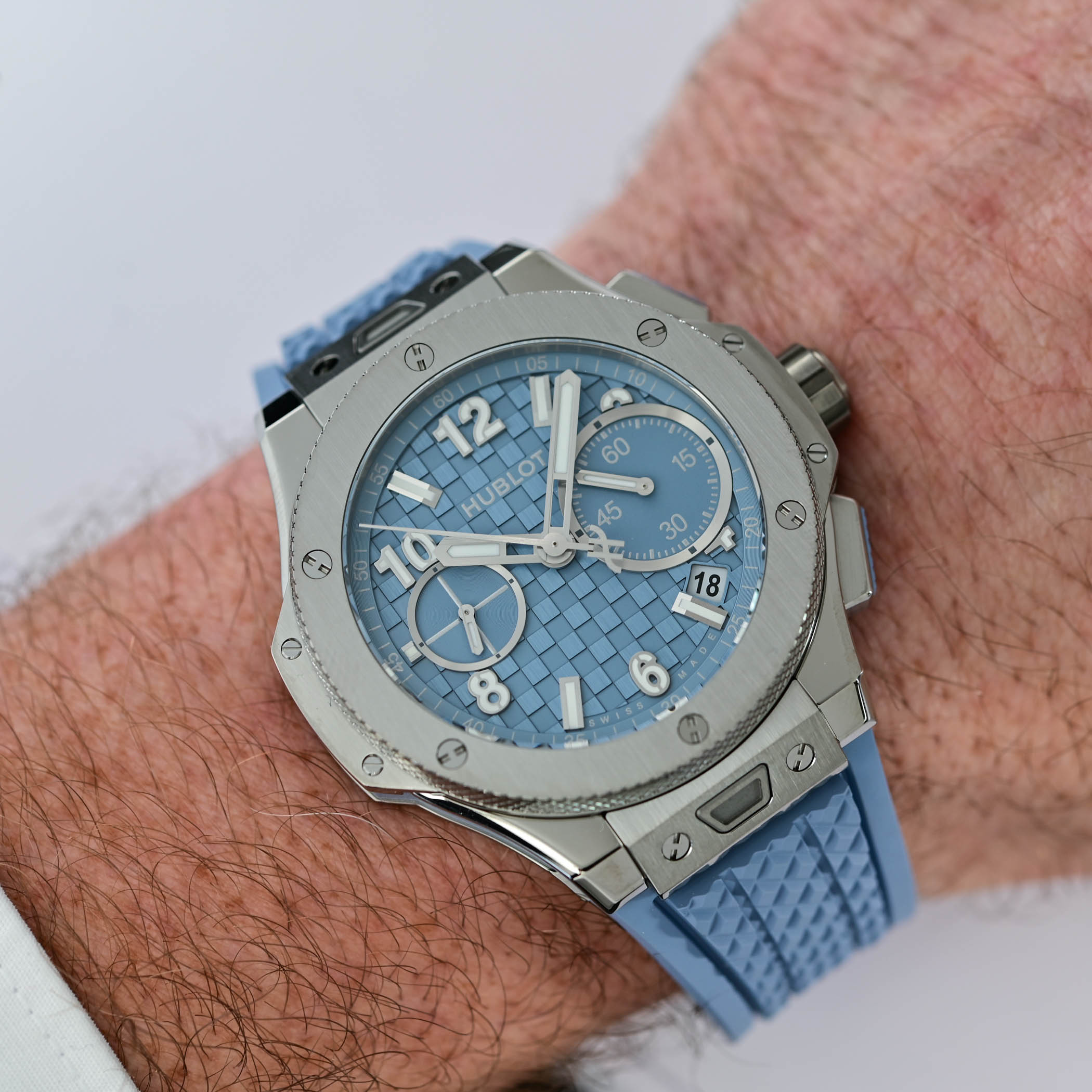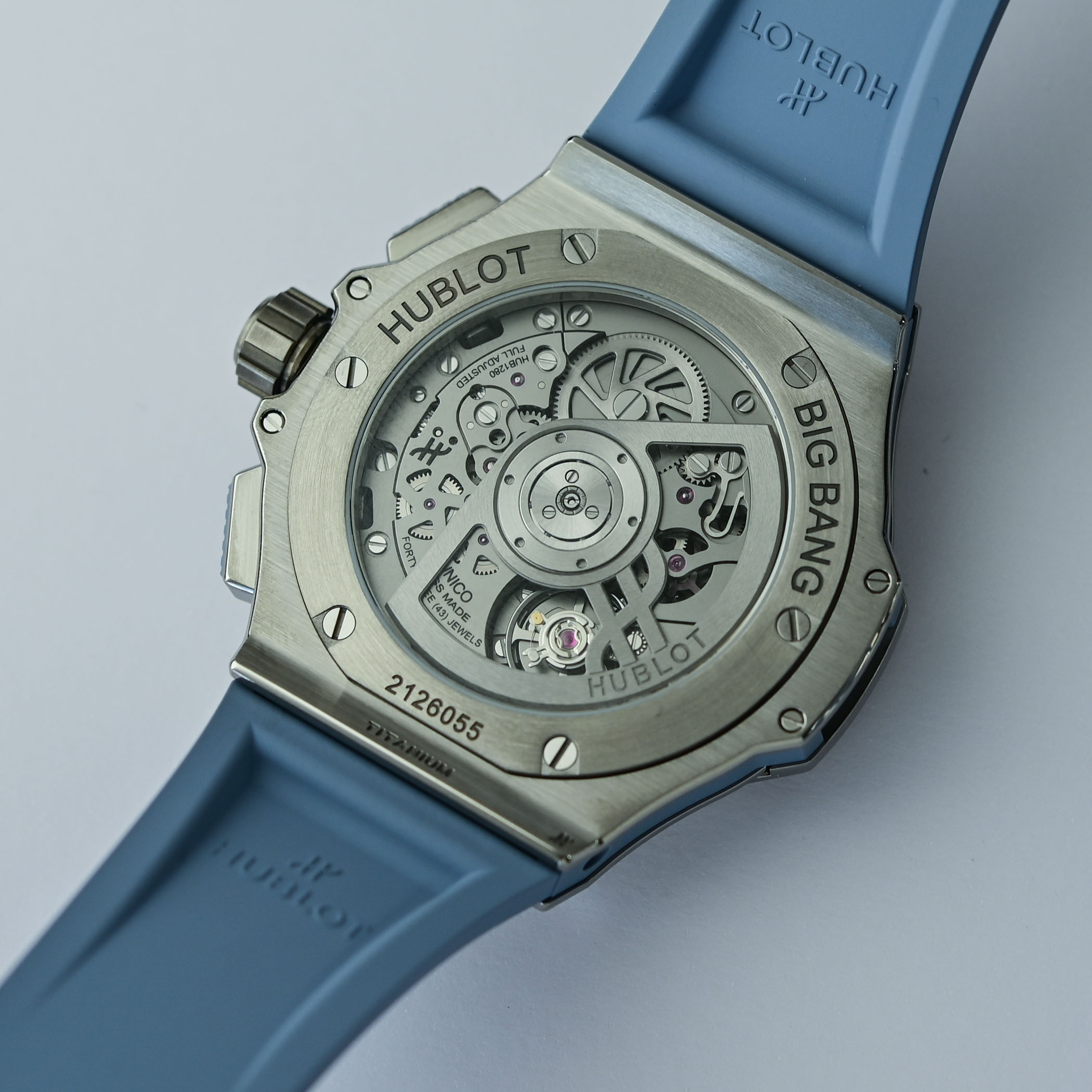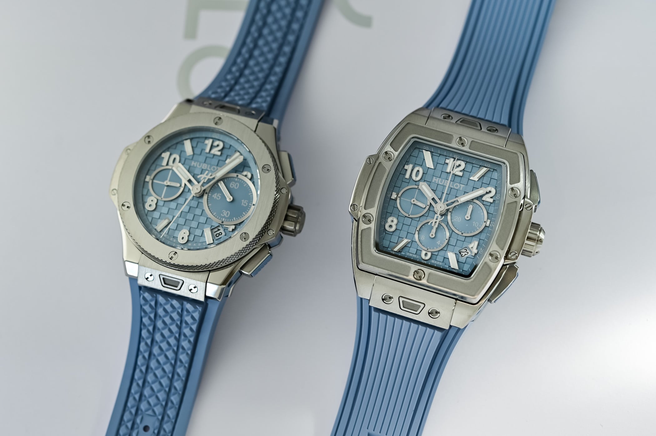 The new Coal Blue series includes four references across the Big Bang and Spirit of Big Bang lines: two titanium chronographs, the Big Bang Original Unico 43mm and Spirit of Big Bang 42mm, and two diamond-set steel models, the Big Bang One Click 33mm and Spirit of Big Bang 32mm, each dressed in this cool, contemporary hue.