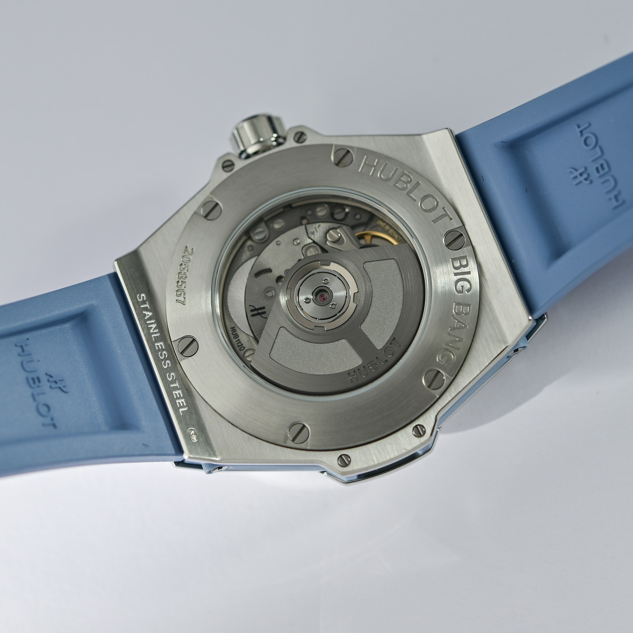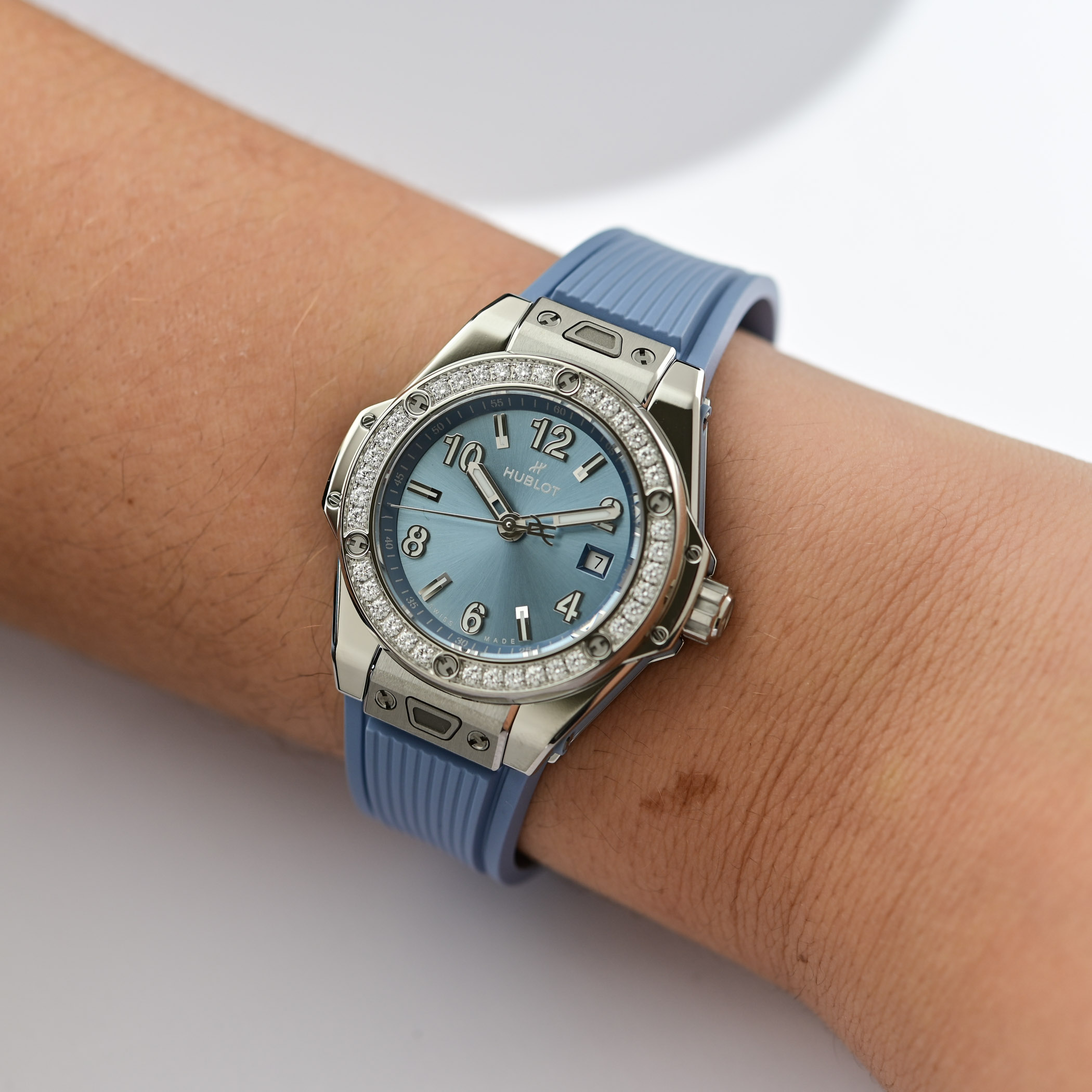 The Spirit of Big Bang Coal Blue Diamonds (32mm) offers the same tonal palette in a delicate, feminine form. Its stainless steel tonneau case is set with 44 brilliant-cut diamonds (0.70ct) framing a Coal Blue sunray dial. The HUB1120 automatic movement (Sellita SW100) ensures reliable performance, visible through the sapphire back. Paired with a Coal Blue lined rubber strap and deployant clasp, this model blends luxury and daily wearability.