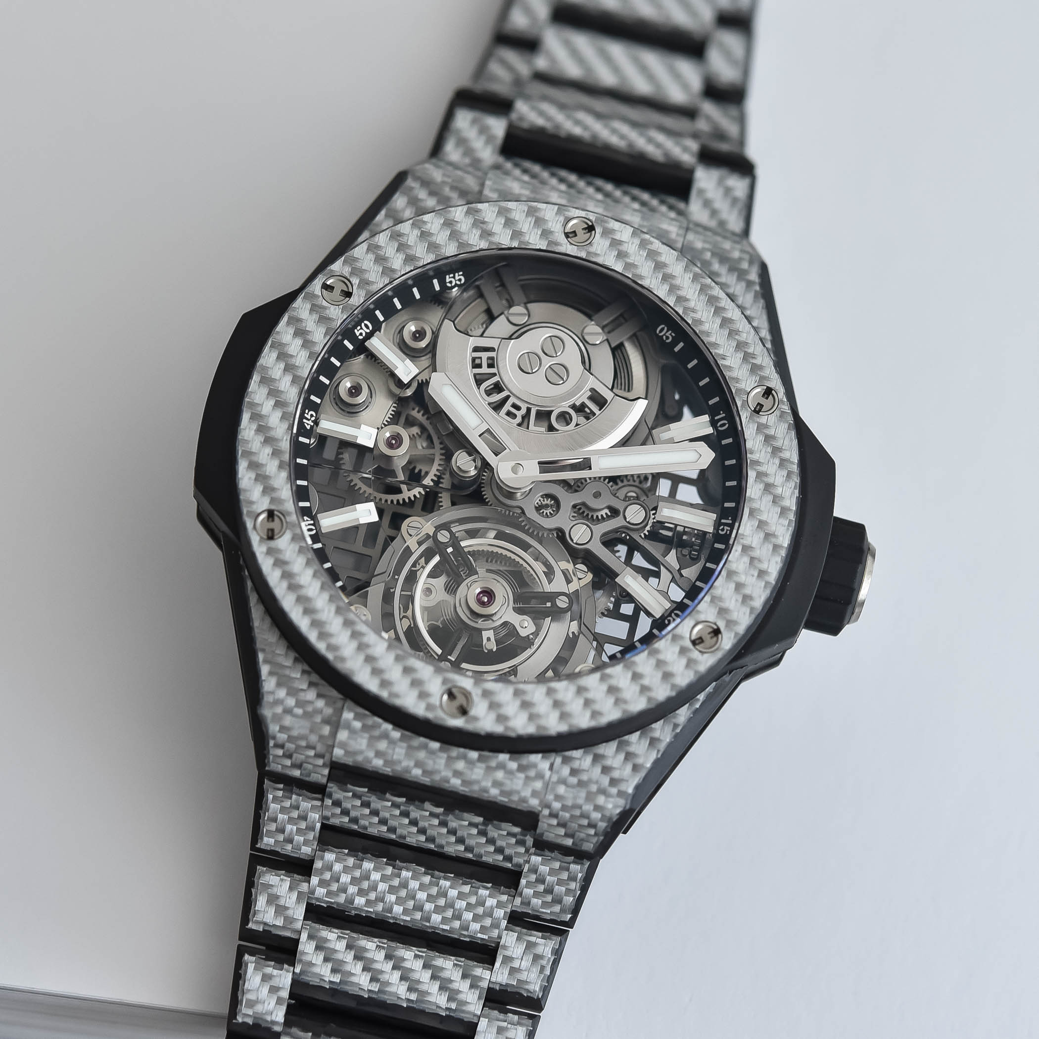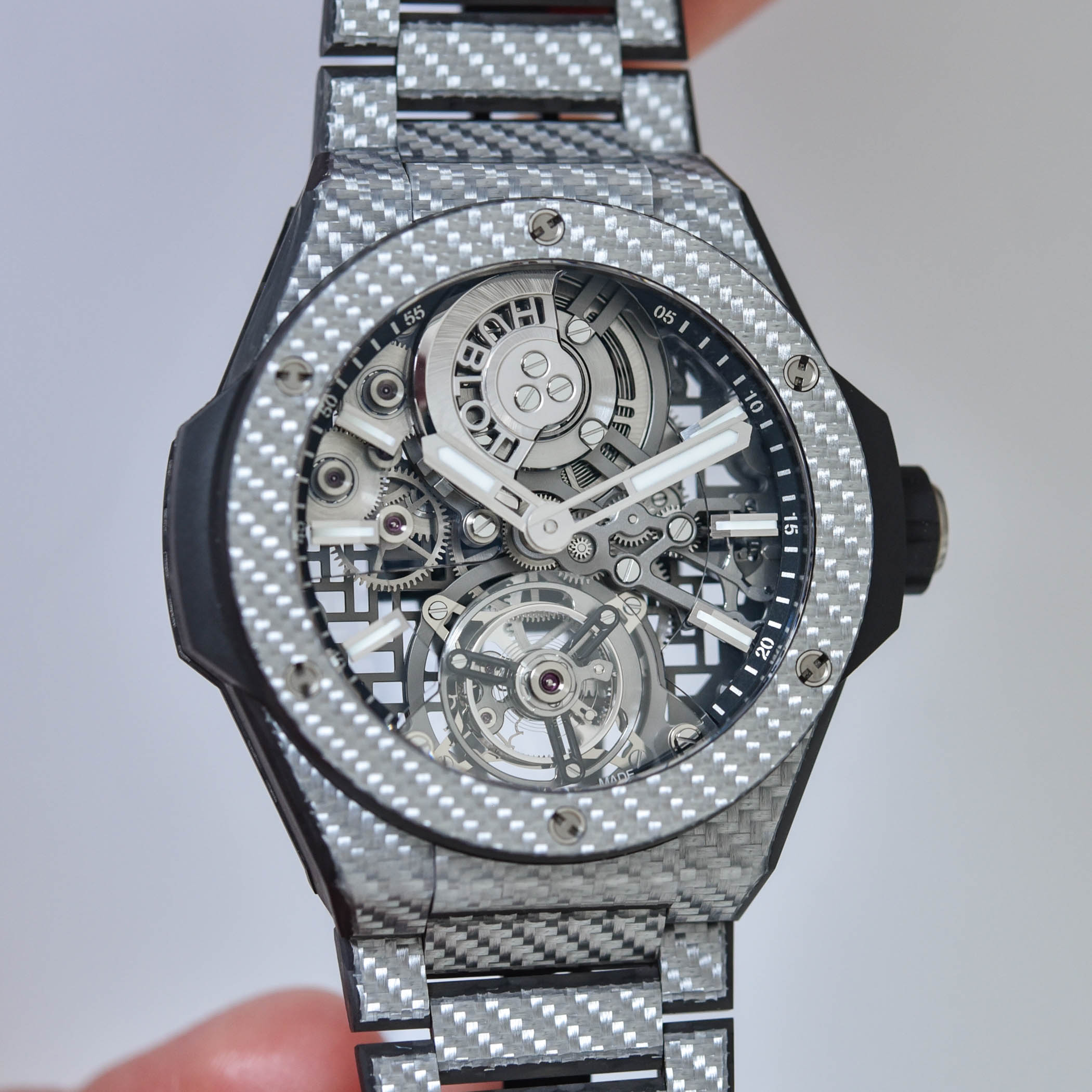 Housed in this ultra-technological composite case, the openworked dial showcases the mechanical heart of the watch dial. Suspended on the dial at 6 o’clock, the tourbillon performs its rotations against an almost diaphanous background of sapphire bridges and an openworked baseplate, allowing light to flood the movement. The lattice structure of the baseplate echoes the interlaced pattern of the carbon fibre, and you can see the micro-rotor with the Hublot branding dial-side at noon. The six hour indices are suspended over the movement, and the hour and minute hands are treated with Super-LumiNova.