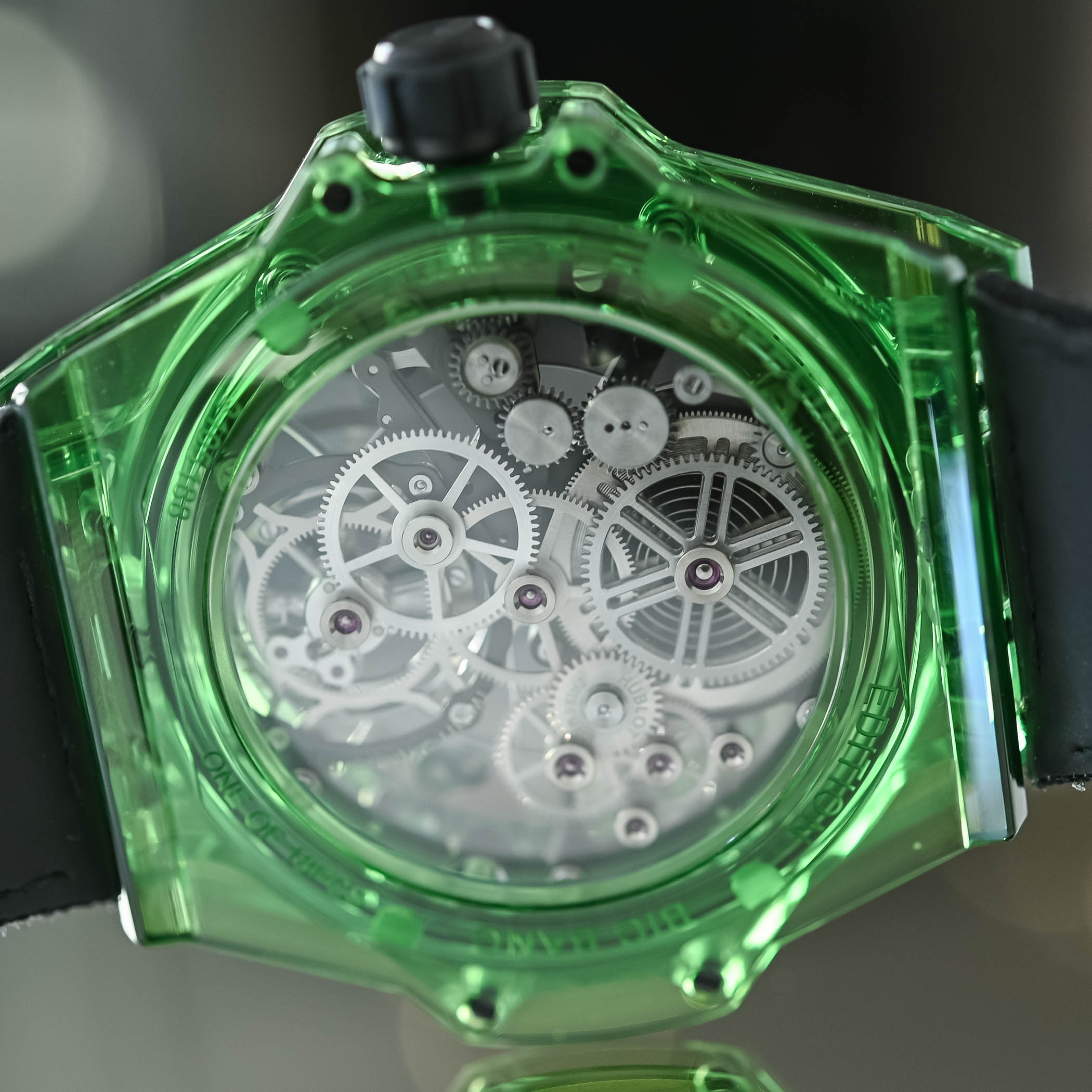 While bright colours have become noticeably prevalent in watchmaking for quite a few years, until recently, the exciting hues have been reserved for the dials and the straps. On the other hand, Hublot tries hard to make its entire watches, case included, literally eye-popping. Moreover, the brand strives to showcase its movements and does it well by using sapphire crystals and materials such as SAXEM – Sapphire Aluminium Oxide and Rare Earth Mineral, produced by blending aluminium oxide, the essential component of sapphire, with rare-earth elements. Notable SAXEM-series watches were made available in Green as Big Bang MP-11 (2019), Spirit of Big Bang (2020) and Big Bang Unico (2024) and in bright Yellow Neon (Big Bang Tourbillon Automatic, 2023). Hublot continues the green theme this year and launches the Big Bang Tourbillon Automatic Green SAXEM.
