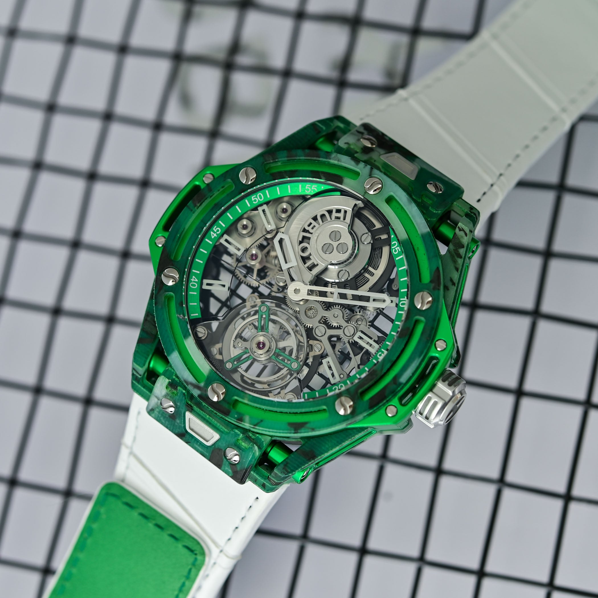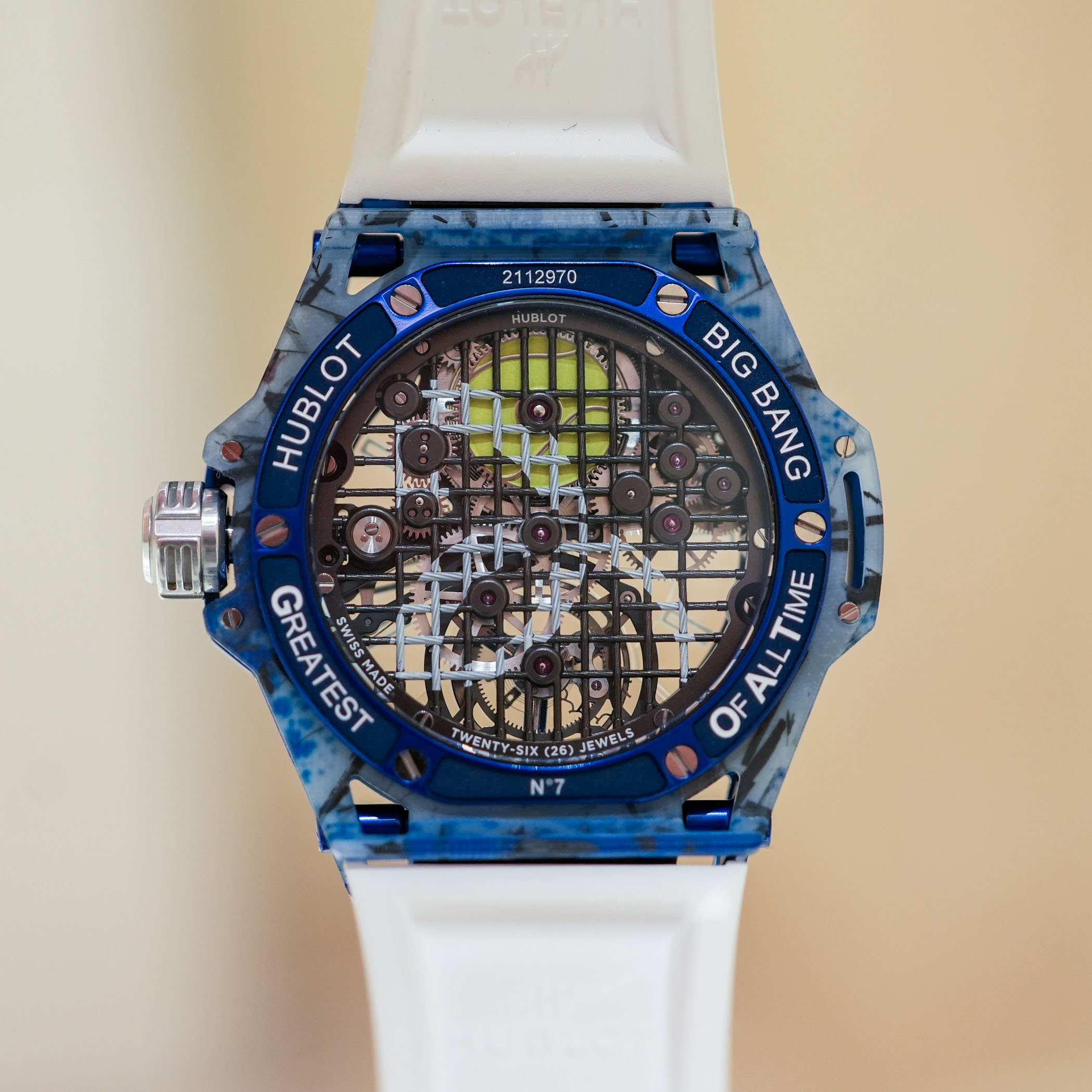 The dial of the Big Bang Tourbillon Novak Djokovic GOAT Edition looks technical, architectural, and very expressive. The transparent sapphire crystal offers a full view of the movement beneath. It features six minimalist hour markers, each satin-finished and filled with a thick, three-dimensional coating of Super-LumiNova. The skeletonised hour and minute hands get the same treatment, floating above the openworked structure. Flashes of colour appear in the anodised aluminium tourbillon cage, available in blue, orange, or green to match the case.