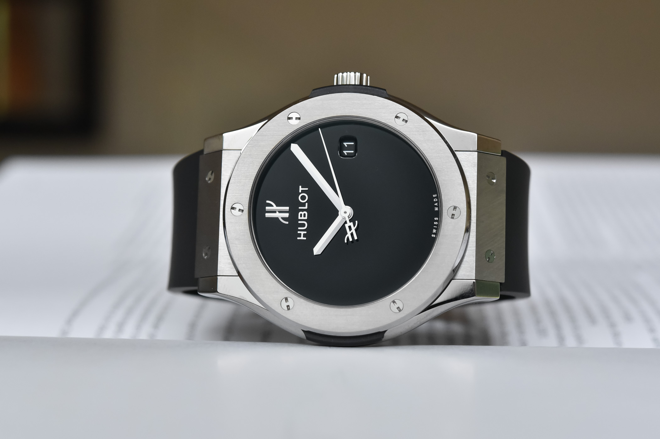 However, where the anniversary models differ from the other Classic Fusion models can be appreciated on the dial. The inky black lacquer dial is sleek, and like the original, bereft of numerals. The hands are faceted and the counterweight of the central seconds hand bears the H logo, similar to H applied at noon and the Hublot appliqué below. The date window is rounded and softer than the rectangular frame of the original, and the black background matches the black dial.