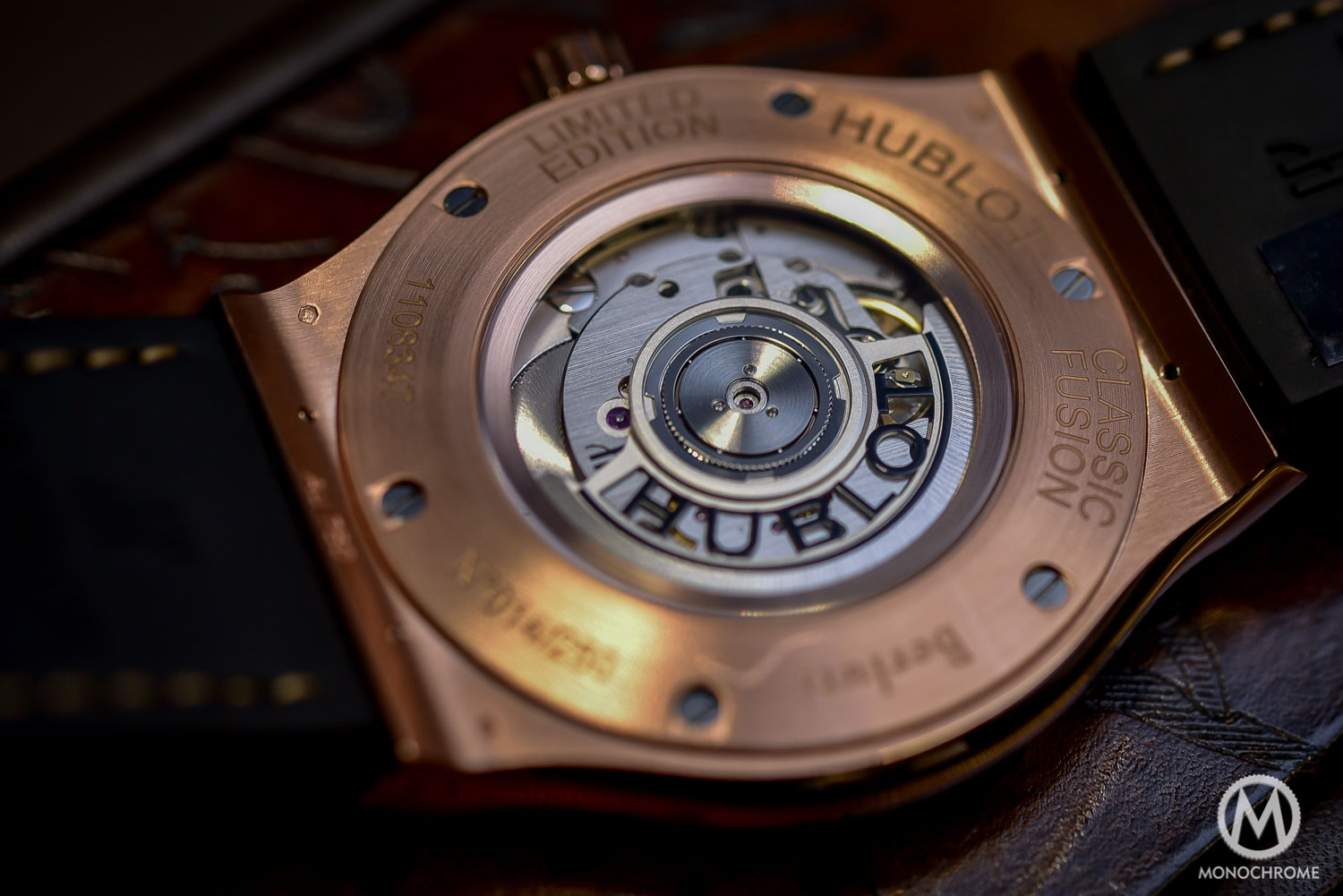 The Hublot Classic Fusion Berluti is powered by the calibre HUB1100 (an out-sourced movement with 42 hours of power reserve). Even at 45mm and made in gold, it remains relatively slim and comfortable on the wrist. It is for sure a bold and large watch but it remains balanced and easily wearable.
