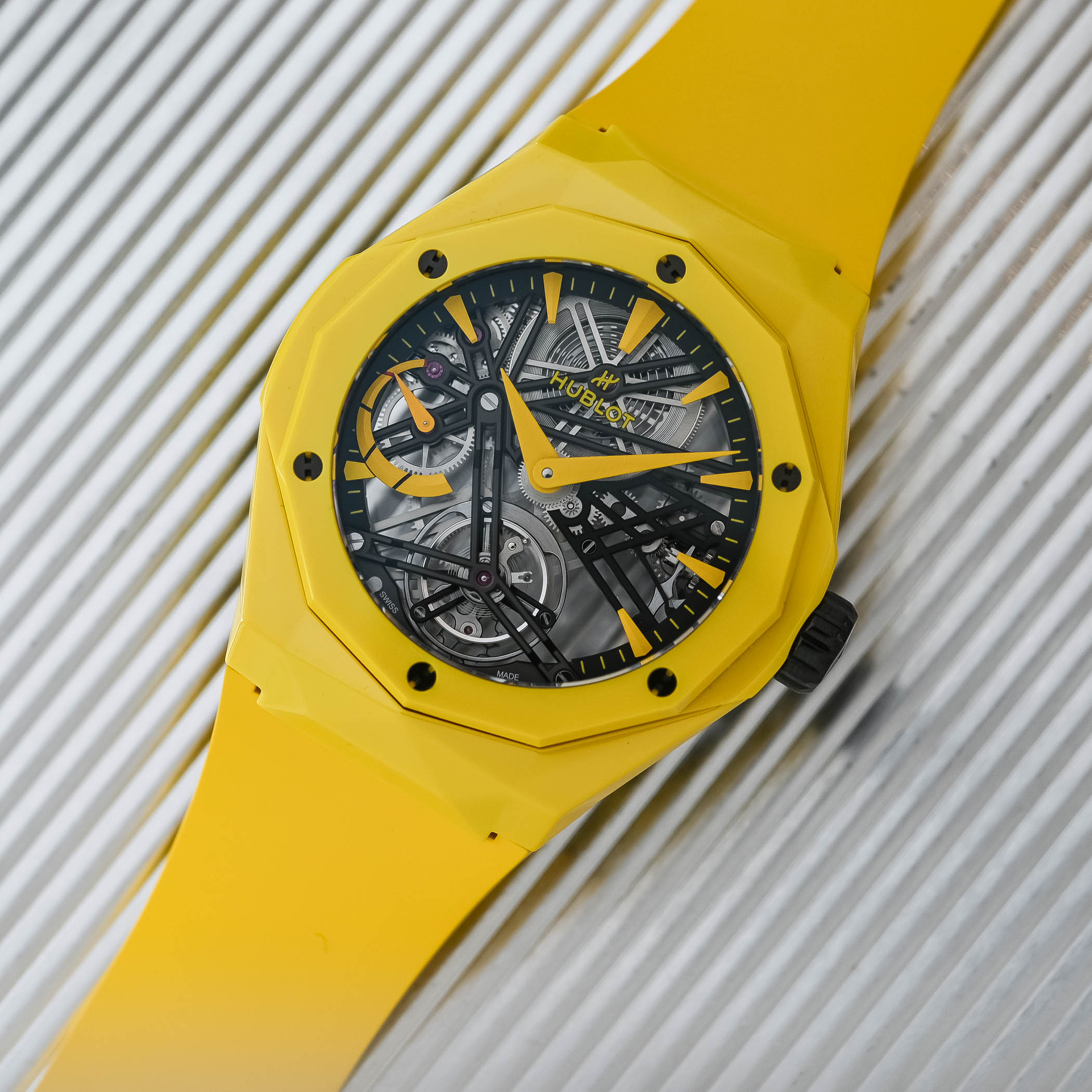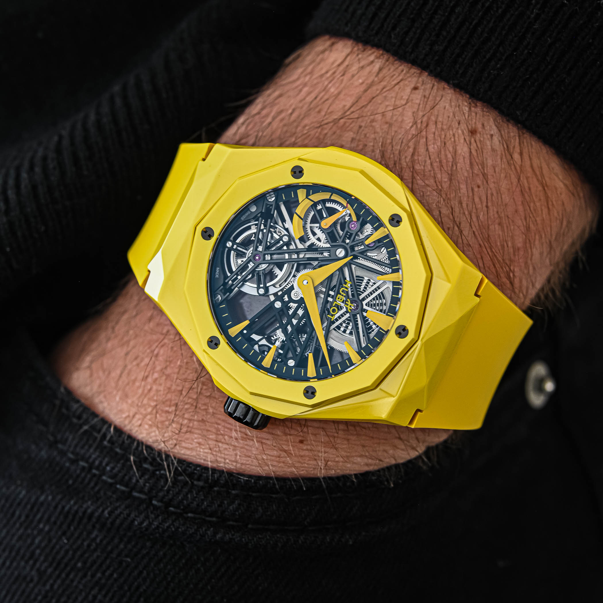 The Yellow Magic variant features a matching yellow ceramic Orlinski-designed bezel adorned with six H-shaped black-plated titanium screws, a black-plated crown, and black PVD skeleton bridges housing the manually wound HUB6021 movement, skeletonized to offer an exhaustive view of its intricacies from both the front and back, on display thanks to the open-worked dial and exhibition caseback. While most of the dial has been removed for our viewing pleasure, it has applied yellow hour indices crafted to the artist’s specifications, and a black chapter ring with yellow minute markings that make reading the time using the sharp, yellow-coloured hour and minute hands relatively easy. At 8 o’clock is a 5-day power reserve indicator with a yellow scale and hand, and at 6 the beating heart of this timepiece, the tourbillon, provides a captivating display, harmoniously balanced by a visible barrel at 12 o’clock.