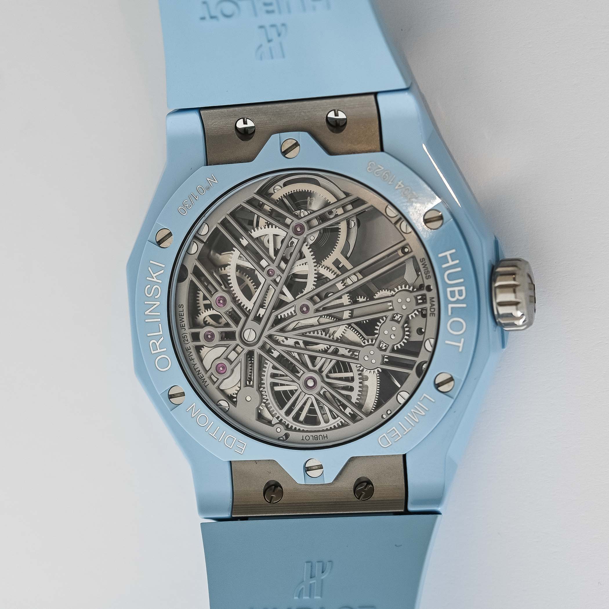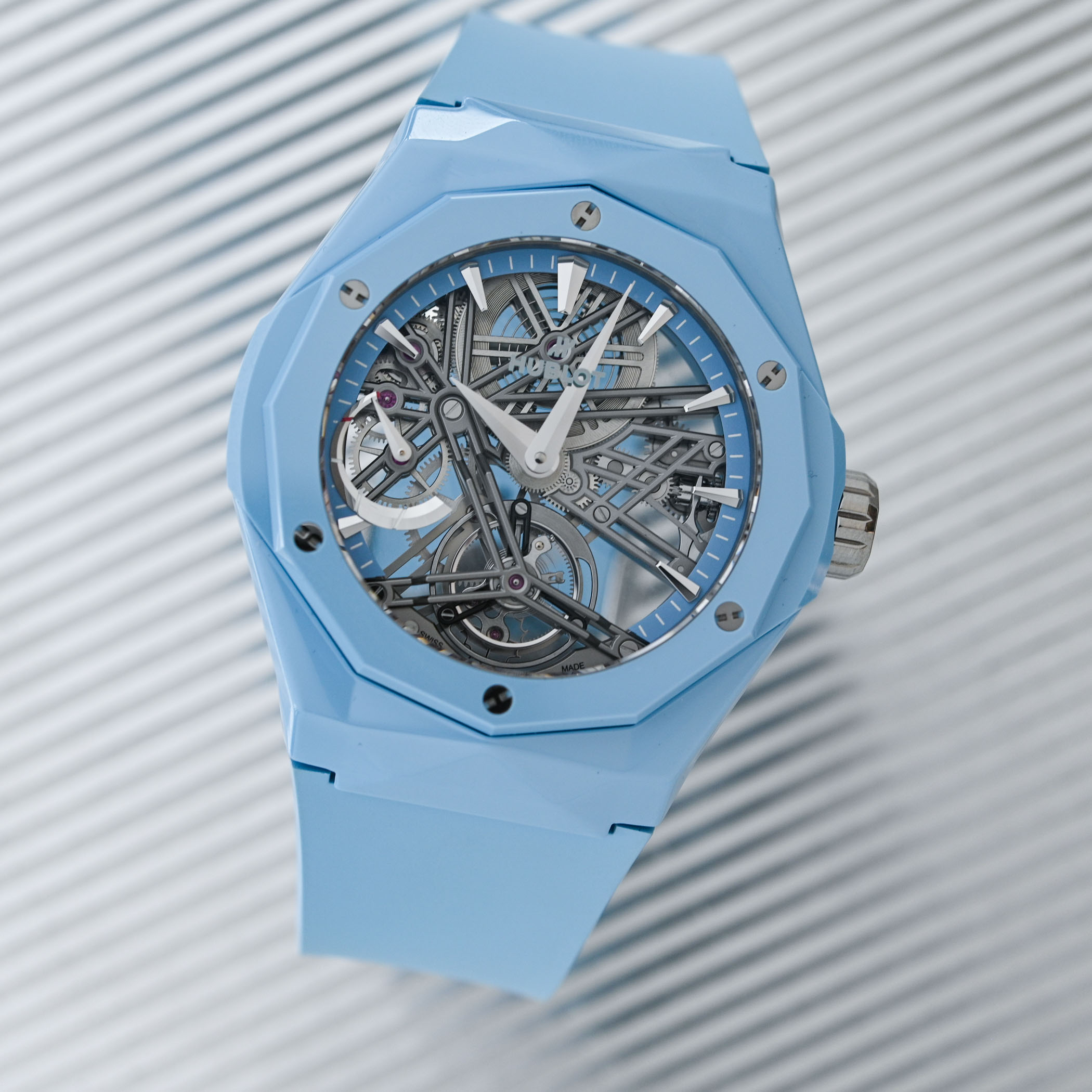 While Orlinski’s work might not be a favourite among art critics, it enjoys immense popularity among affluent clients, reportedly earning him the title of the best-selling French contemporary artist globally. Since 2017, Hublot has allowed Orlinski to unleash his creativity within the Classic Fusion series. In 2019, the brand unveiled the Classic Fusion Tourbillon Orlinski series, introducing three watches with sapphire, King Gold, or ceramic cases, each limited to 30 pieces. The latest collaborative tourbillon iterations maintain the same design ethos but now showcase vibrant, brightly coloured polished ceramic cases, available in yellow or light blue; arguably, the new timepieces, even though bold and bright, are among the most aesthetically pleasing in the collection. Take a look and see if you agree.