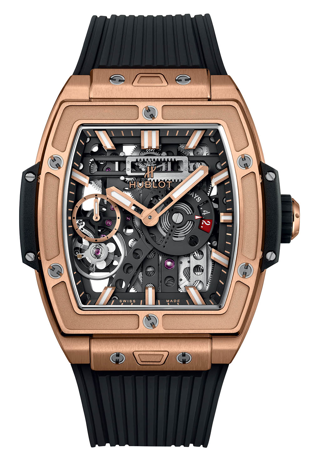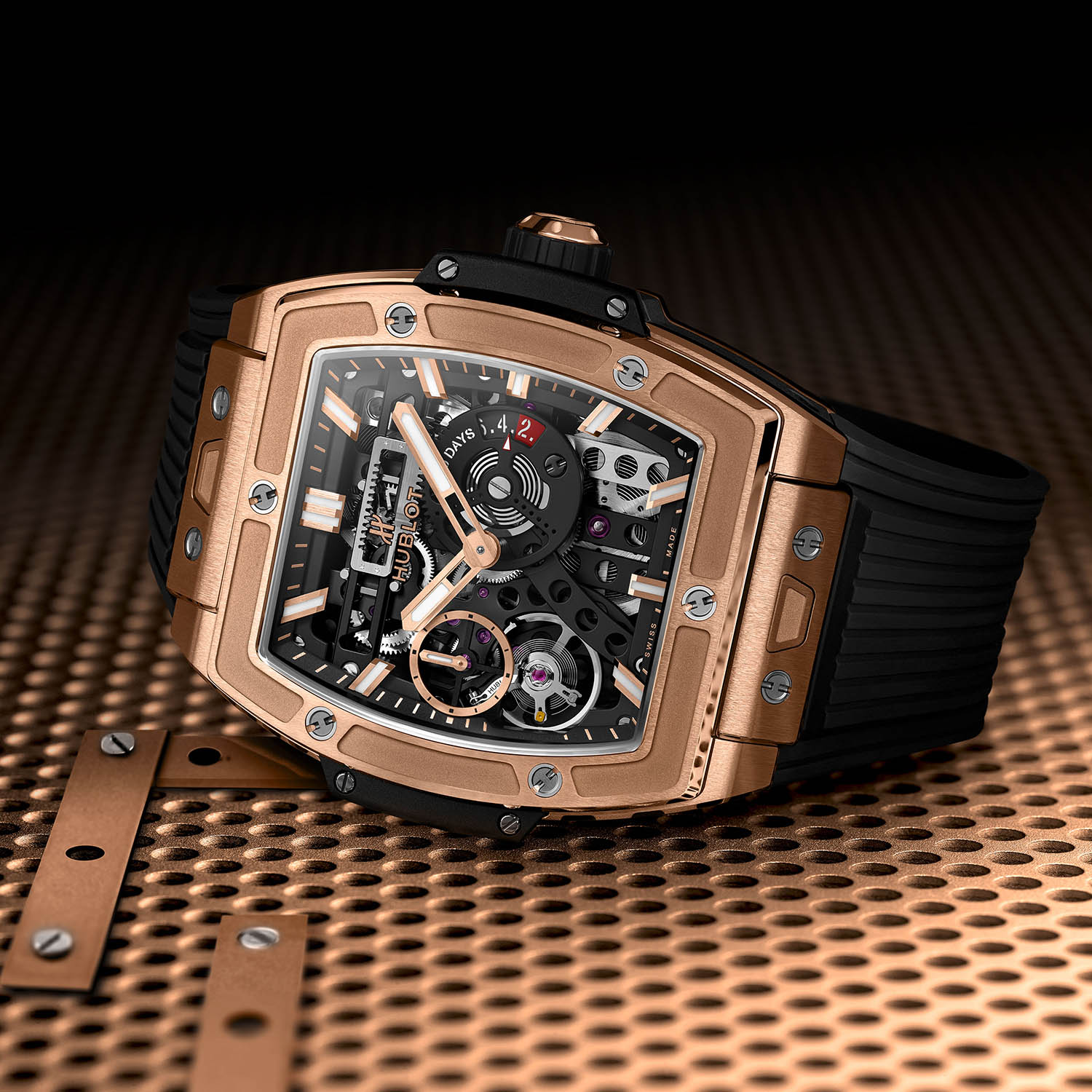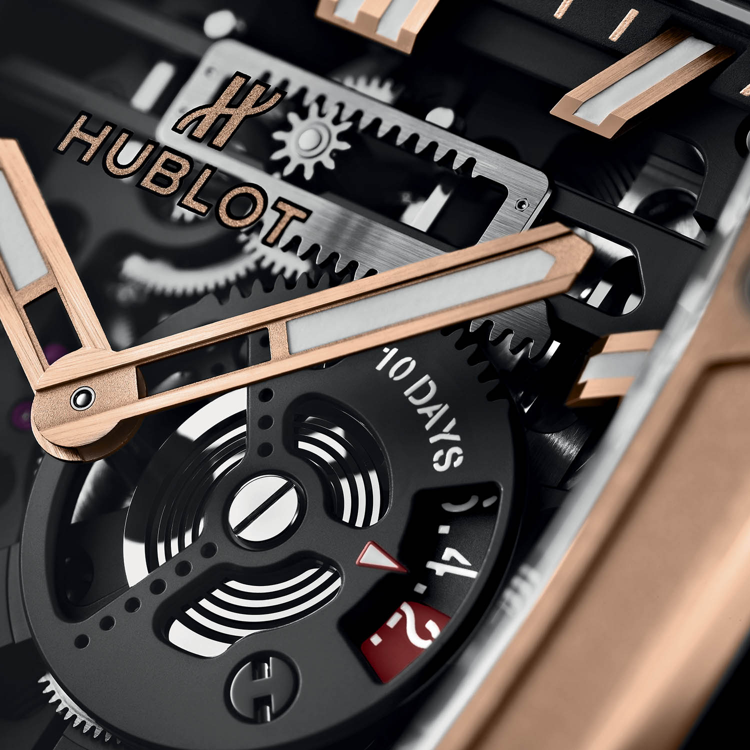The 10-day power reserve movement finds its way in the barrel-shaped Hublot.