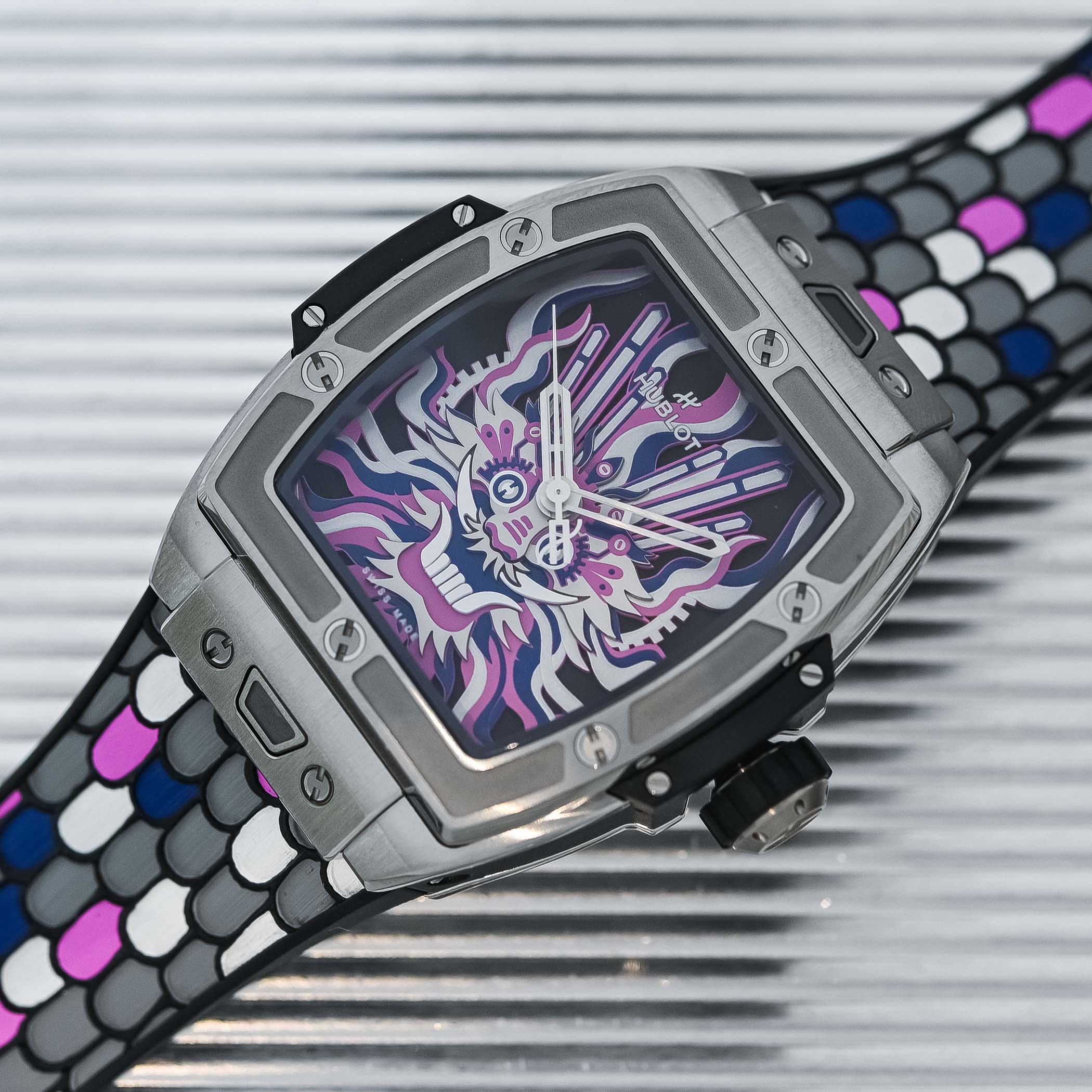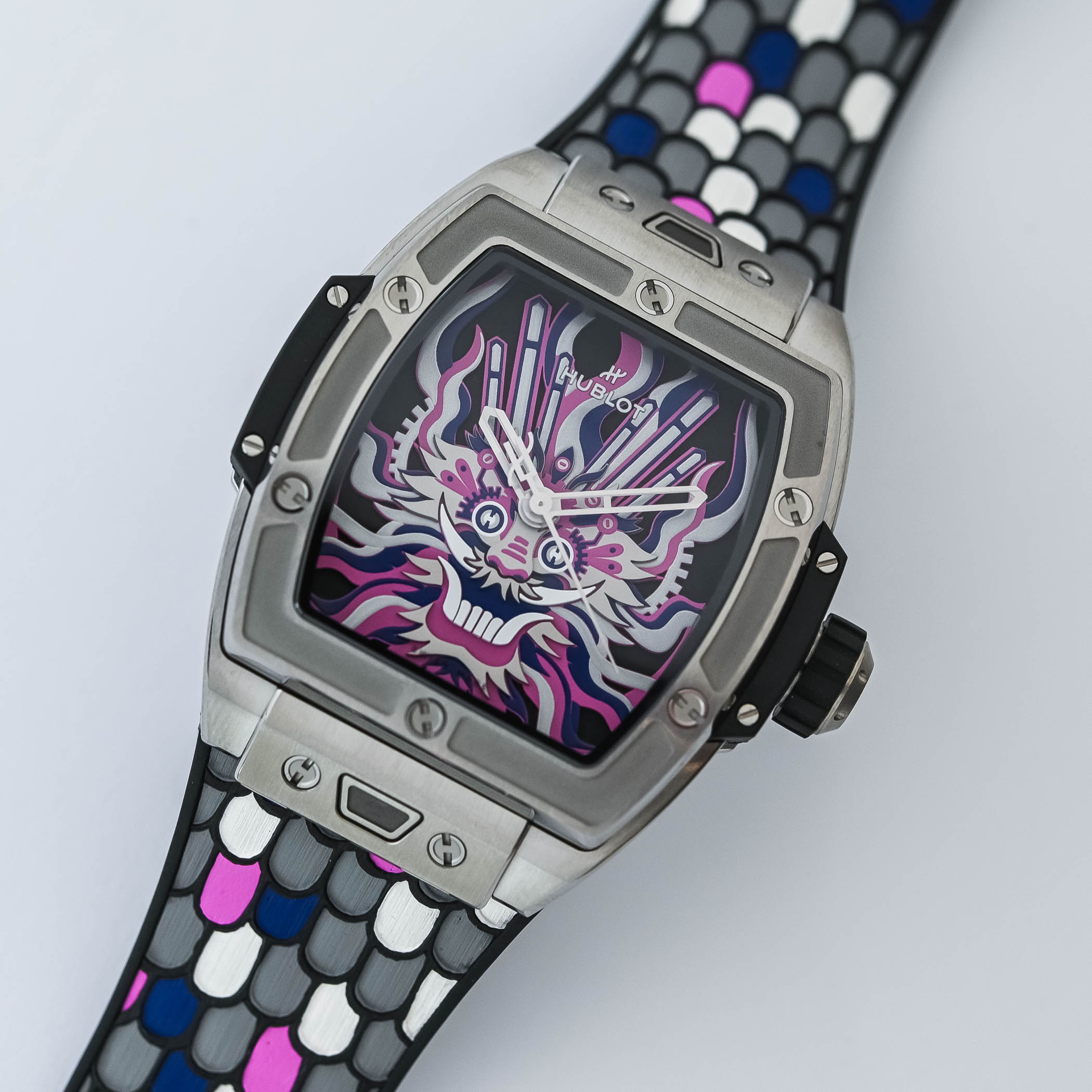 The 42mm tonneau-shaped case of the Spirit of Big Bang crafted in titanium is the canvas for Chen Fenwan’s colourful and dynamic interpretation of the loong. Retaining its signature characteristics – 6 H-shaped screws on the bezel, rubber lateral bumpers and contrasting satin-brushed, polished and sandblasted finishing – the 13.8mm thickness of the case is tempered by its curving, ergonomic construction.