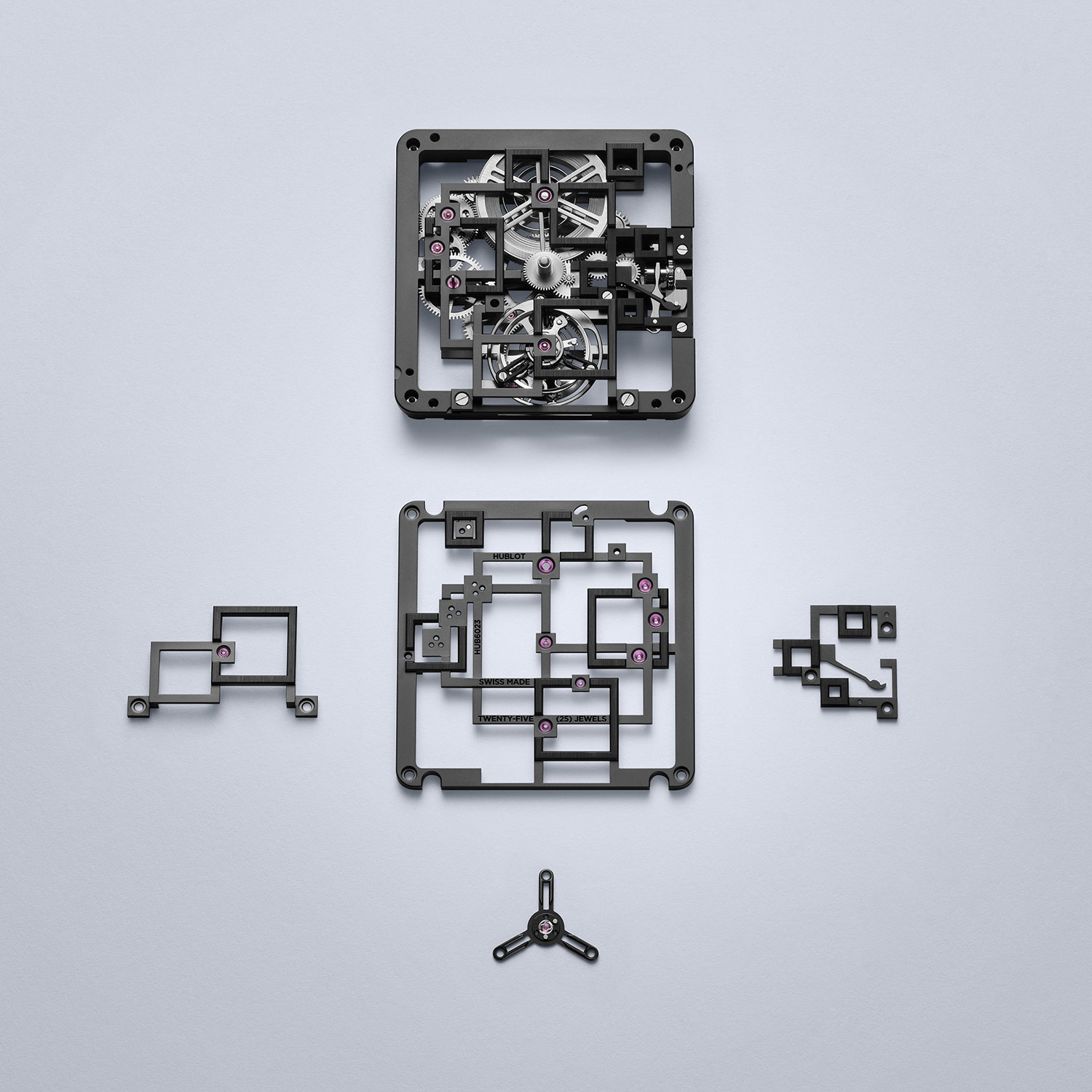 Underscoring the geometry, the components are distributed over the four sides of the openworked square: winding components on the right, power reserve on the left, large barrel at noon and tourbillon at 6 o’clock. Suspended mid-air by the square and rectangular bridges, the skeletonised 174-part movement leaves nothing to the imagination. The round barrel, tourbillon, power reserve and wheels contrast dramatically with the strict geometry of the bridges.