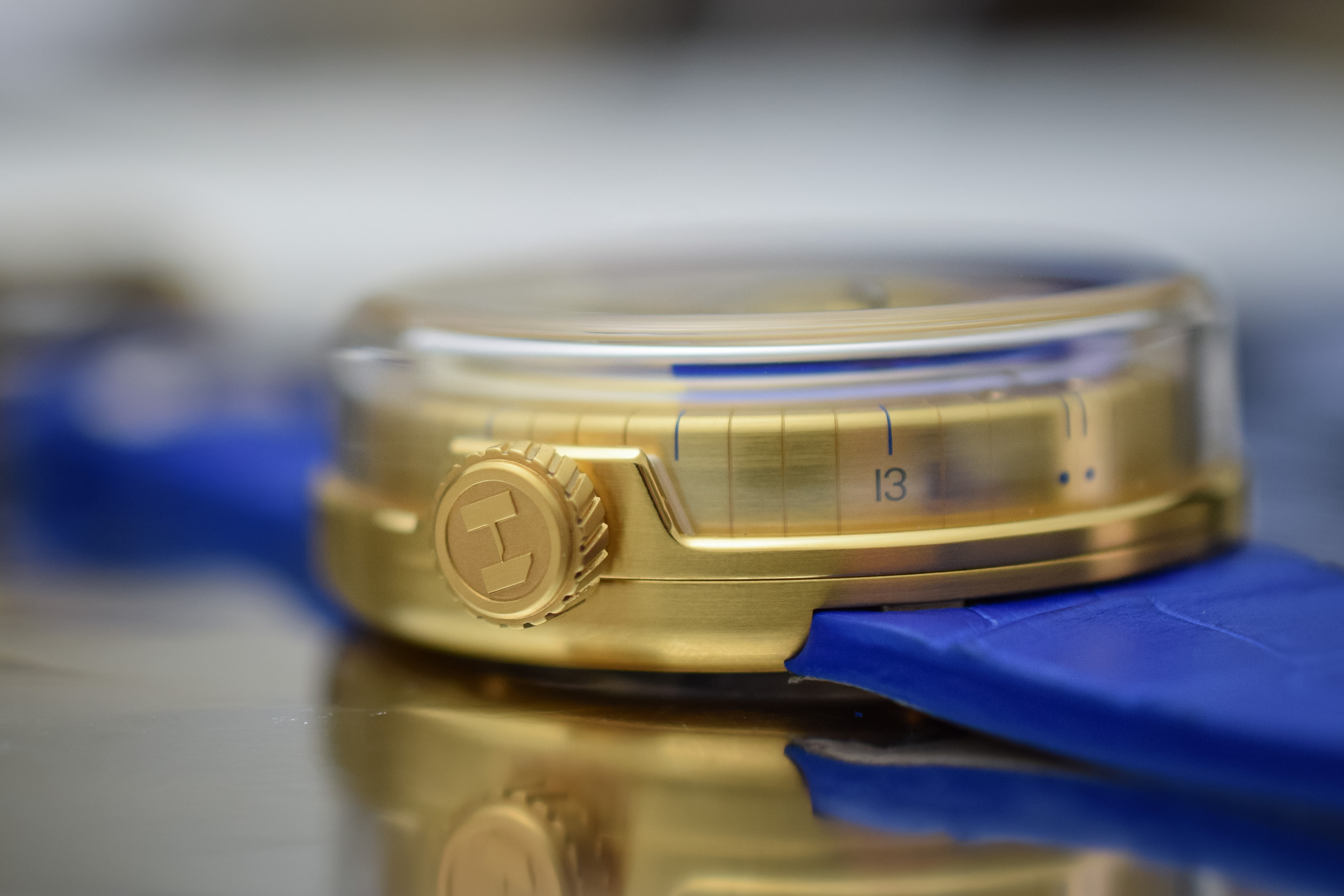 One of the latest novelties of the brand, the H0 is now presented in a luscious 2N yellow gold case displaying time with blue (or black) fluid. Its bold colours take the H0 to new territories with a bit less of that tool-watch feel but a striking presence on the wrist – all the more as the case measures 48.8mm in diameter and 17.9mm in height. The opaline curved dial suggests the concentric waves formed by a drop of water falling into water. It mixes circular-brushing and sand-blasting.