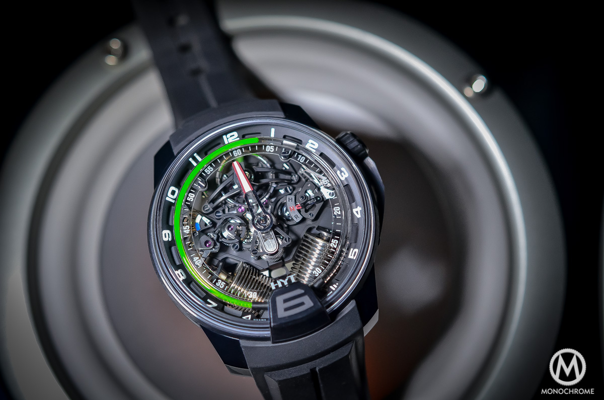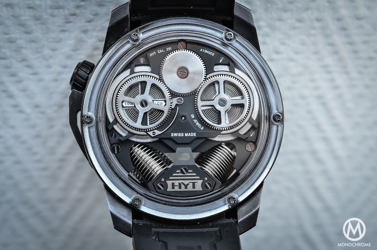 In 2012, when introducing the first of the Hydro-Mechanical watches, the H1, the young and mad brand called HYT created quite a mess in the watchmaking world. Those guys get the strange idea to equipped their creations with the worst enemy of a watch: liquid. We tested this watch and we felt in love with it, just because of the rationality and serious of the concept. Back in 2013, only 1 year after their first attempt, HYT brought an even more exciting successor in the name of the HYT H2 Titanium Black DLC and we’ve been testing it again.