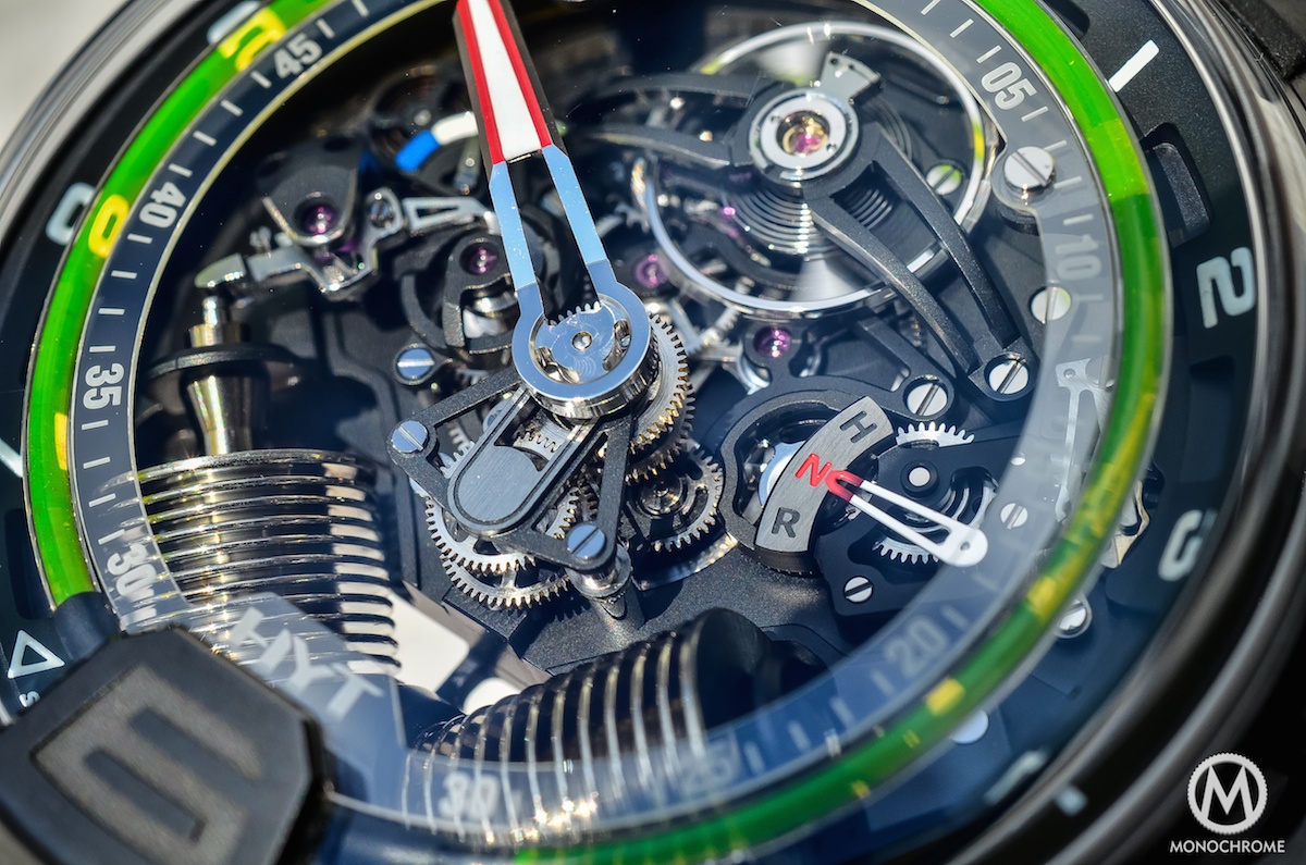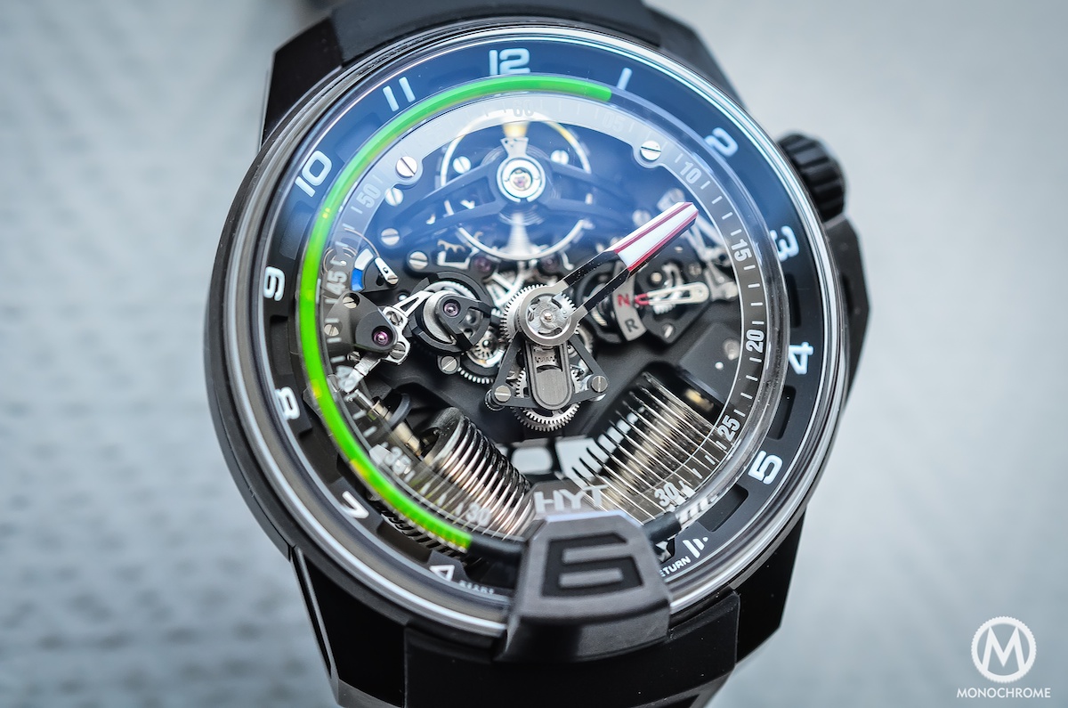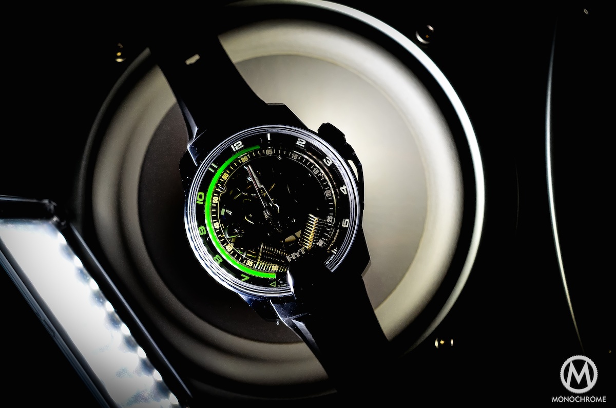 The main feature of the HYT H2 is, like the HYT H1, the regulator-style display with its capillary filled with 2 liquids: a fluorescent one and a translucent one. The timing-indication is divided in two: the hours are indicated by the fluid while the minutes are showed by a central hand – a novelty compared to the HYT H1, as the minutes are not located in a sub-dial at 12 with a classical rotating display. The minute hand is now bigger and positioned in the middle of the watch. It has to be read on its own sapphire track, located just inside the green tube. However, it’s not a classical hand anymore. Between 5:30 and 6:30, it will make a small jump and continue its journey around the dial.