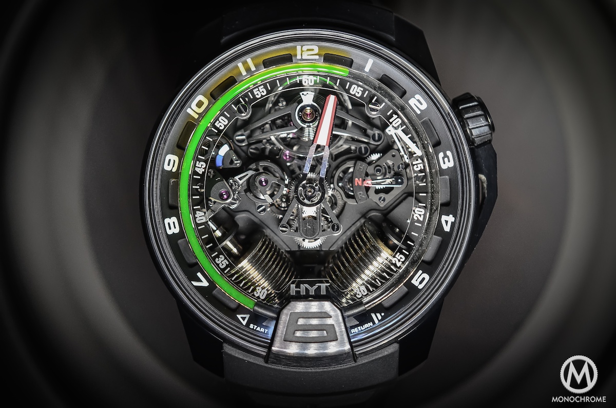 The HYT H2 brings back the main interest of the HYT H1 (the inaugural watch of the brand): the fluidic indication of the time. While most of the watches are displaying time with hands rotating on a central axis – or at least with discs or satellites – it remains a mechanical module actuated by gears, wheels and levers. As complicated as these displays could be – take a look at our ‘other displays’ section – it remains a game of mechanics. With HYT – regardless we’re talking about the H1 or H2 – the watchmakers are introducing something totally senseless and even dangerous for a watch: a liquid. In a circular tube located around the dial, a liquid runs to indicate the hours. Already seen in the context of the HYT H1, the HYT H2 brings that same concept in a watch even more complicated, born from cooperation with the reputed APRP manufacture – Audemars-Piguet Renaud & Papi.