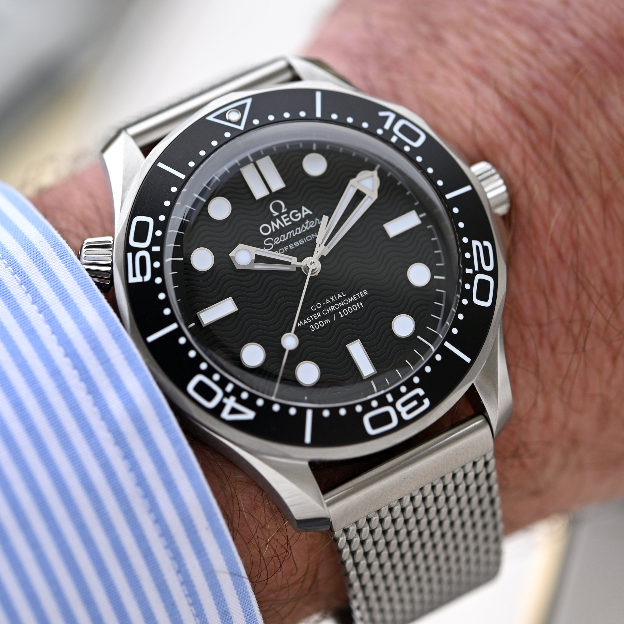 A great hand on write up as usual from Robin. Contrary to ill-informed opinions about which brand Omega are competing with or quality of the Cal.8806 and why the Cal.8900 is not used in the Diver 300M the reasoning is perfectly clear if you understand Omega, and Swatch’s strategy. First, Omega as a brand are placed, by Swatch as the Rolex competitor in the portfolio, at least for part of the range, because there are actually very few Omega watches with direct Rolex analogs. Blancpain also competes with Rolex at a higher price levels. So the Diver 300M is a direct competitor to the Submariner. This is a rarity in Omega’s range. Second, the Planet Ocean is regarded by Omega as their “premier” diving watch so as it uses the Cal.8900 the Diver was never going to use that movement, both to allow Omega to keep the prices ranges of the two lines distinct but also to encourage customers to “upgrade” to the Planet Ocean. Third, Swatch sees Hamilton, Certina and Longines as its Tudor competitors depending on the price range and models. Finally the Cal.8806 is every bit as good as a Rolex movement. The power reserve is quoted as “at least” 55 hours by Omega. I have watches with both the Cal.8800 and Cal.8806 which run for between 58 and 62 hours. The Cal.8900 in my Globemaster can easily run for 72 hours. The Cal.8910 in my Tresor can run for 80 hours. So power reserve is not an indicator of “quality”. As for timekeeping the Cal.8806 I have 3 watches that use it and the average daily gain is 0.5 seconds making it very accurate and far better than my last Rolex Submariner using the Cal.3000 which gained around 8 seconds a day. Turningbto the new Diver 300M No Date watches they are very lovely but the domed crystal adds a bit to the height. I would prefer the same crystal as that on the “standard” Diver 300M having bought a mesh bracelet for several of my watches my advice would be for prospective buyers to look at ordering the “Short” version as it fits much better on most wrist sizes and is less bulky under the clasp.