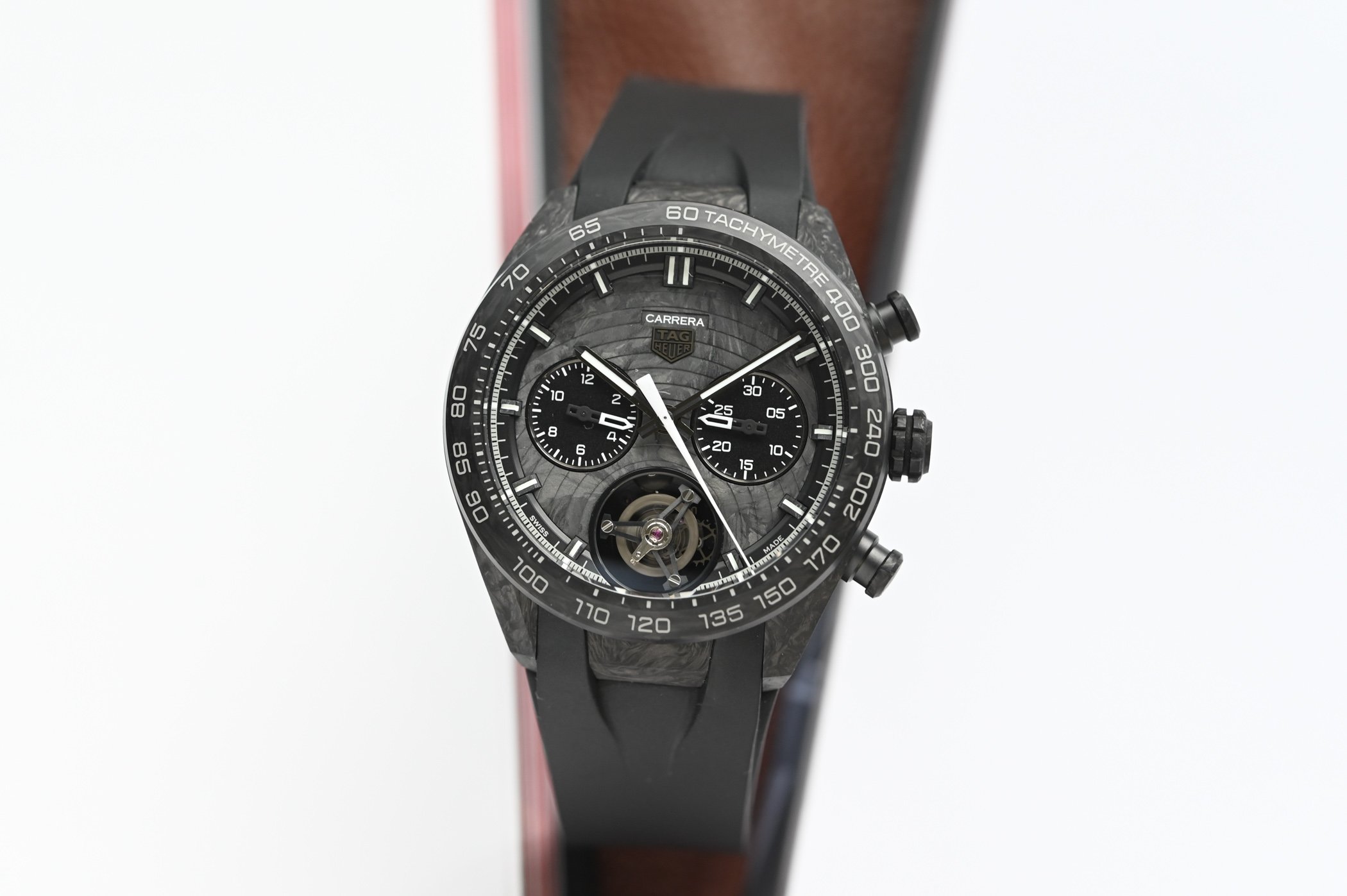 If the Monaco leans on pure design iconography, the Carrera Tourbillon Extreme Sport TH-Carbonspring doubles down on mechanical bravado. Housed in a 44mm forged carbon case with a tachymeter bezel in the same material, the watch combines the new oscillator with a flying tourbillon integrated into TAG Heuer’s latest chronograph calibre.