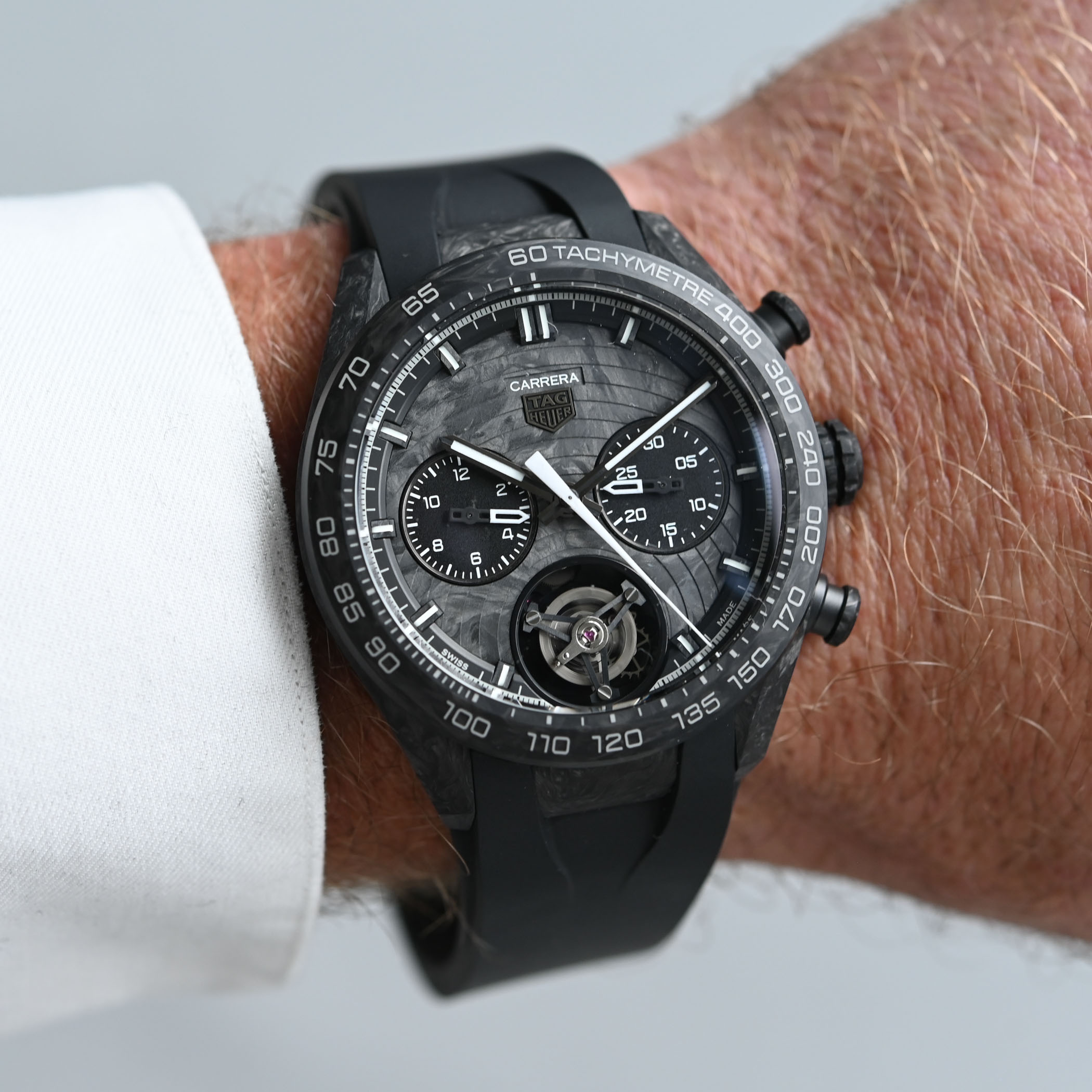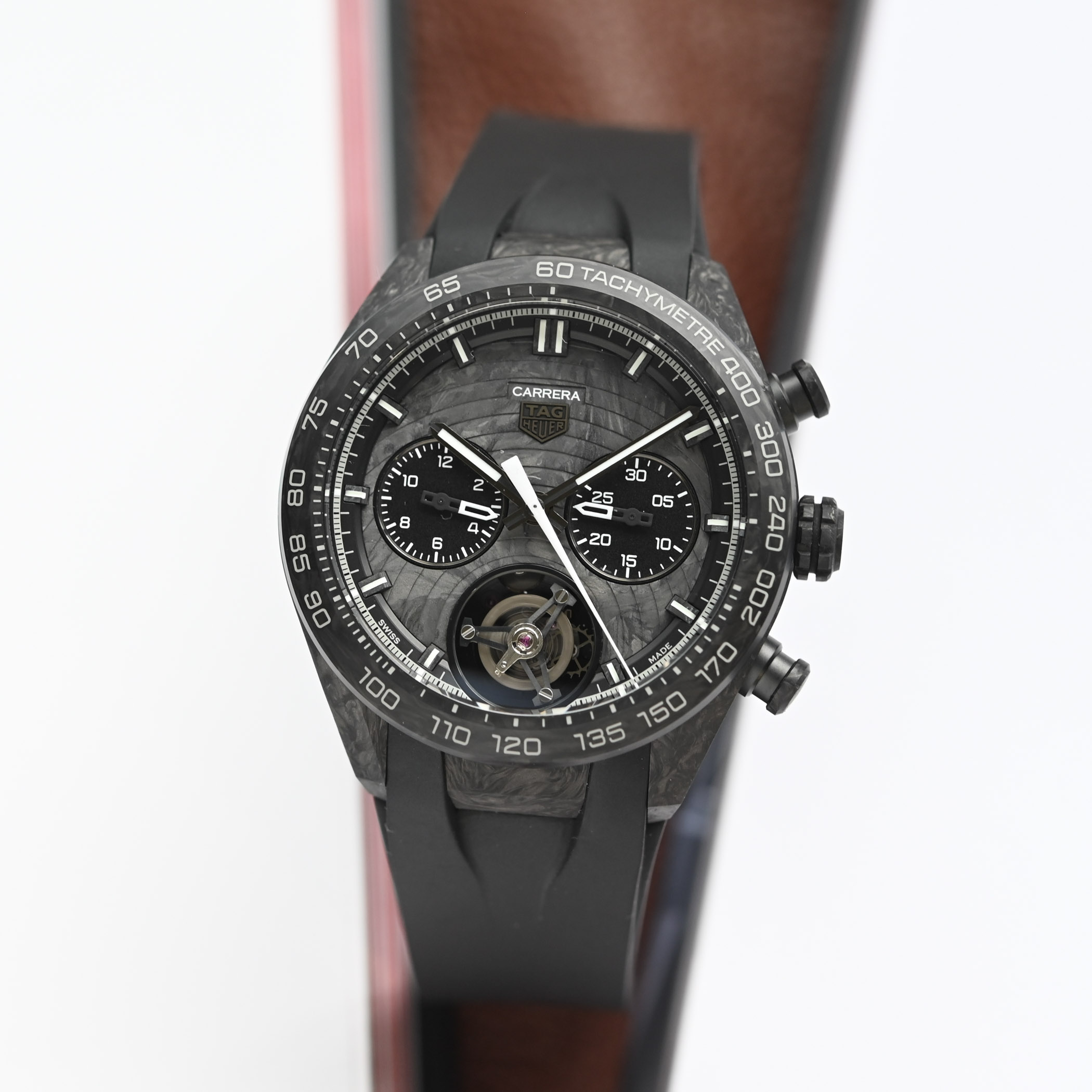 If the Monaco leans on pure design iconography, the Carrera Tourbillon Extreme Sport TH-Carbonspring doubles down on mechanical bravado. Housed in a 44mm forged carbon case with a tachymeter bezel in the same material, the watch combines the new oscillator with a flying tourbillon integrated into TAG Heuer’s latest chronograph calibre.