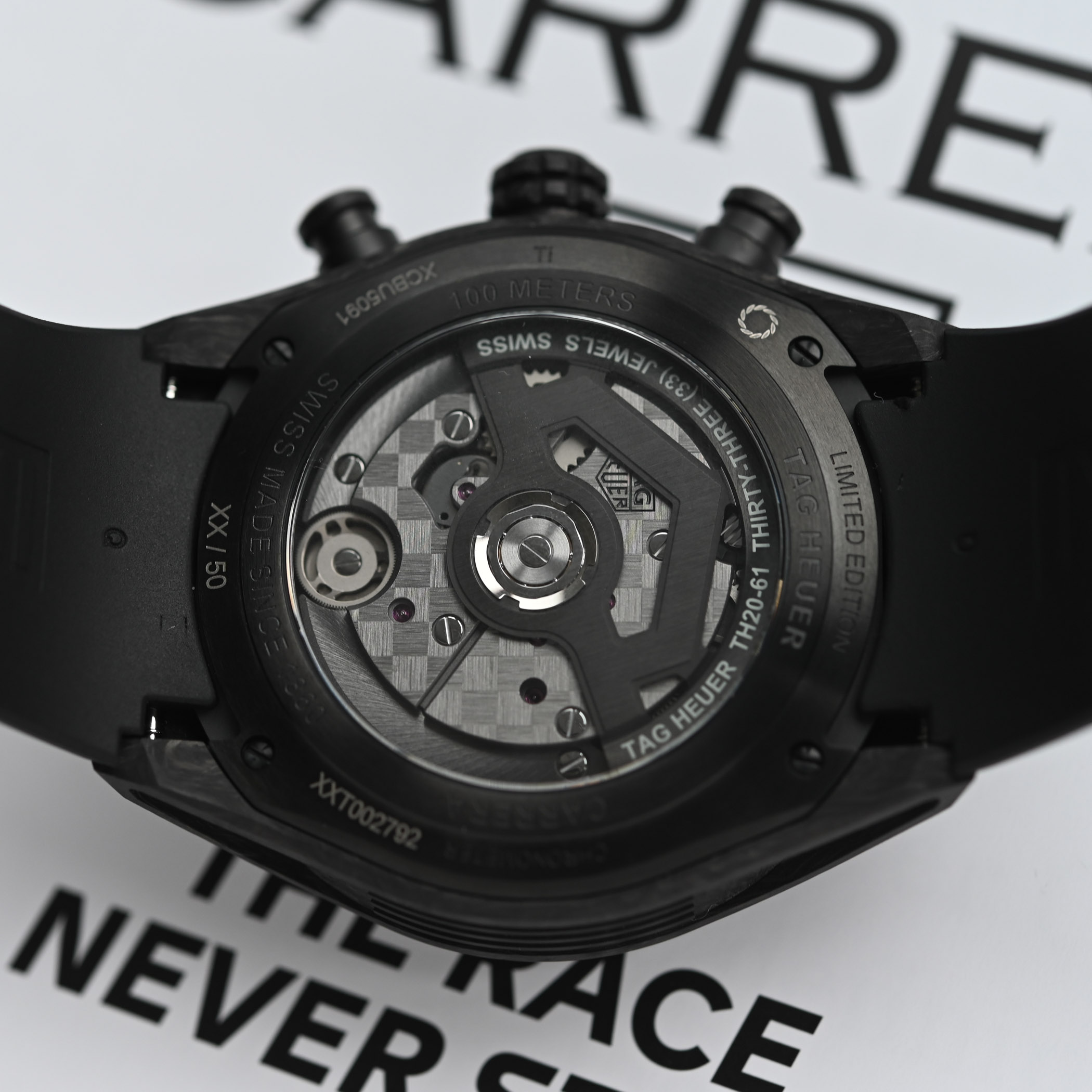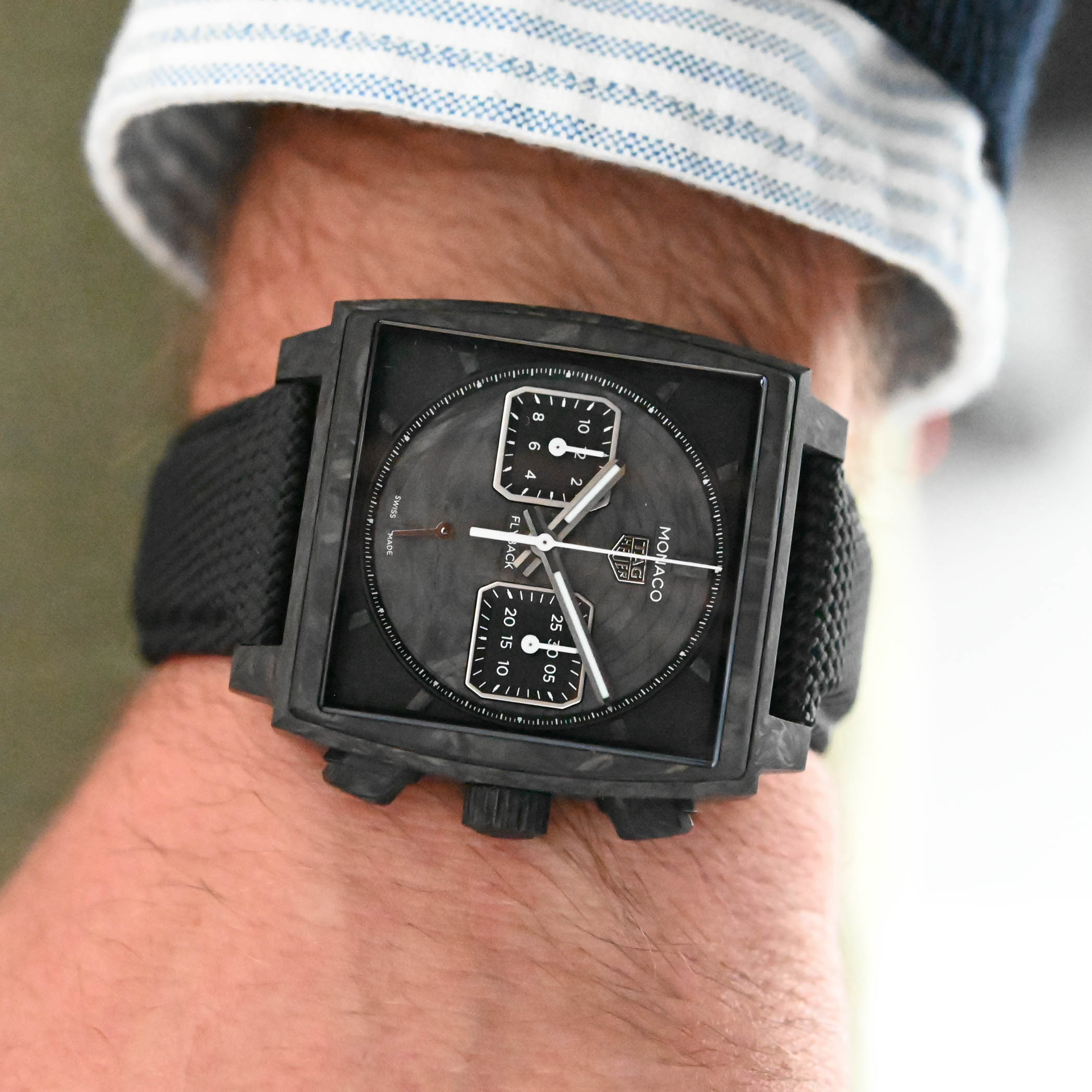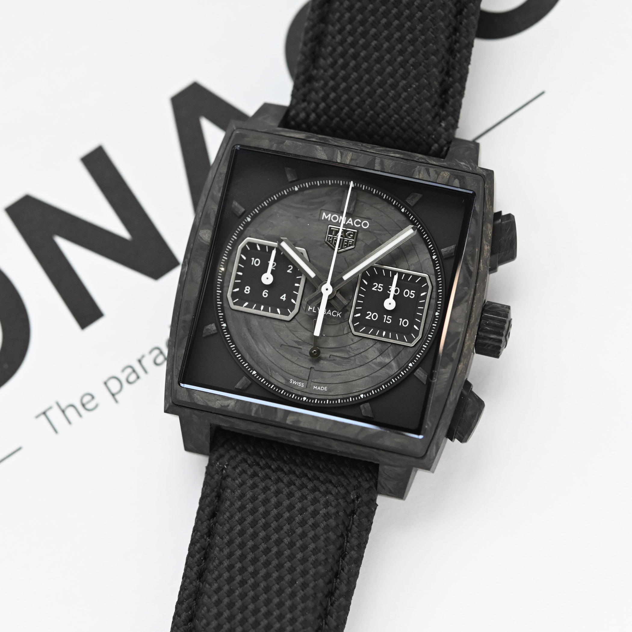 The watch is powered by the new COSC-certified Calibre TH20-60, an automatic flyback chronograph with an extended 80-hour reserve, now regulated by the TH-Carbonspring oscillator. The watch is worn on a black rubber strap with textile embossing, closed with a DLC titanium folding clasp, completing a stealthy but unmistakably Monaco look. Only 50 pieces will be made, priced at CHF 17,000, and they will be available from December 2025.