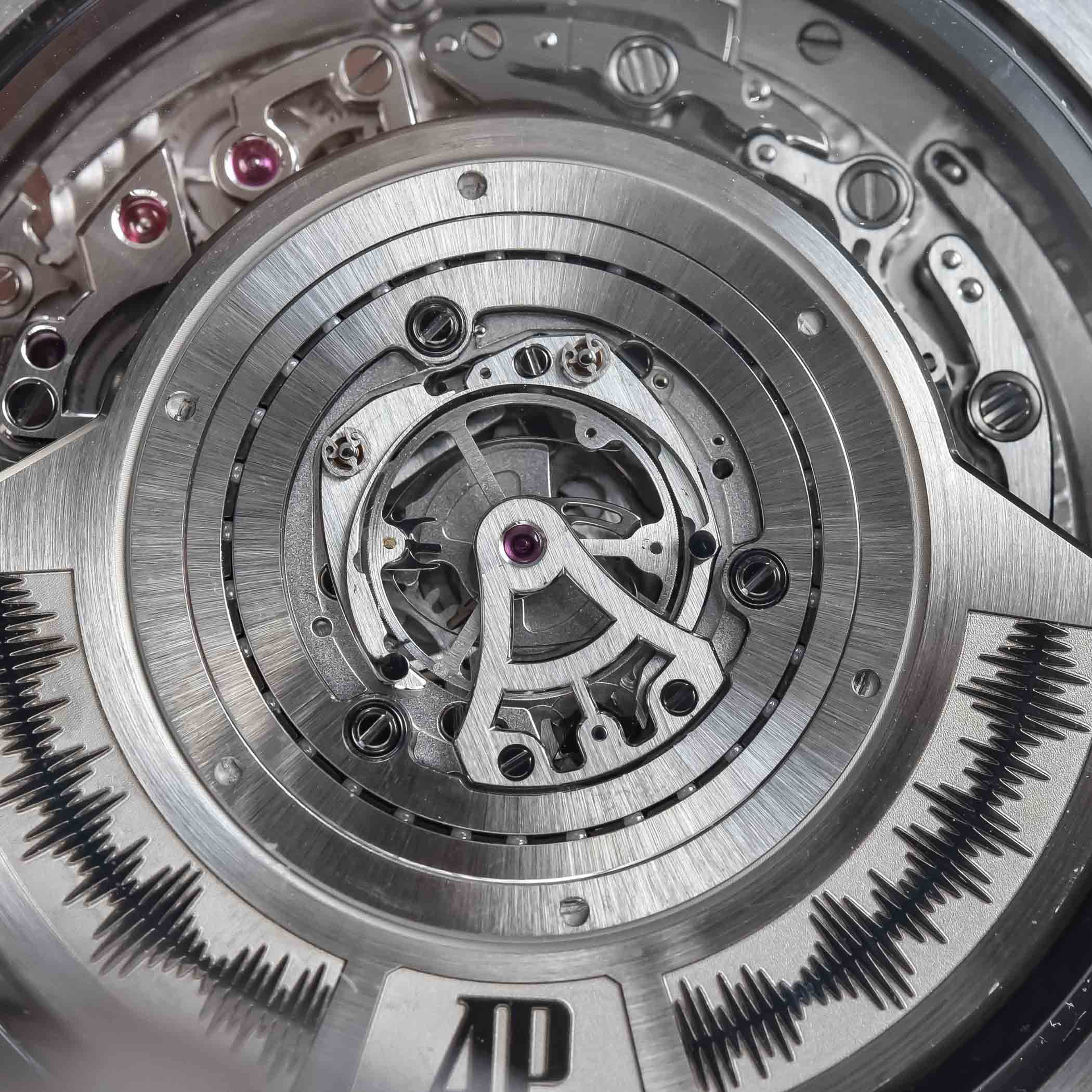For RD#4, the Supersonnerie tech used to achieve exceptional sound quality via gongs attached to the soundboard rather than the mainplate was redesigned and allows a view of the works. AP created the double caseback, with a thin “secret” vented cover to let the air in to amplify the sound and a 0.6mm thin sapphire crystal membrane component for the gongs. When the lid is opened using a lever under the crown at 3 o’clock, it reveals the split-seconds mechanism and the platinum oscillating weight with the engraved sound waves.