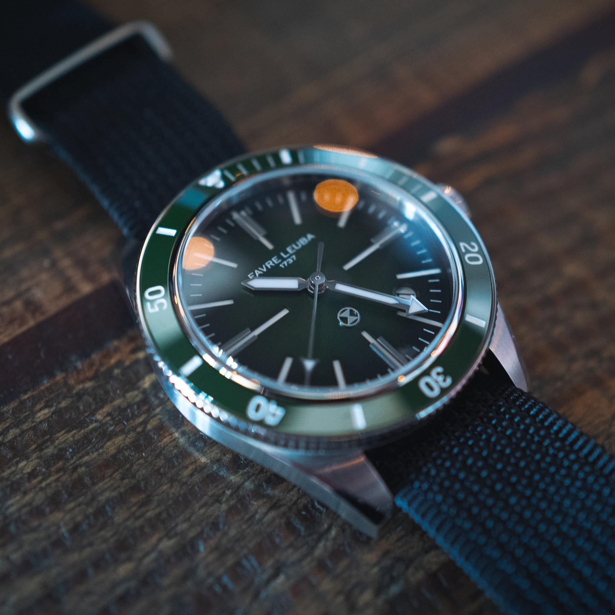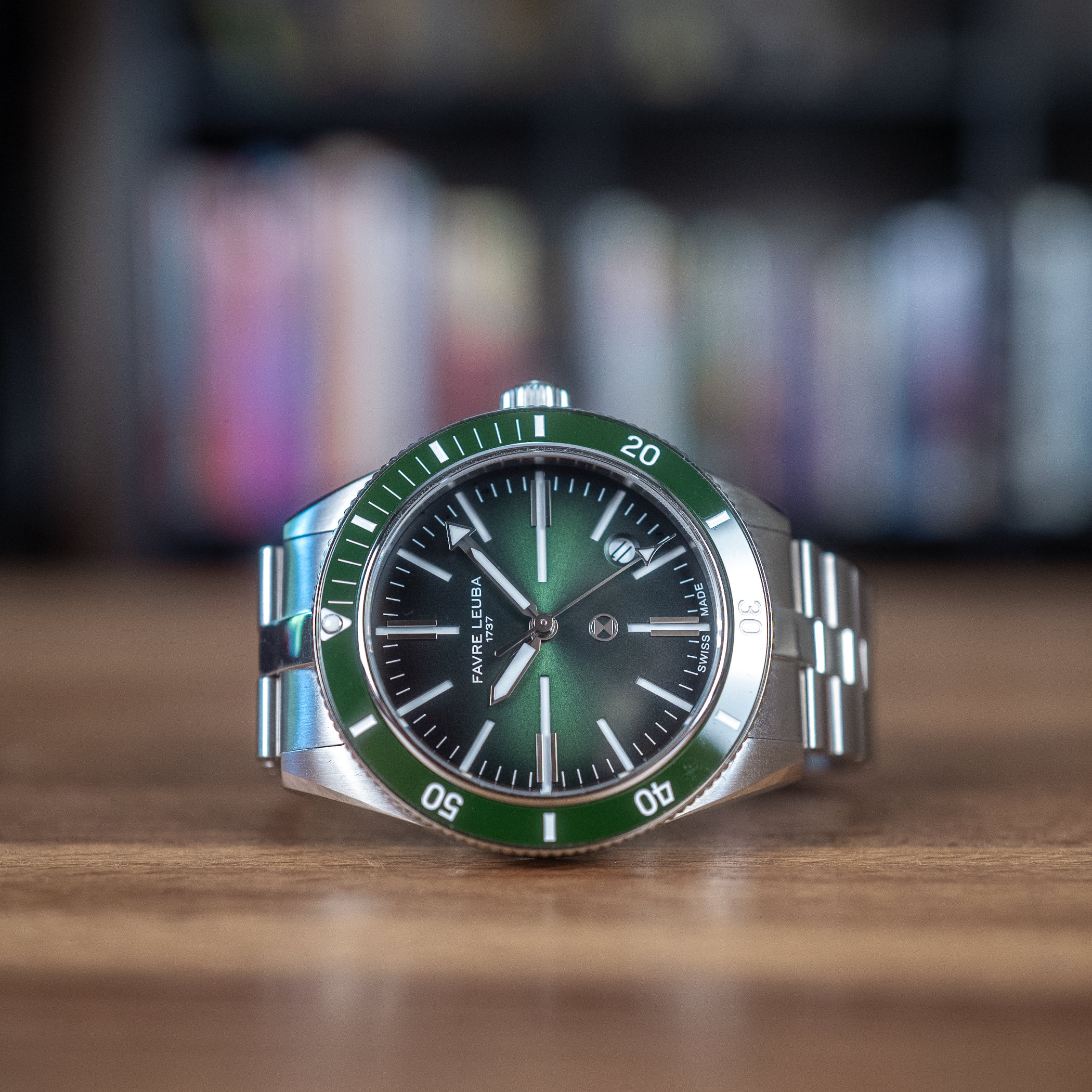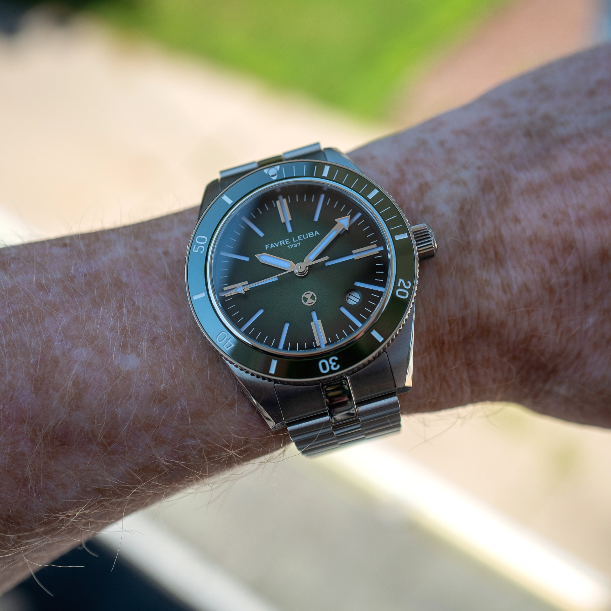 The dial of our version is a pleasing shade of green, situated somewhere between a Kelly green and a Forest green if I were forced to describe it. It has a very slight sunburst finish with a gradient that gets slightly darker as it approaches the edge of the dial. It’s constructed in a sandwich style, using cutouts for the indices that reveal a lumed layer underneath, always an interesting touch that adds a bit of depth to the dial. On that note, the lume is ample on the indices and the hands, making for a very legible watch in low-light conditions. You will find the “Favre Leuba 1737” text below the 12 o’clock position and their small hourglass-shaped logo above the 6 o’clock position. The hands are of the sword variety, and the minutes hand retains the arrow at the end, a design cue from the Deep Blue from 1960, and is a feature that I always love for inexplicable reasons. There is a circular date wheel, unobtrusively placed at the 4:30 position, and a very slightly domed sapphire crystal protects the dial.