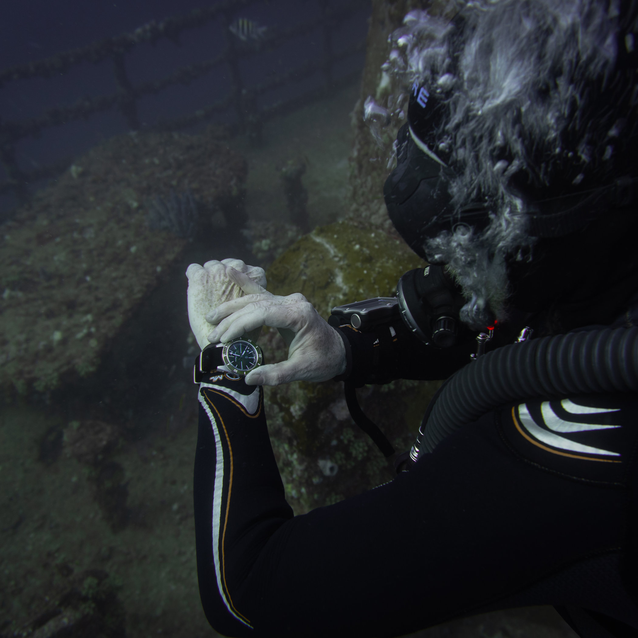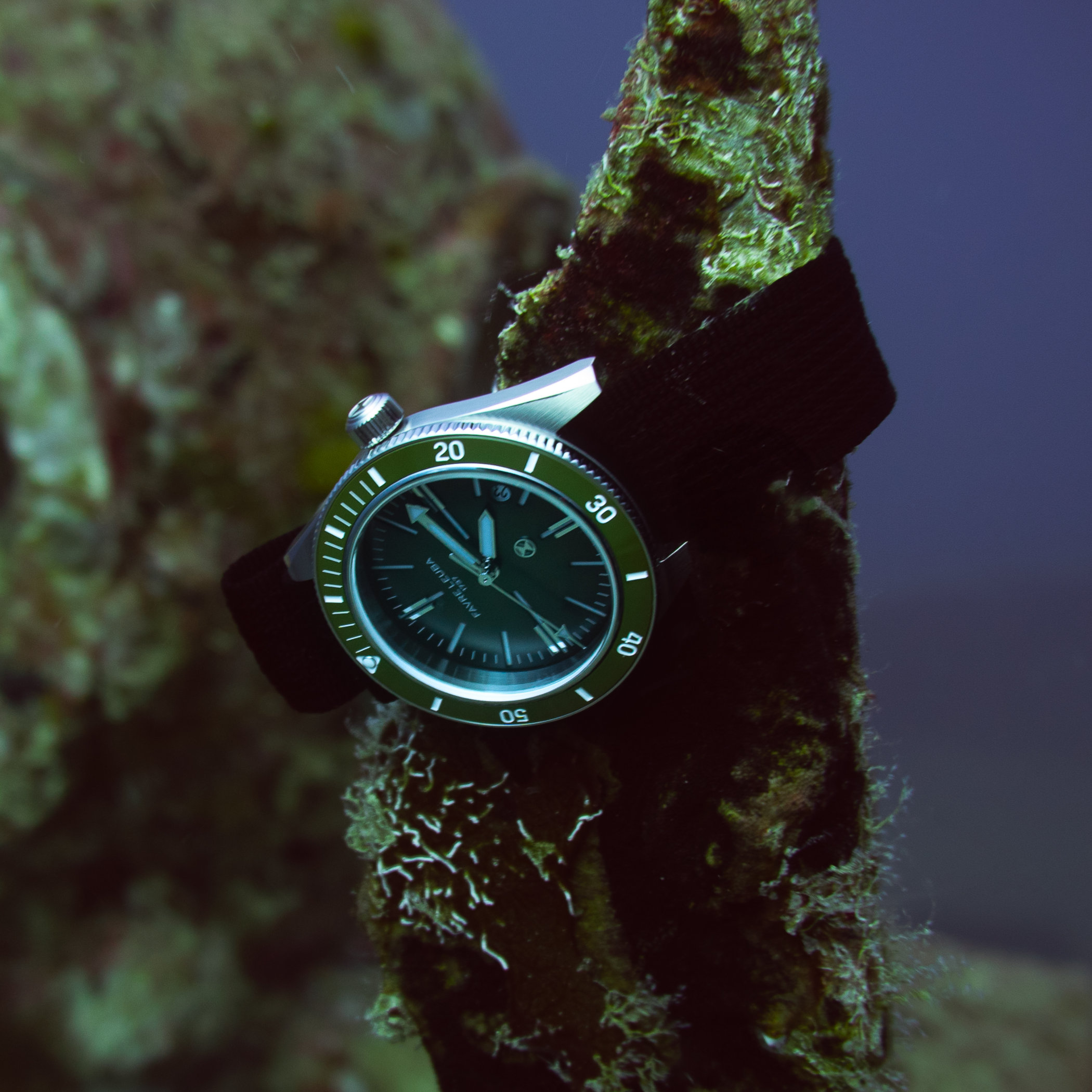 On the relaxing boat ride out to the dive site, the watch looked very cool and unique with its understated green charm. Strapped over a wetsuit, it performed its duties like a champ under the cerulean waters of the Atlantic. Setting the bezel with a gloved hand at the beginning of the dive was a breeze, and after that, the watch is left to its own devices, silently looking after you using only its steady heartbeat. Technically, green is one of the later colours of the spectrum to disappear at depth because of science, so green was still completely visible at our depth of about 100 feet on the wreck of the Lady Luck, an old 324-foot tanker sunk off the coast of Pompano Beach, Florida. Since we all know that fancy computers handle all the complex compression science and math for divers these days, the humble wristwatch gets to take a more relaxed position as a backup, and even more importantly as a bit of a relic on which one can meditate and be taken away from all the complexity and bells and whistles and get back to the simple purity of the pursuit of diving. Or at least that’s how it works for me, just don’t forget to breathe.