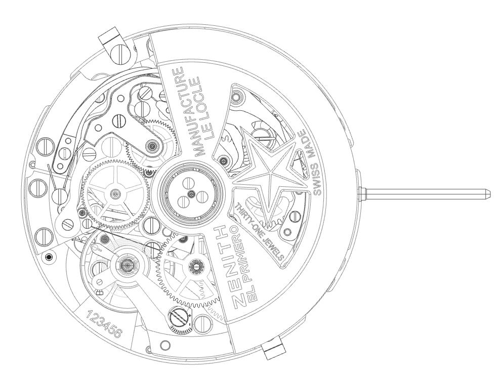 In 1998, the 400 Z and 410 Z movements introduced several modifications to enhance the El Primero line. These updates addressed a rare but potential issue where the juxtaposition of teeth could occasionally stop the watch when manually wound, leading owners to believe the mechanism was faulty mistakenly. The changes included a new design for the chronograph bridge and alterations to the seconds wheel and escapement. The seconds (fourth) wheel now featured 120 teeth and six arms, an increase from the previous 100 teeth and five arms. Additionally, the number of escapement teeth was reduced from 21 to 20, a blade was added to the pinion, and the horns of the lever fork were modified. Similar improvements were applied to the El Primero calibres 405 Z and 420 Z, with the latter being a notable curiosity as a manually wound version introduced in 1993.