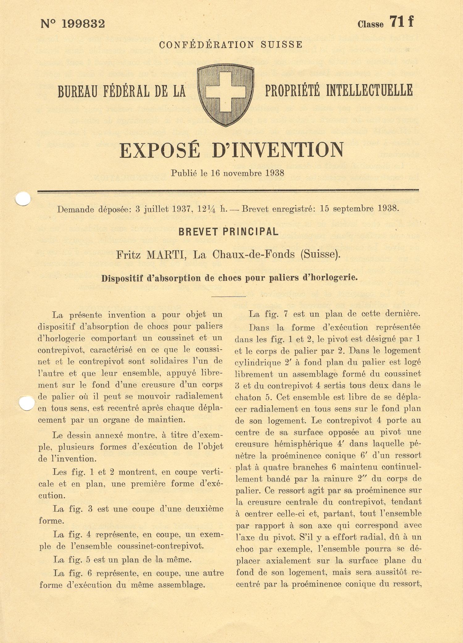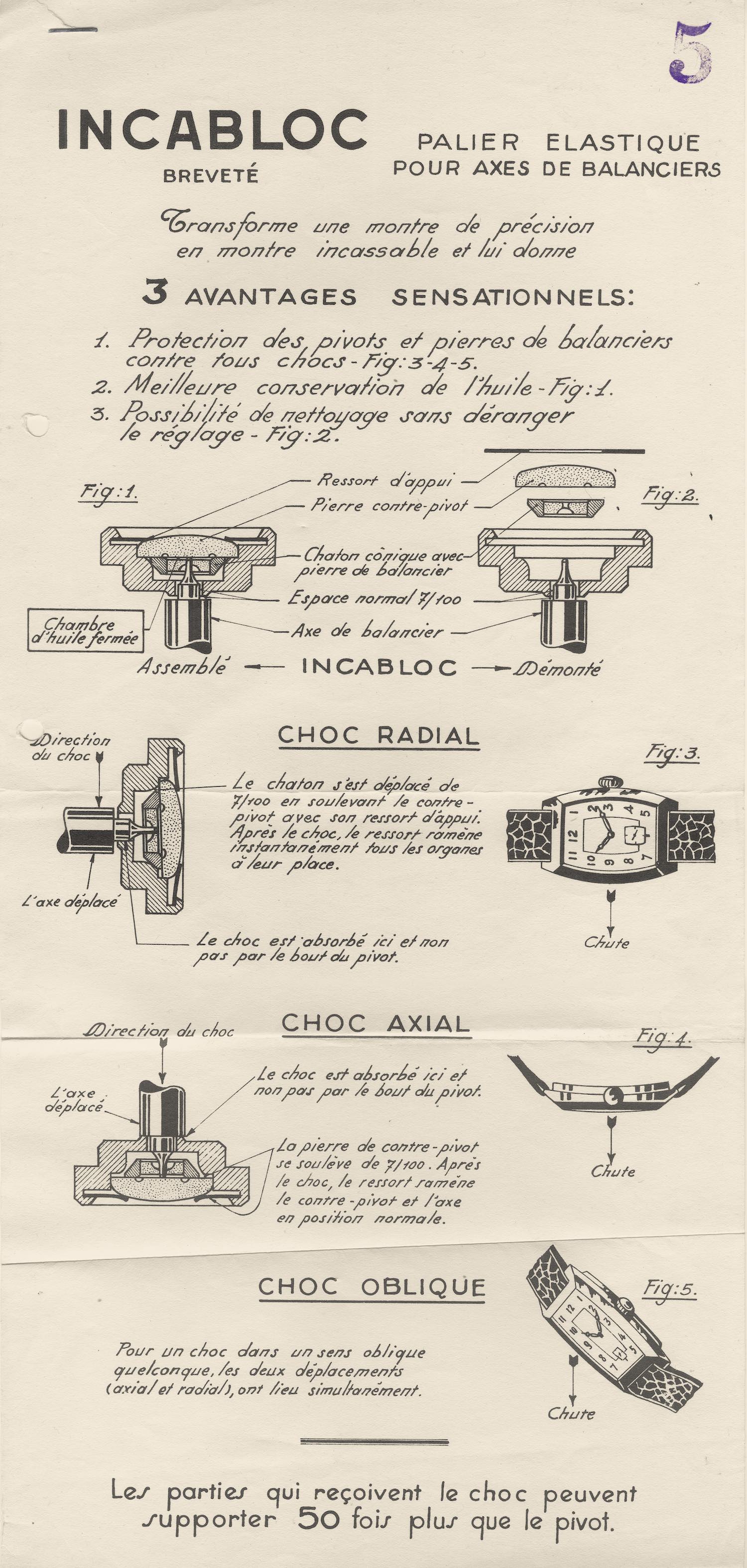 However, Incabloc was not originally a company but rather a product. The invention was patented in 1929 by Fritz Marti who had imagined this system based on “mobile balance-staff jewels”. In 1931, together with Georges Braunschweig (whose family owned Fabrique Election SA), he established Porte-Echappement Universel SA, better known since 1963 as Portescap SA, in La Chaux-de-Fonds. On March 1933, Portescap patented a more elaborate system with a cone-shaped construction, which allowed absorbing both lateral and axial shocks with one single spring. It was registered under the Incabloc trademark.