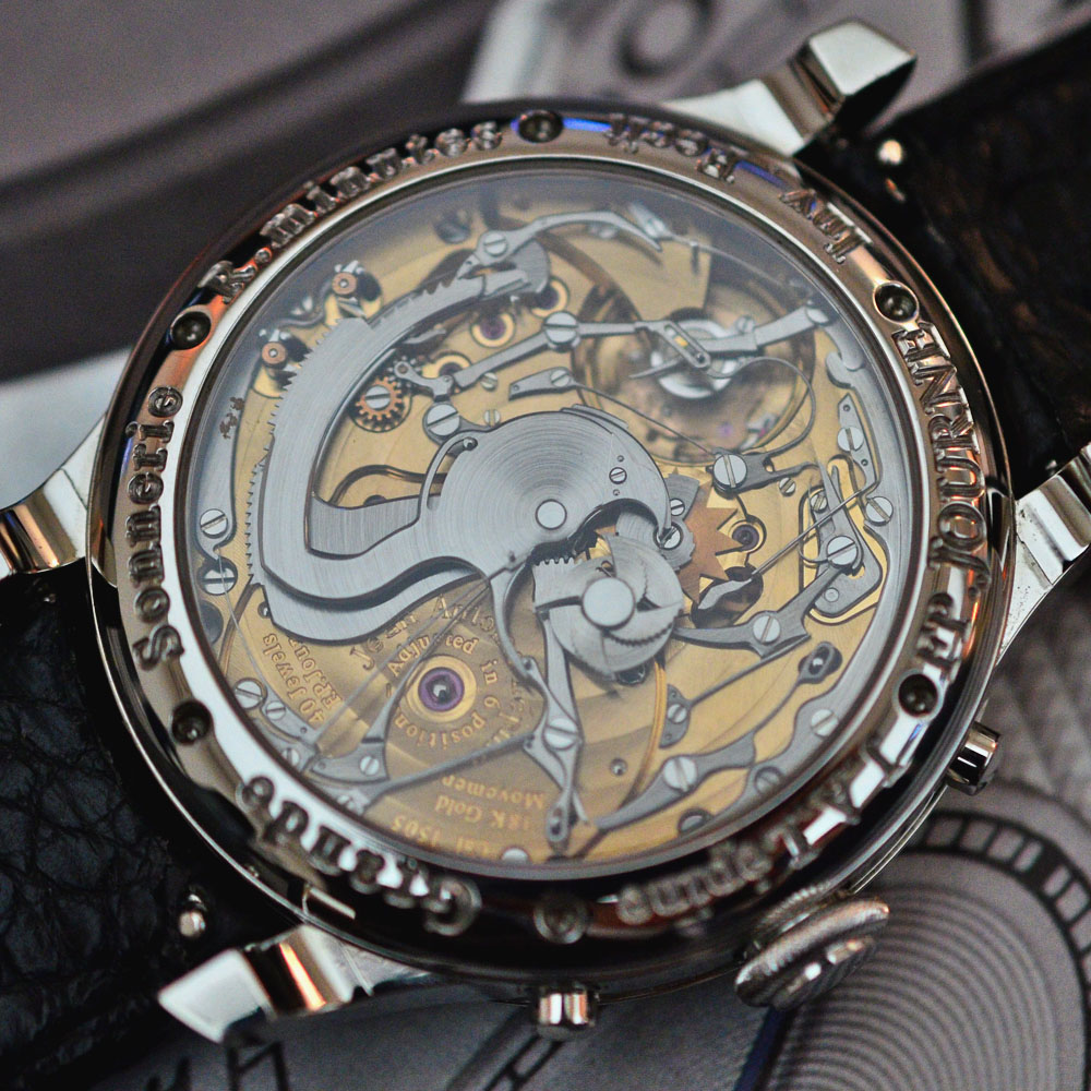 The Upside Down perfectly sums up Ludovic’s philosophy of creating very complicated timepieces with a high dose of eccentricity whilst remaining true to traditional techniques and craftsmanship. In his watches, the dial doesn’t always hint at the complexity hidden on the reverse side of things. In 2014 I had the pleasure of spending quite a bit of time with an Upside Down. As anticipated, most of the people I showed it to enjoy the whimsical dial but had no inkling as to the complexity beneath.