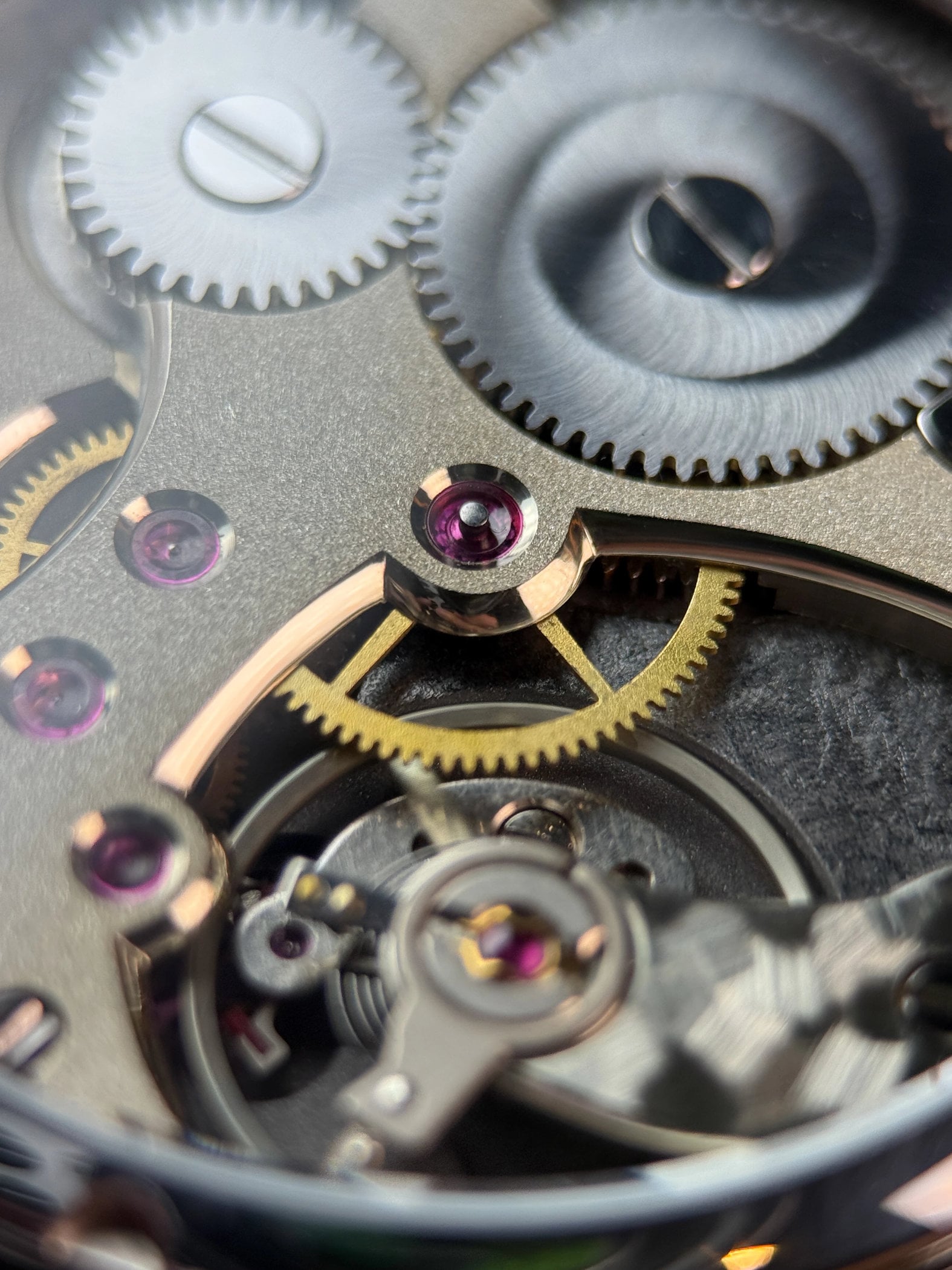 For the watchmaking aspect, I have to reset the jewels with the appropriate amount of endshake, at times adjusting them to the micron level to ensure the movement’s performance. Proper lubrication is an often overlooked area too; I have to grease the keyless works and the ratchet mechanism with the perfect amount for the best tactile experience possible with the base 6498 components. I take extra care with the jewel pivots, as too much oil would not only affect performance, but might cause the oil to run onto the surface plates and tarnish them, which I have seen happen to other, much more expensive watches.
