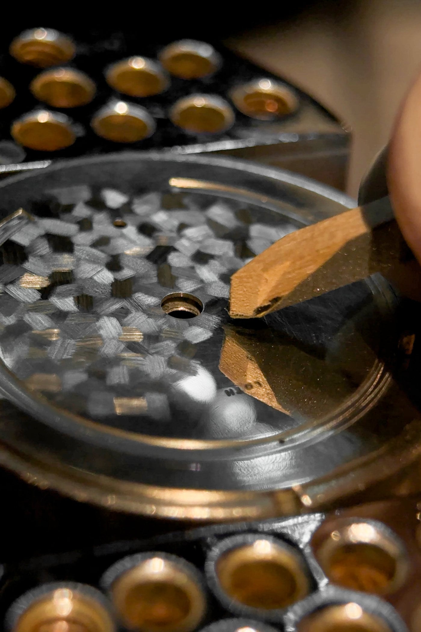 This is a variation of the traditional grattage finishing, which I term “mosaic” finishing. To achieve this, I made my own homemade cabrons, which are lapping paper adhered onto wooden sticks, and cut the ends into the desired shape I want. I subsequently apply each scrape to the dial by hand, while also regularly refreshing the abrasive end by recutting the cabron every few strokes. As adjacent strokes cannot be facing the same direction, this method requires me to plan 4-5 steps ahead to make sure I don’t “checkmate” myself.
