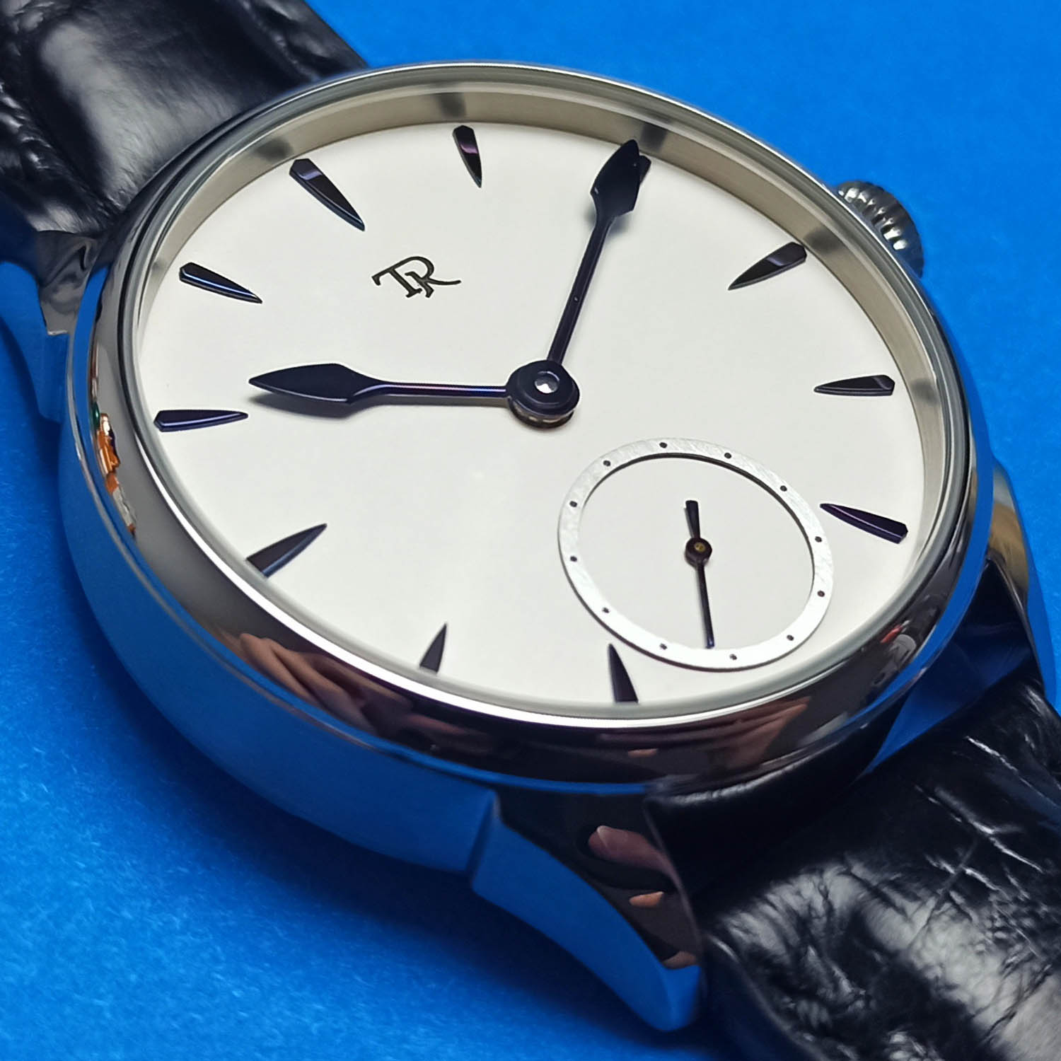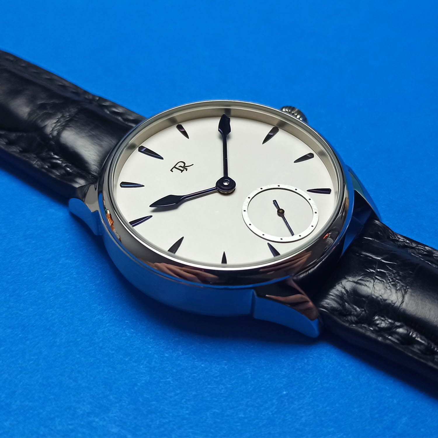 The dial is entirely handmade by himself. So far, a couple of variations have been introduced, including off-white, gold or rhodium plated versions. The polished and optionally blued hour markers are shaped like arrowheads, as are the tips for the central hour and minute hands. The hands are either polished or polished and then blued, depending on the dial colour. The sub-dial is finished with a handmade seconds track, applied to the dial giving it some depth. He uses a top grade 6498 with Geneva striping and blued screws. The Arrow is worn on an alligator leather strap in black.