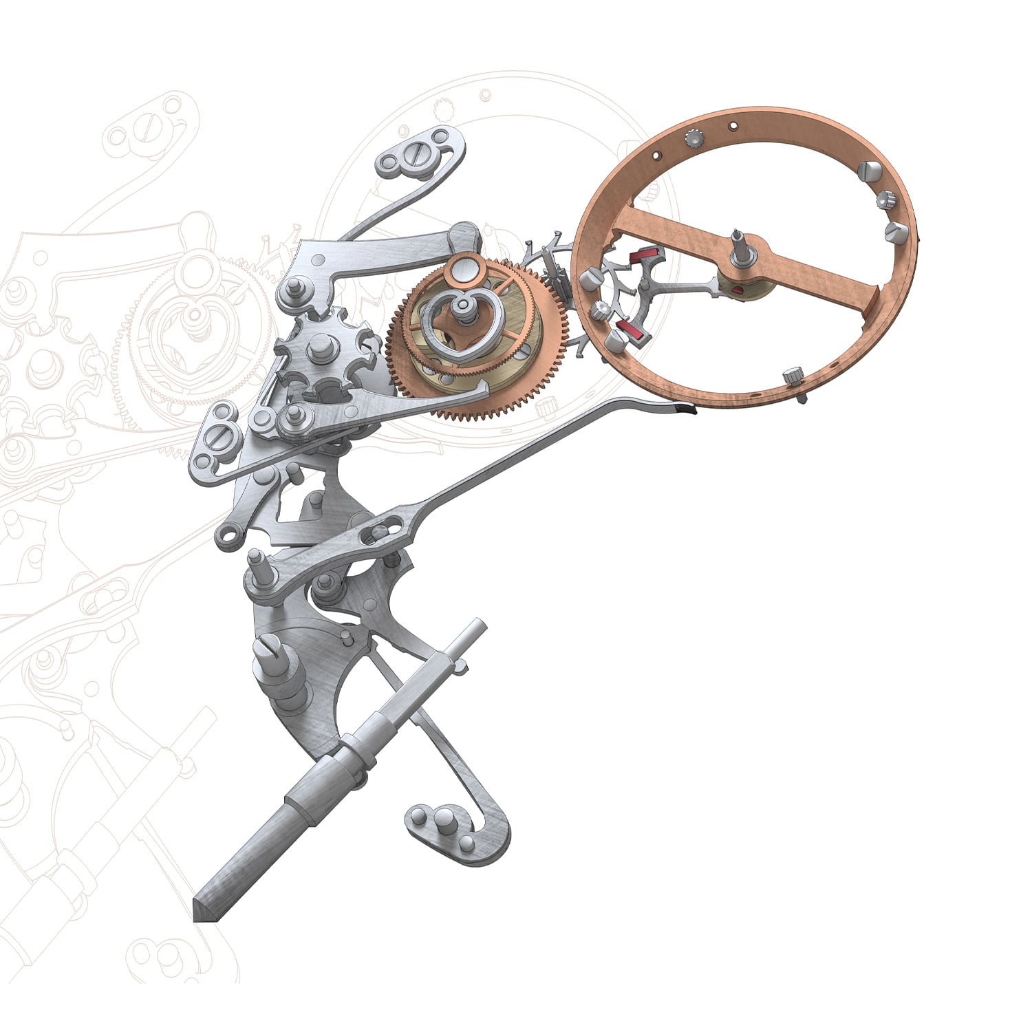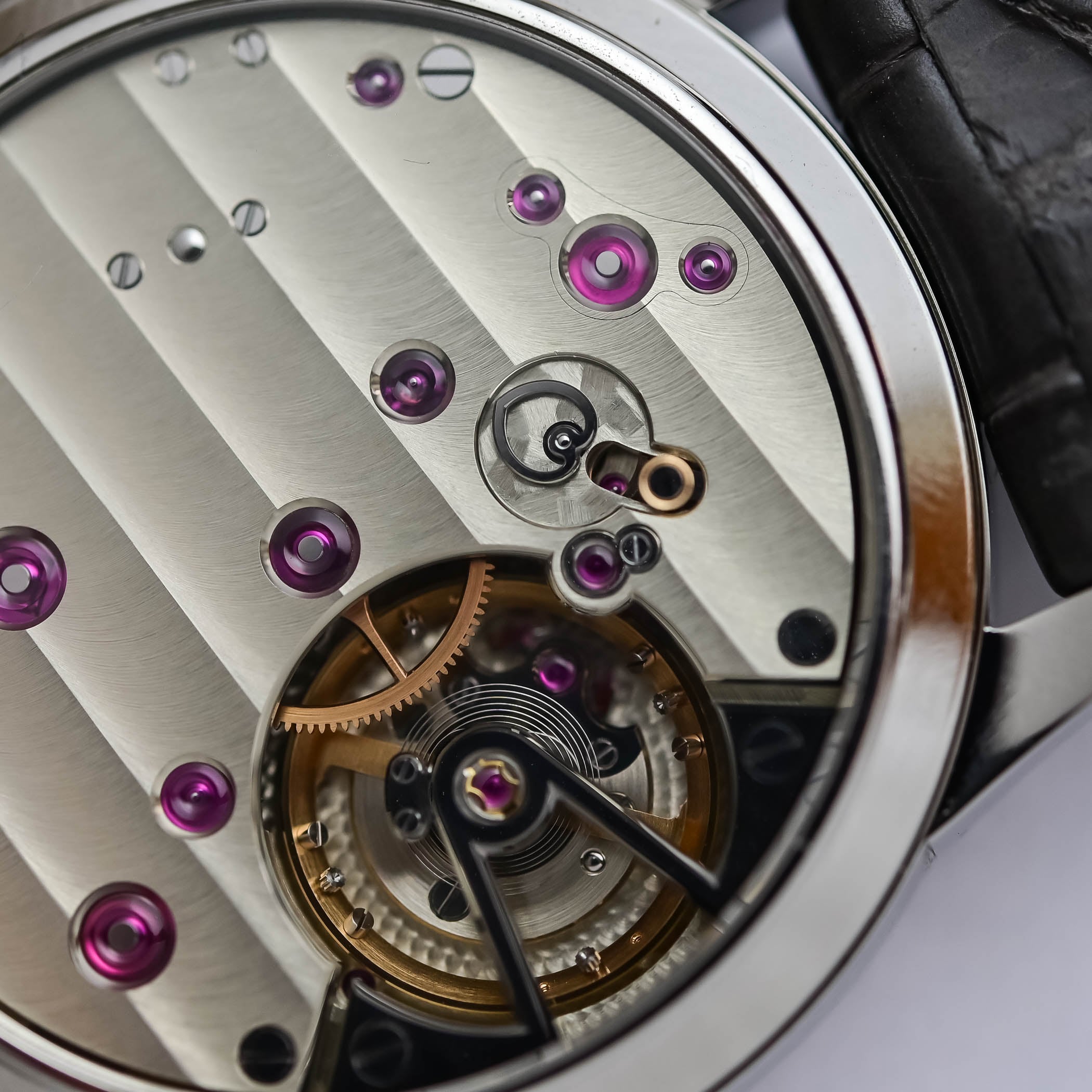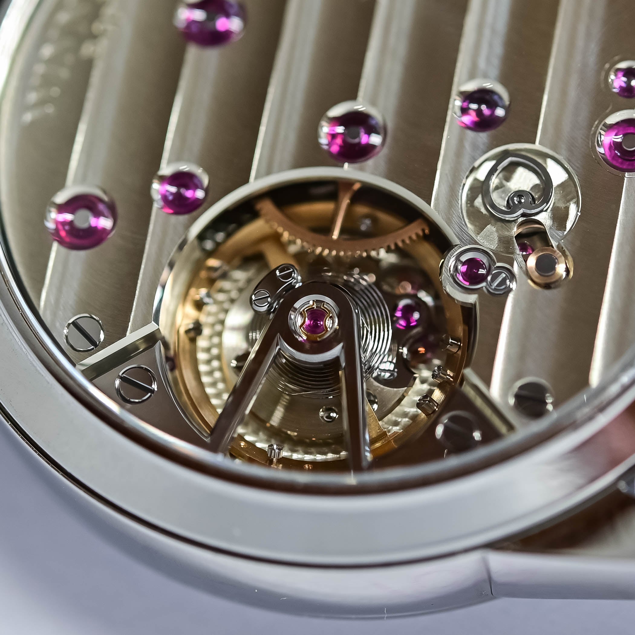 The escapement is a modified Swiss lever type, and the balance follows the same architecture as the first model, featuring an inclined rim set at a 45-degree angle. It is fitted with four inertia screws for balance and four additional regulation screws.