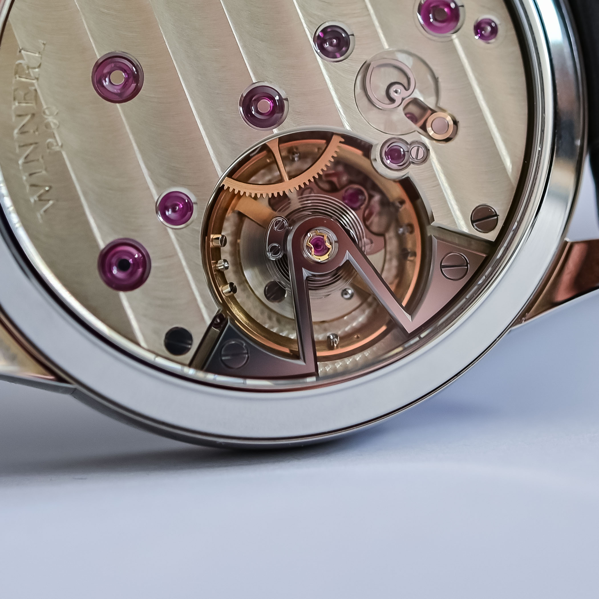This zero-reset function is particularly relevant for a precision instrument. When the crown is pulled, the seconds hand instantly returns to zero, allowing for precise time-setting. It will only restart once the crown is pushed back in. The system is controlled by a column wheel and operates through a differential that ensures the reset occurs without disturbing the movement’s rate. The heart-shaped cam responsible for this action is visible through the caseback – a deliberate aesthetic and historical reference, as such components were already present in some of Winnerl’s early chronograph work.
