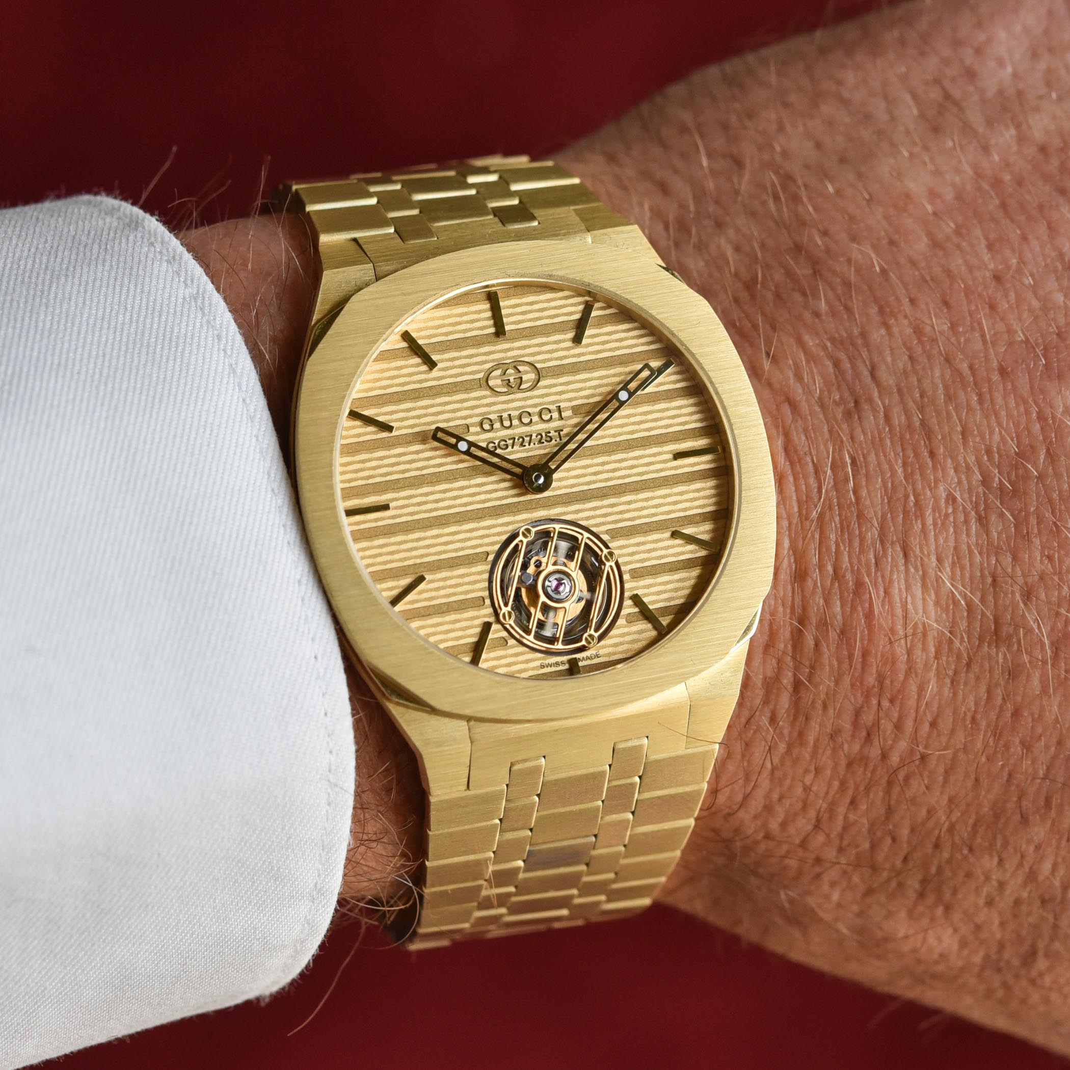Quick facts – Gucci 25G Tourbillon: 40mm x 8mm – platinum or gold case – sapphire crystal – exhibition caseback with sapphire crystal – water-resistant to 30m – automatic calibre GUCCI GG727.25 with micro-rotor – 21,600vph – 60-hour power reserve – integrated platinum or steel bracelet with butterfly clasp – EUR 170,000 in platinum and EUR 120,000 in gold