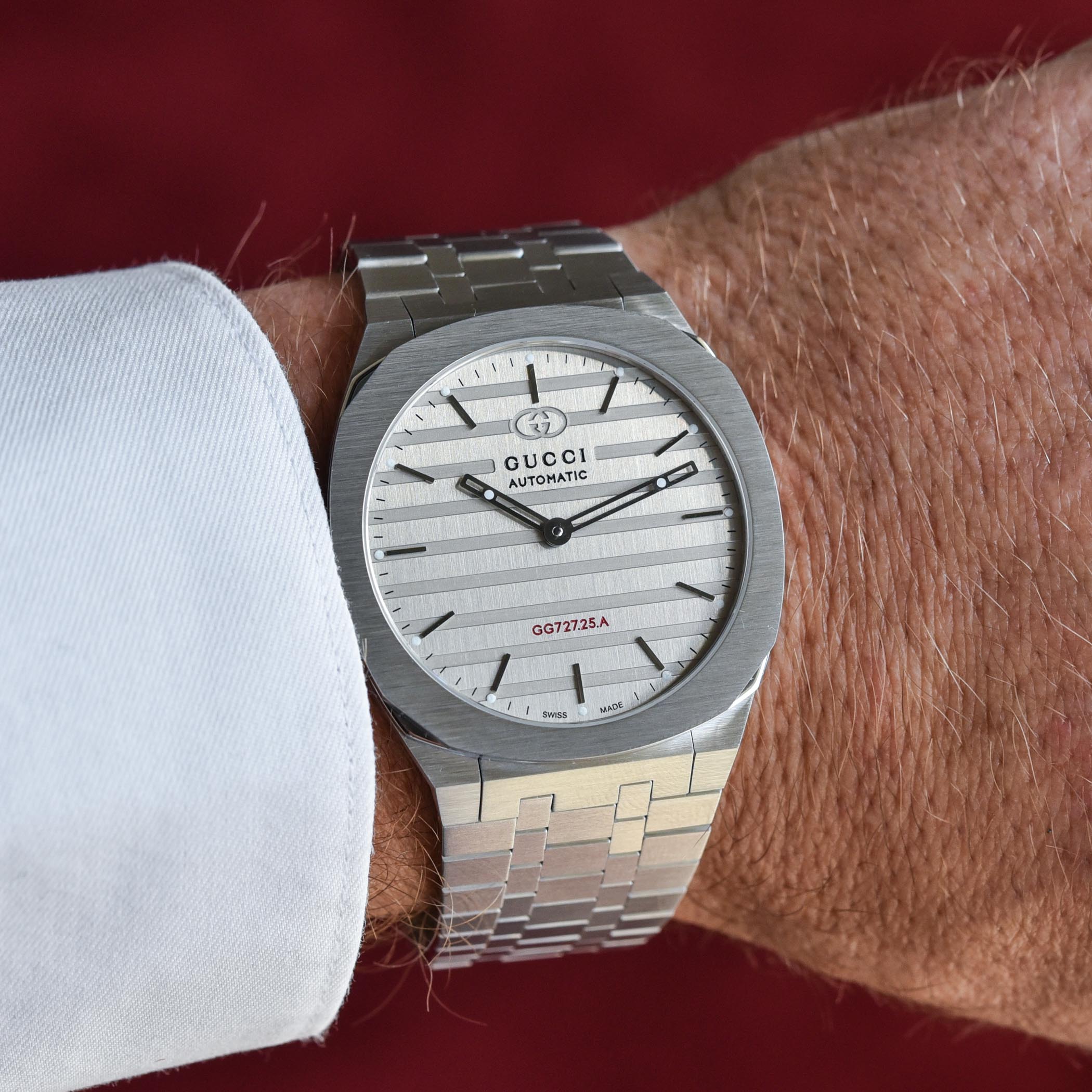 Quick facts – Gucci 25G Time Only: 40mm x 7.2mm – stainless steel case – sapphire crystal – exhibition caseback with sapphire crystal – water-resistant to 30m – automatic calibre GUCCI GG727.25 with micro-rotor – 21,600vph – 60-hour power reserve – integrated steel bracelet with butterfly clasp – EUR 8,200 and EUR 10,500 with a diamond-set bezel