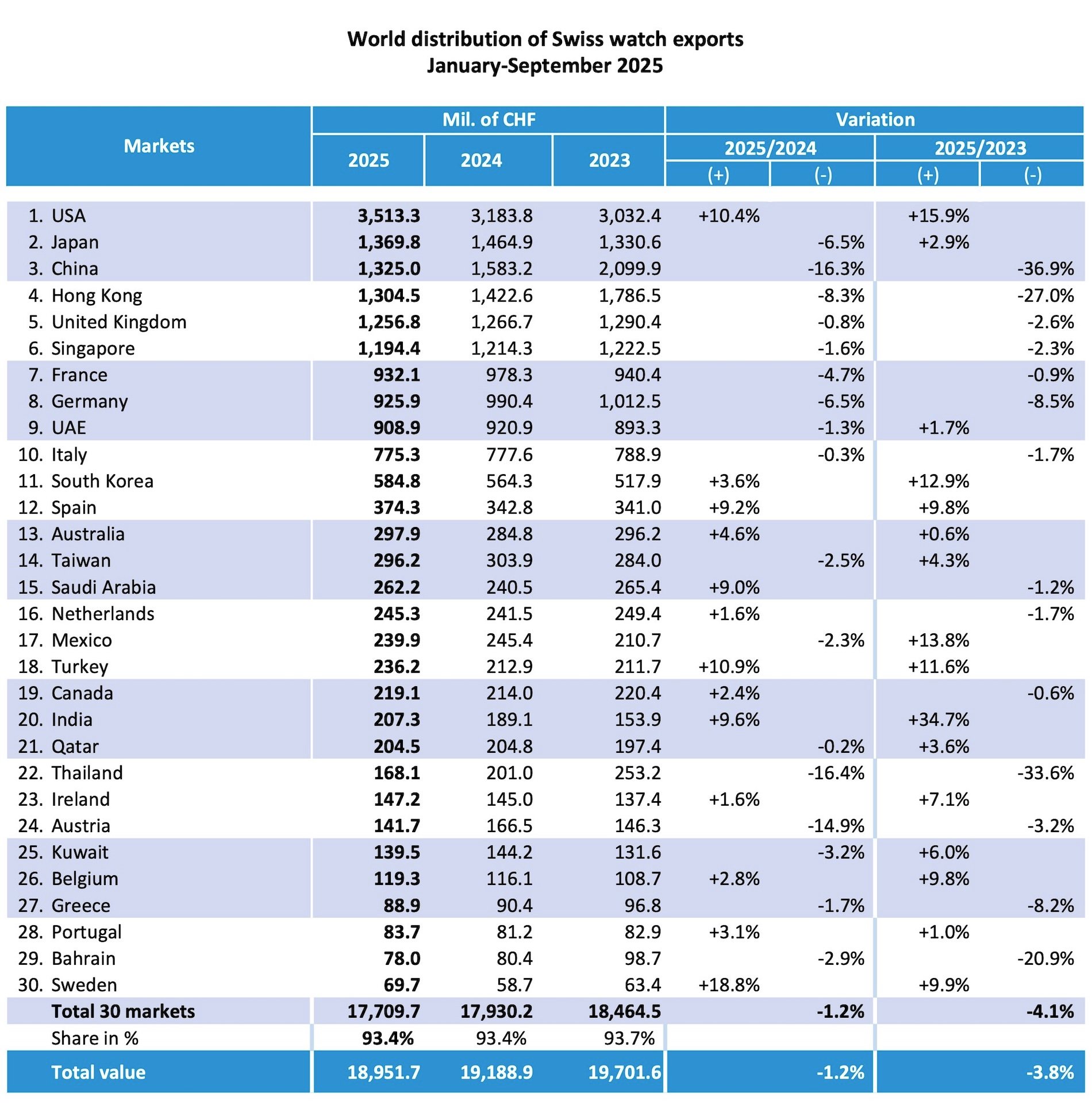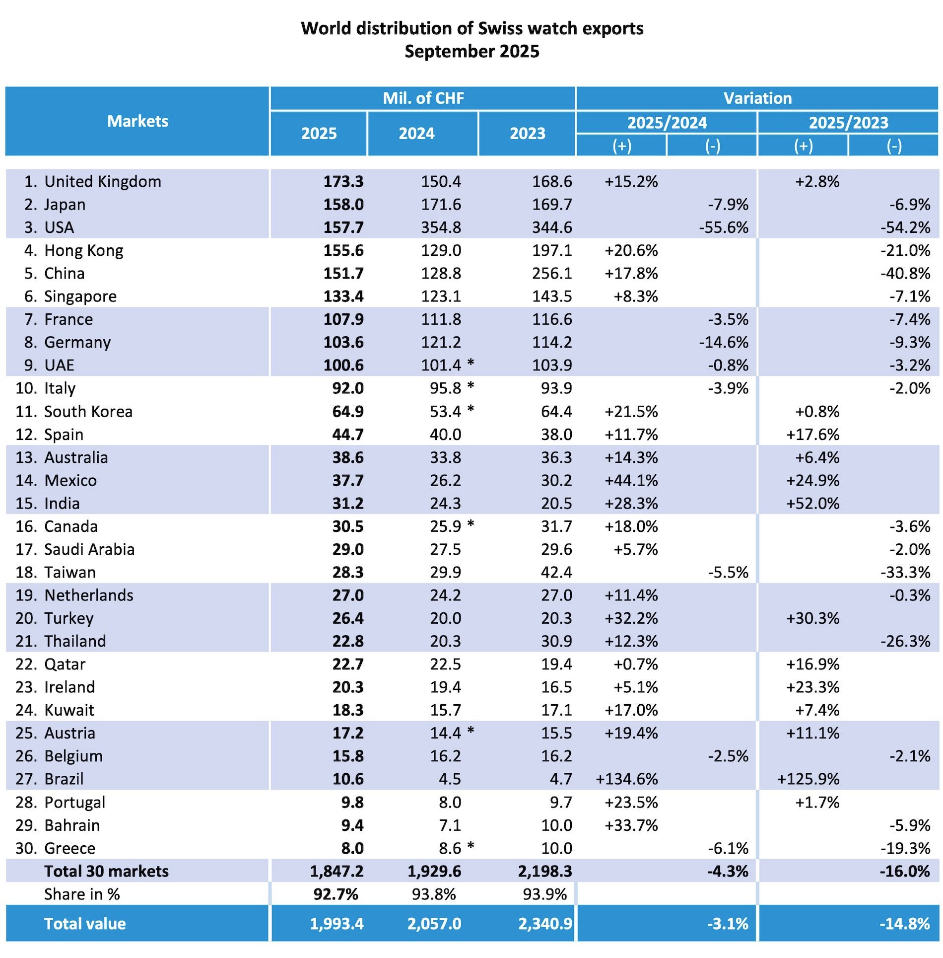 While the United States is one of the most important markets for the watch industry, it is thankfully not the only one. Growth has been reported in the United Kingdom, now the number 1 market for Swiss watch exports. With exports at CHF 173 million, exports were up 15.2% in September 2025, and a relatively stable performance on the first 9 months of the year, at -0.8% compared to the same period in 2024.