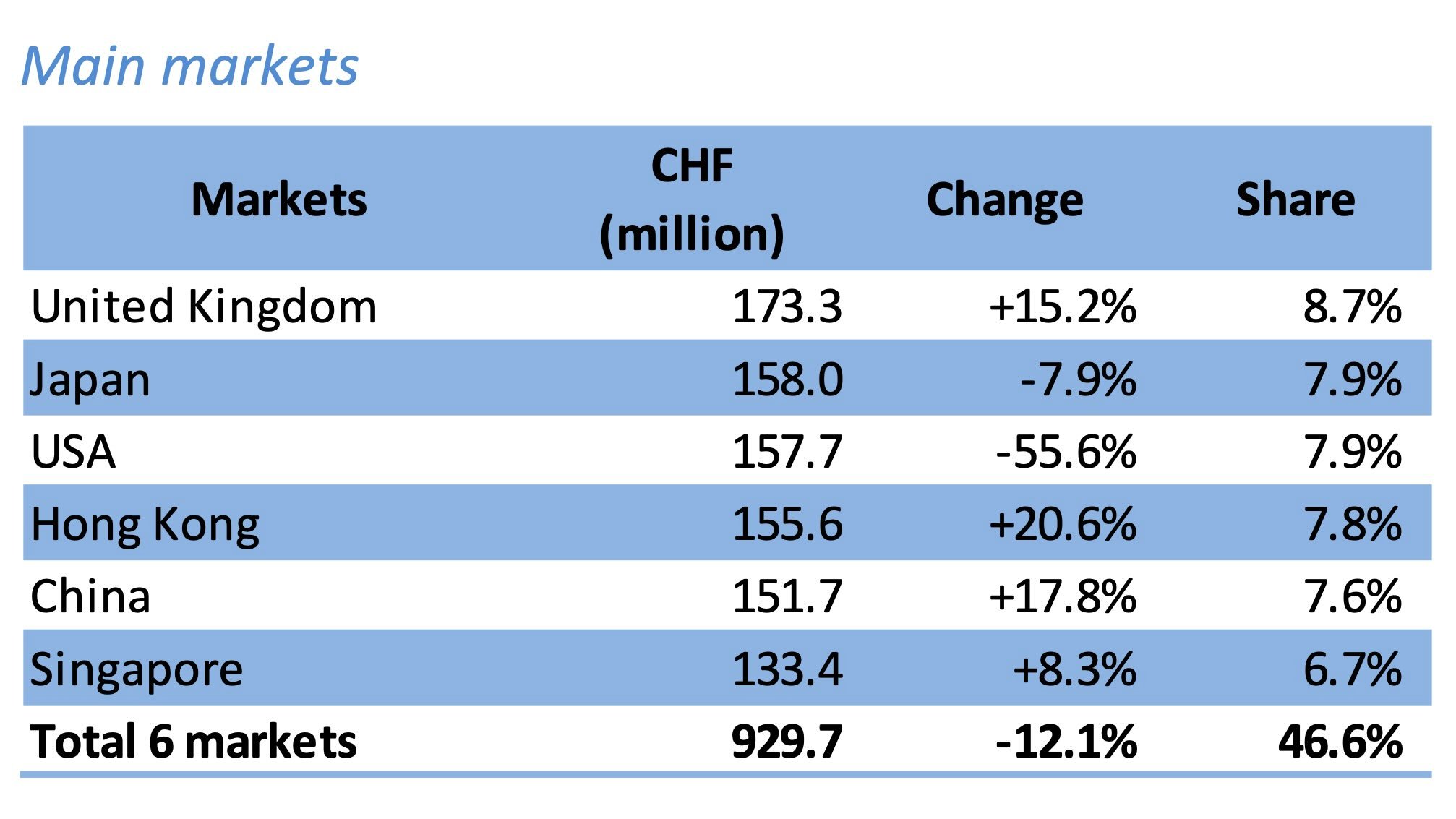 Possibly as a consequence of the application of tariffs in the United States, two neighbouring countries, Canada and Mexico, both reported impressive growth in September 2025, respectively increasing imports of Swiss watches by 18% and 44%. India also reported a boom in imports of 28%. Finally, despite a weak performance, Japan continues to move up the list of the main importers of Swiss watches, now the second-largest market, up from fifth place.