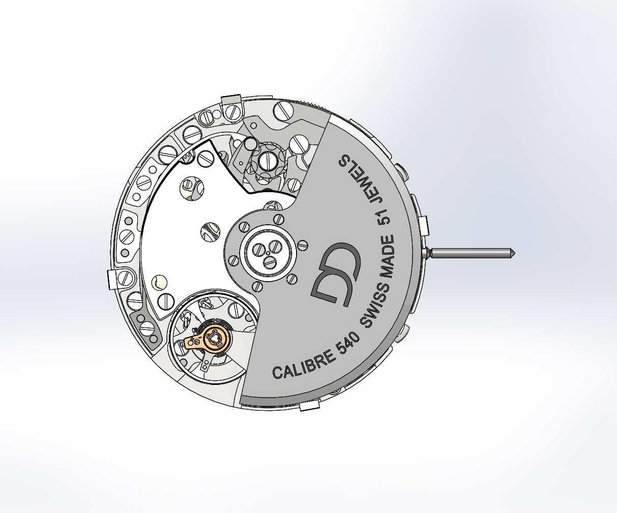 With the calibre 540, Dubois-Dépraz opted for a high-grade construction with column-wheel and horizontal clutch. All of its modules feature a vertical clutch design, but Dubois-Dépraz chose this traditional solution for its chronograph movement. It is paired with a shock-protection device efficient up to 1,500G. This 32mm x 6.60mm calibre allows for a large date indication that jumps instantaneously. The calibre 540 ticks at 28,800 vibrations per hour with an assortment coming from Nivarox. The power reserve is in excess of 72 hours. Naturally, different finishing options are available.