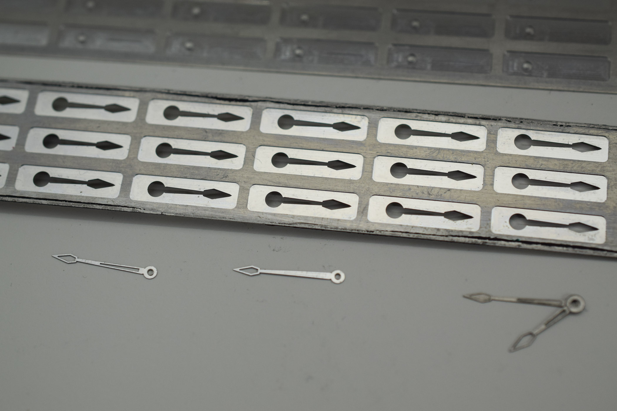 Machining is a process in which a tool (milling and drilling) removes material from a piece of raw metal to obtain the desired shape. It is used for the serial production of plates and bridges, to create their complex shapes with precision. These are crafted from metal plates (named barquettes for those eager to build their French watchmaking vocabulary). Some are machined dry or with oil to lubricate and keep the piece at a stable temperature.