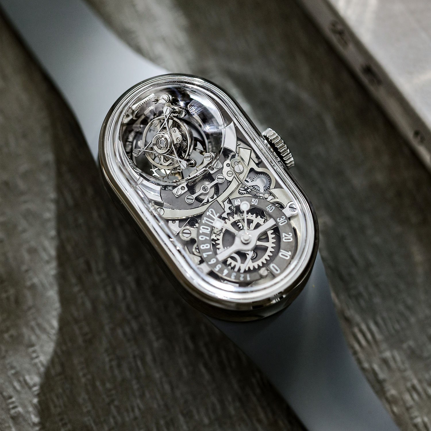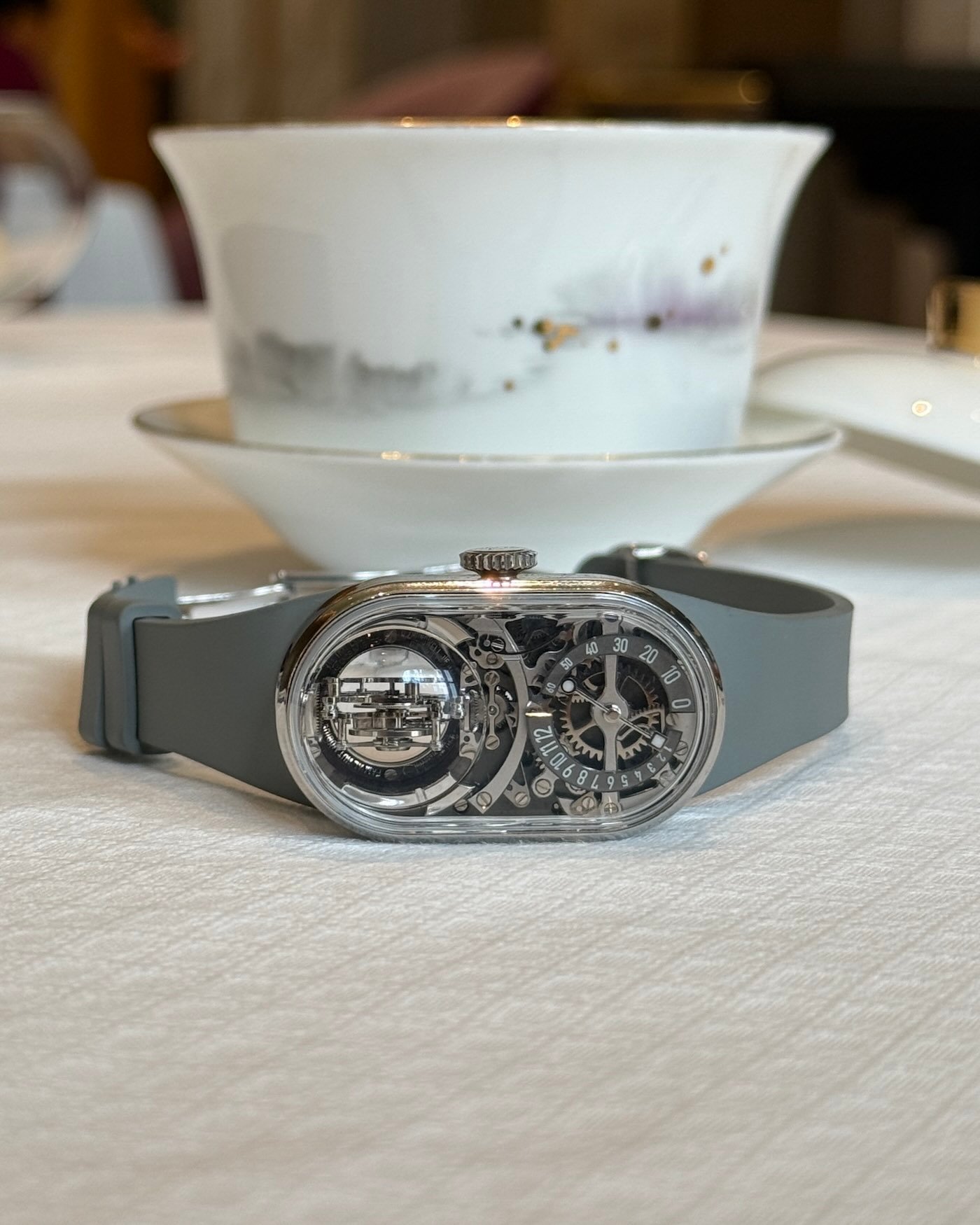 Originally designed in Chongqing and now produced in Fam Al Hut’s new Shanghai manufacture, their prize-winning Möbius combines a bi-axis tourbillon, retrograde time indicators and a jump hour complication in a compact movement housed in an unconventional capsule-shaped case. Its lug-less architecture, curved profile, and elevated sapphire dome highlight a deliberate focus on miniaturisation and spatial efficiency, resulting in an openworked timepiece that’s aesthetically fresh, uniquely distinctive and unexpectedly wearable. [Full disclosure: I’ve ordered one for myself.]