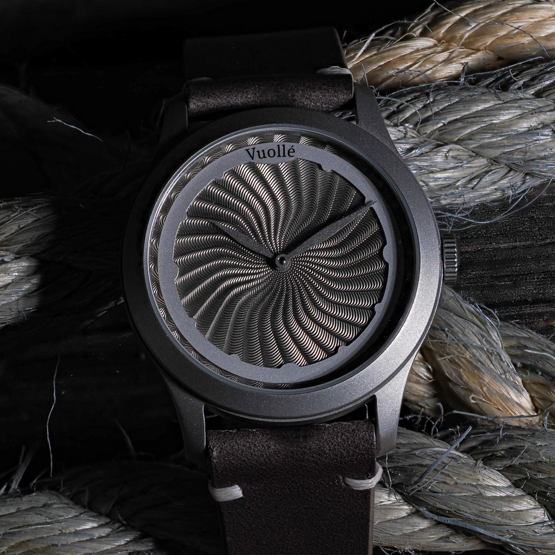 Our first model name, Kurimus, is an old Finnish word that translates as whirlpool or maelstrom. We named it Kurimus due to the pattern of our guilloche dial, mimicking the looks of a whirlpool or maelstrom. You can also see specific “rawness” or “robustness” in Kurimus, like the different greyness levels and surfaces.