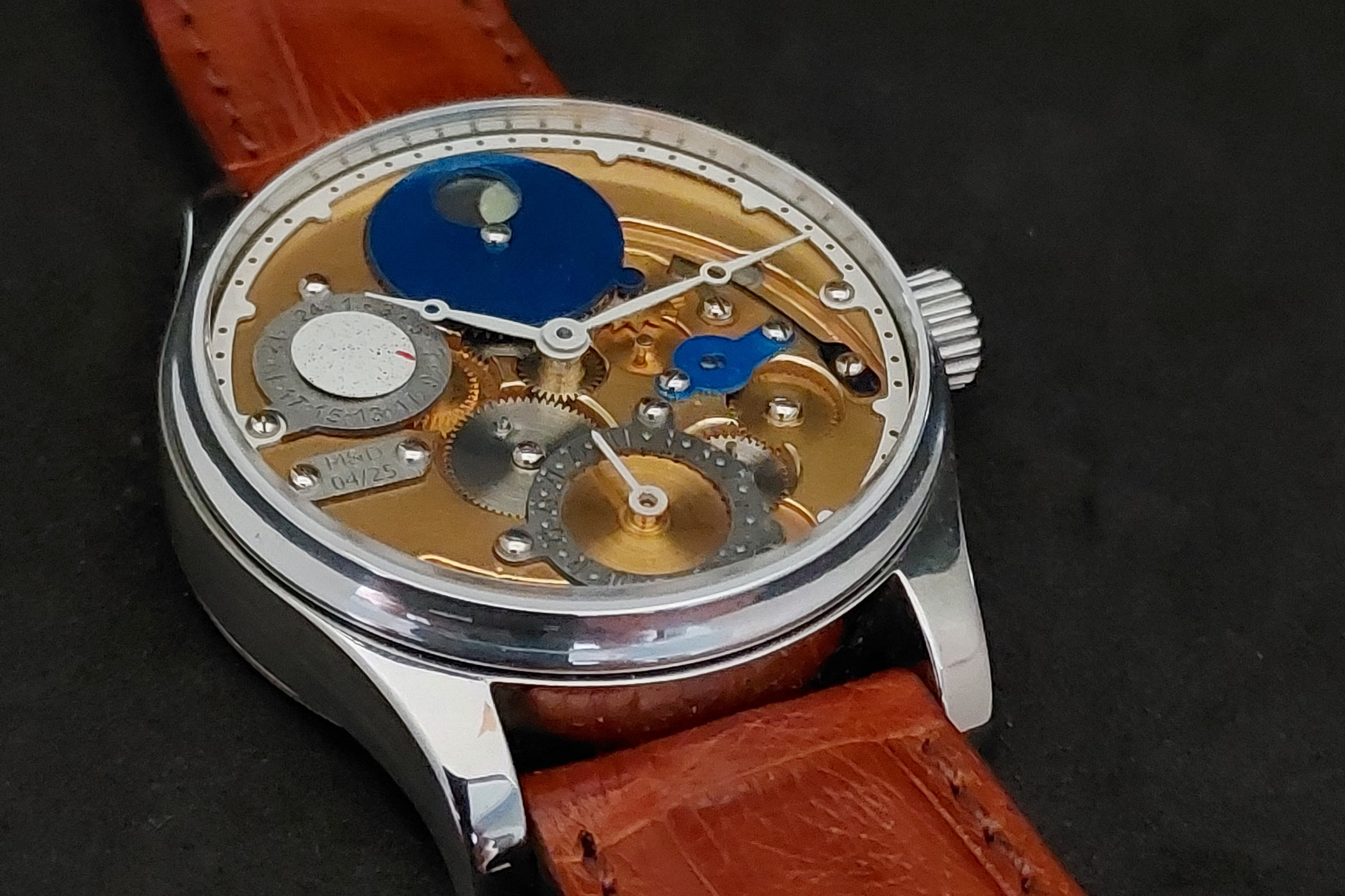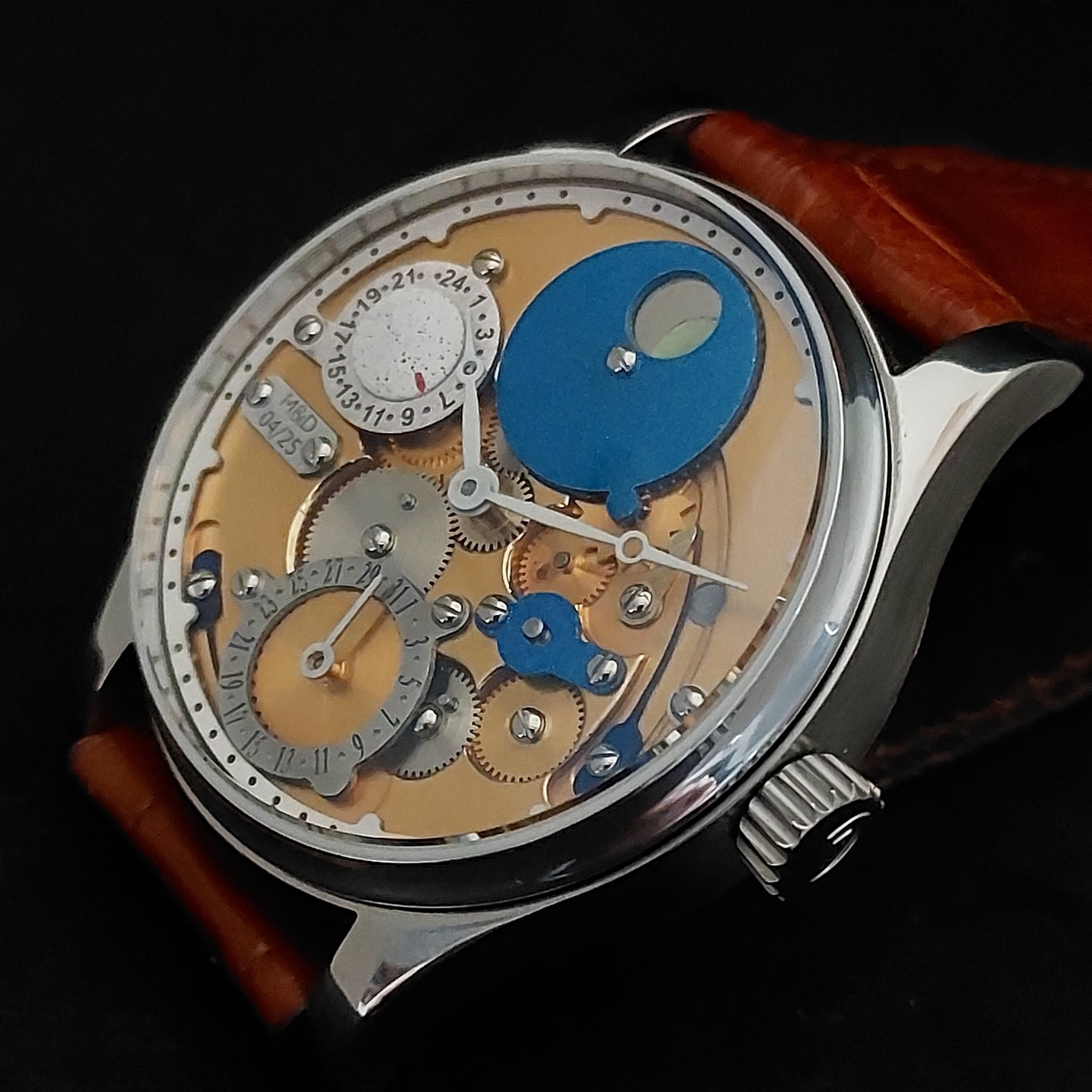 My philosophy is that most components should be visible just to show what is in a watch to make a complication work. From this premise, I made the moon phase base. This model will be built in a series of 25 pieces.
