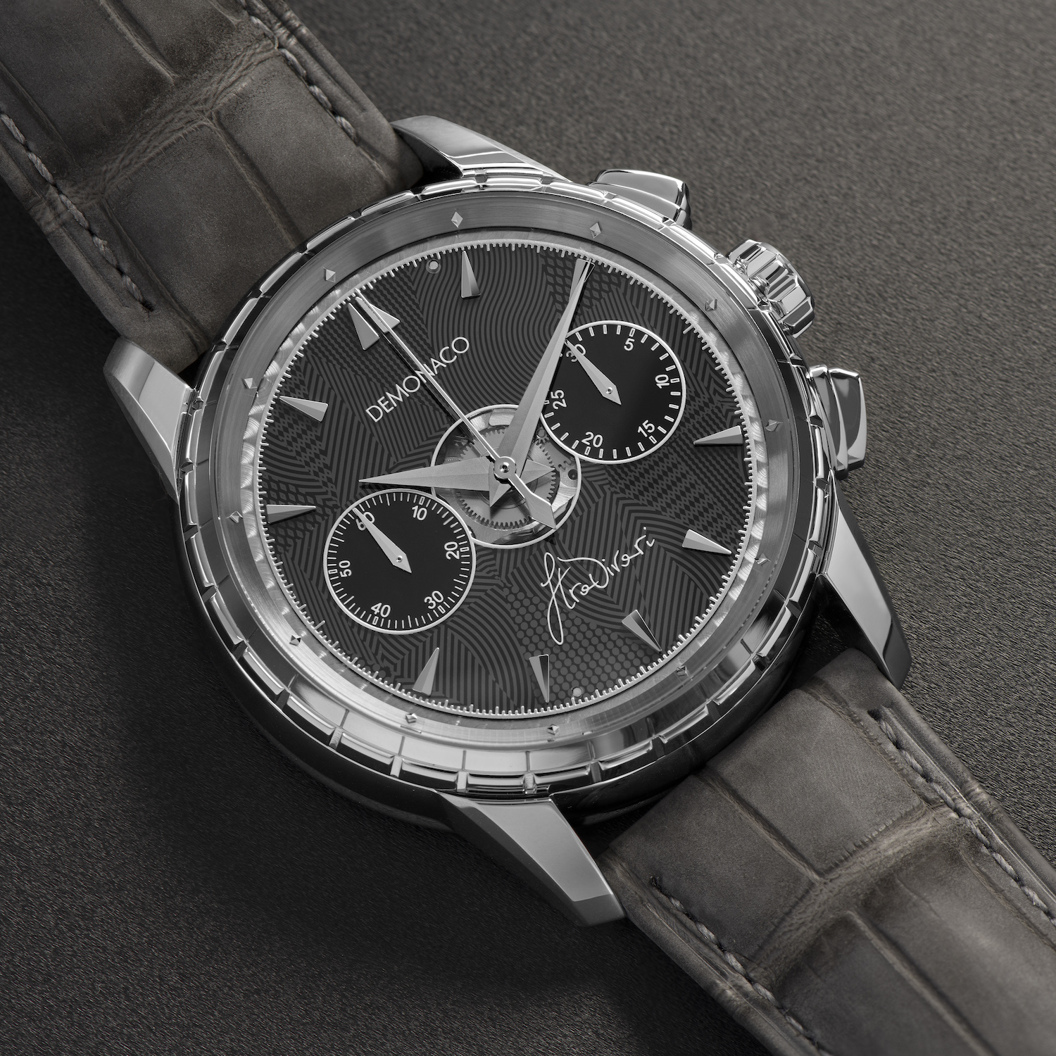 Yes, we joined forces with the Italian car manufacturer Prato, for example. Our Admiral Chronograph Flyback Prato was inspired by their V8 tuned Indycar based on a Chevrolet with 900 hp and an 8.3-litre motor and a glass hood. Our watch has a forged carbon dial, including gold particles mixed with resin. When you put that under a 2,000 bar pressure and add a lot of heat, the resin melts and the gold starts to find its way through the carbon. This results in intricately patterned dials, each one unique.