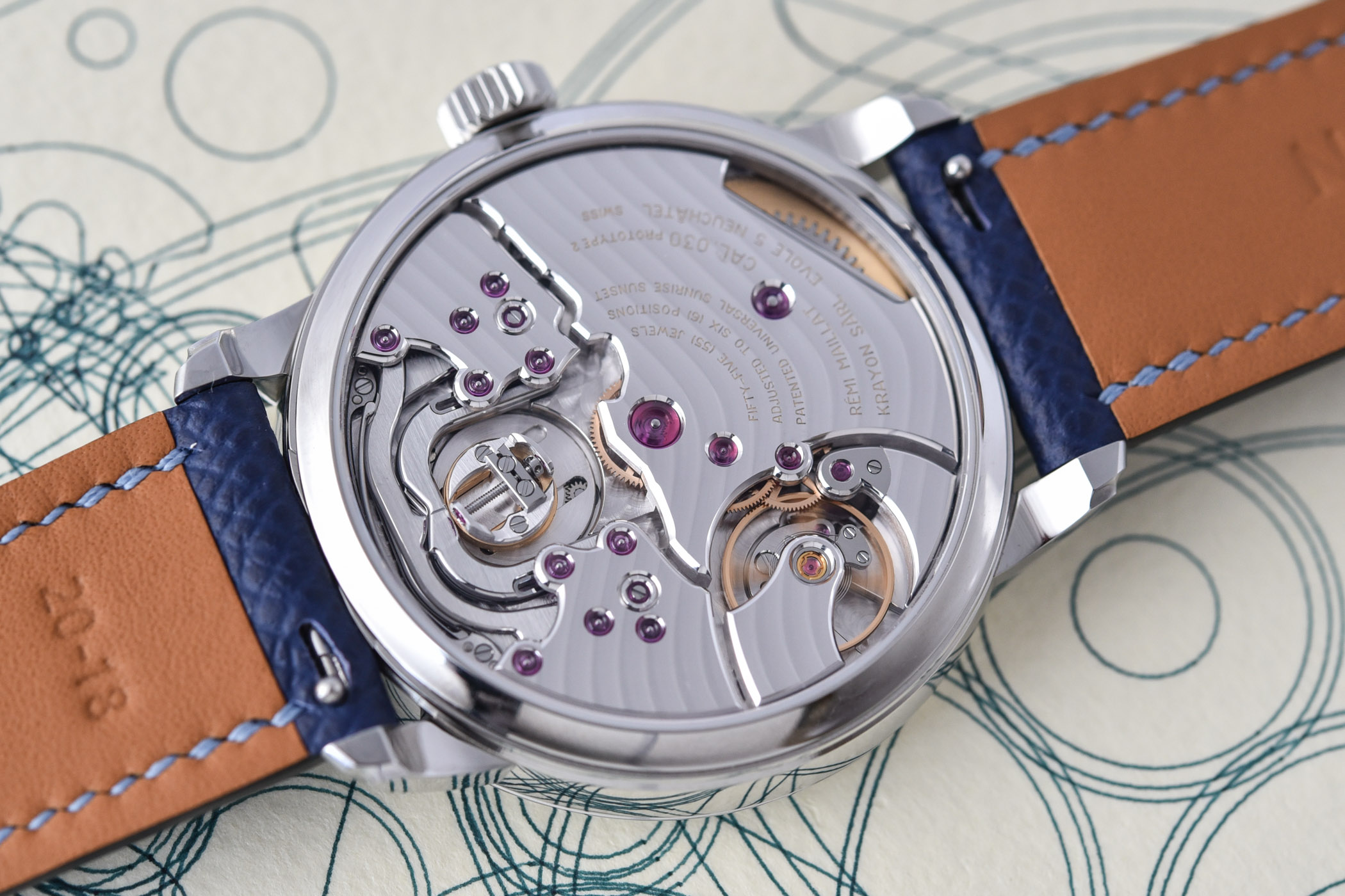 After deliveries of the Everywhere, I learned from the feedback of my customers. I realised that Everywhere is too focused on engineering. The immense complexity of the movement had forced me to create a very compact movement to make the watch wearable (42mm in diameter, 12mm in height), but I would have loved to show more of the core mechanisms and use more space for the finishings. From this knowledge, I wanted to create a more mature and balanced product. Anywhere was born, which keeps the core functionality of Everywhere and where location change is quite simply a watchmaker’s adjustment. Attention was focused on ergonomics, in the sense of wearability, legibility of the dials and indications, and also on the feelings of use by the crown, the feeling and the sound of the ratchet click while winding.