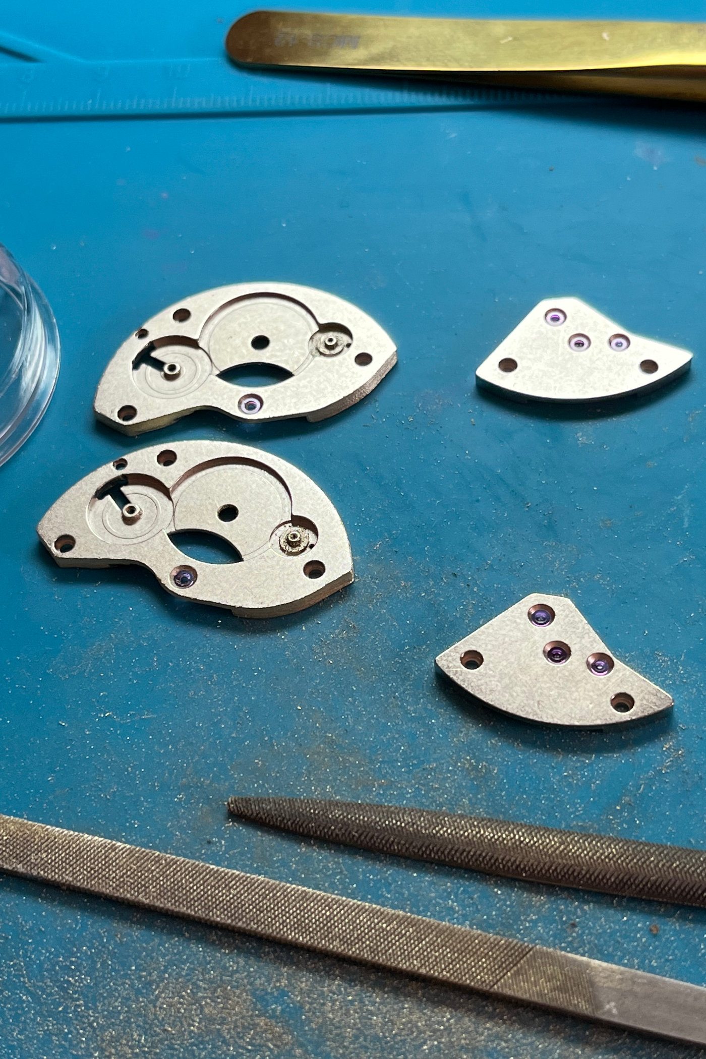 I try to do as much as I can myself. I work from home and have a very small workshop set up in my house. I try to do as much of the finishing myself, such as the decoration on the ratchet wheel, the anglage, electroplating etc. I also do the testing, the assembly and everything. And I’ve reshaped some of the bridges too. I am alone, so I do everything I can by myself.
