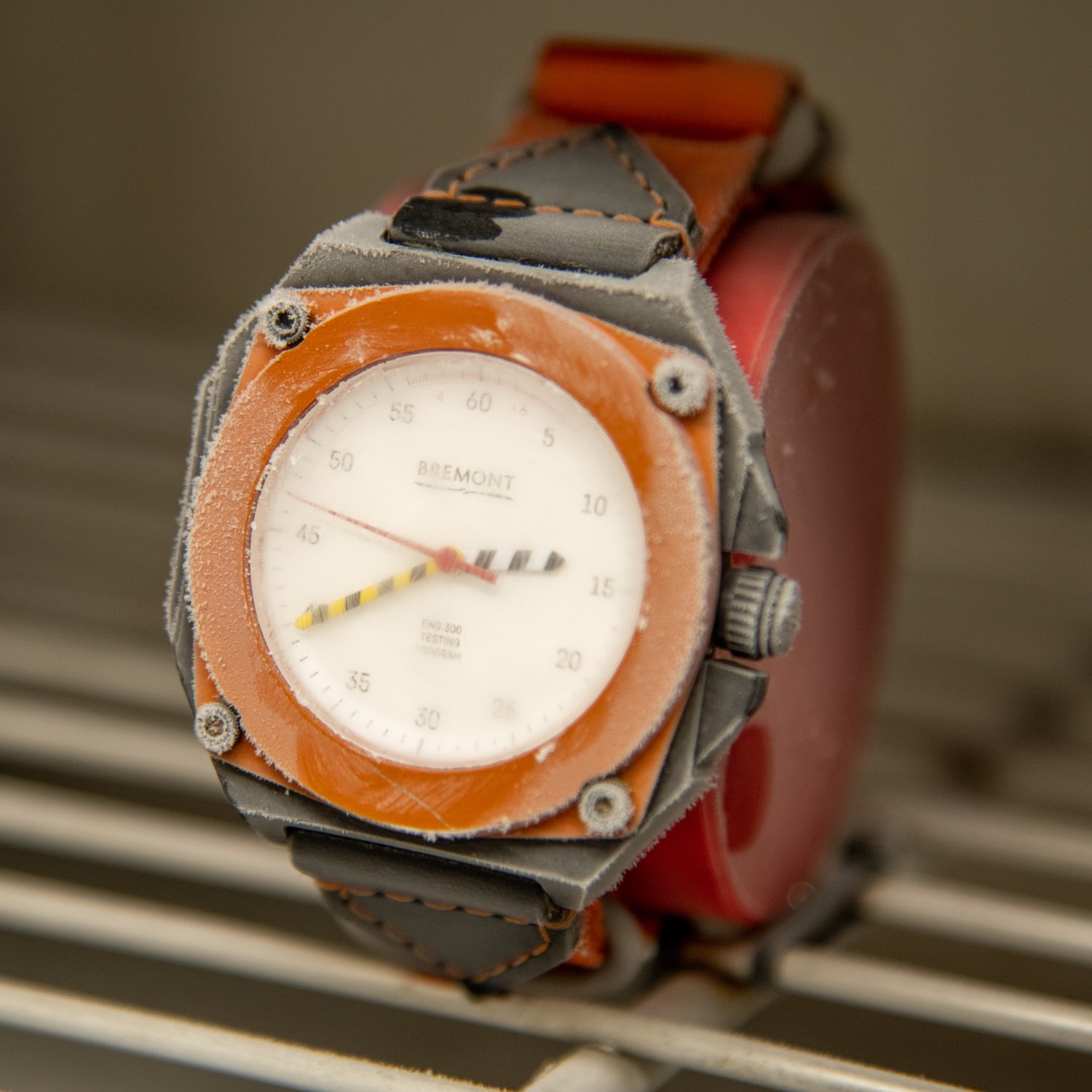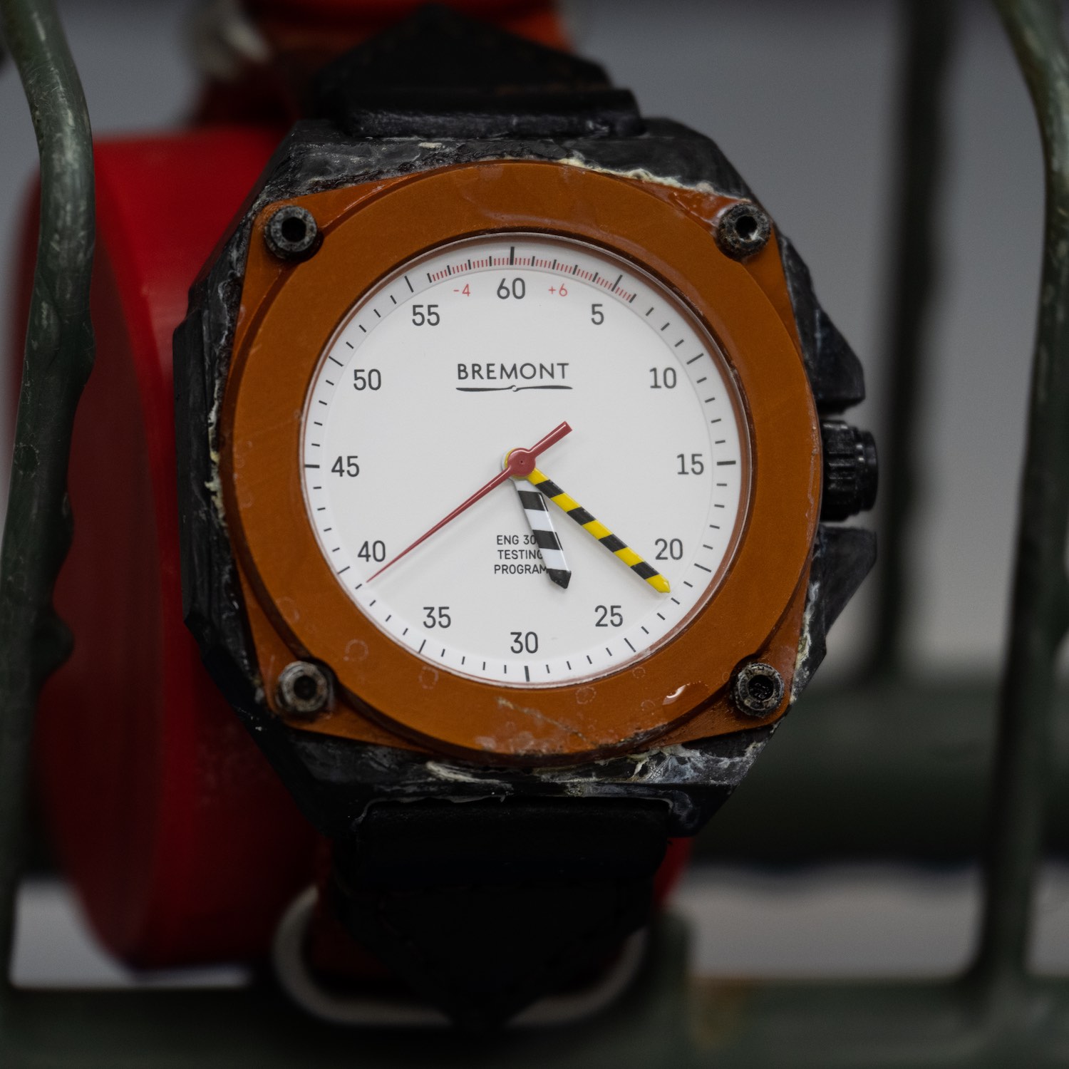 To undergo and stand a chance of surviving the trials, Bremont developed a functional, minimalist case for the movement and fitted it with its patented anti-shock movement mount that could be affixed to the cockpit dashboard of a Martin-Baker live ejection simulator. Forged carbon fibre lugs were then added to attach the concept watch to the wrist of an ejection mannequin. The watch not only survived the harrowing ordeals but maintained impeccable time.