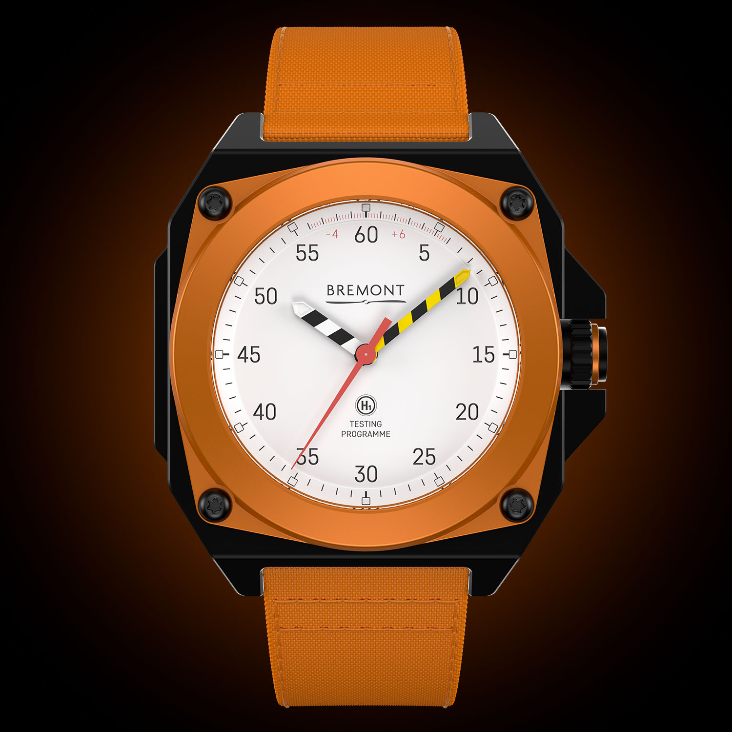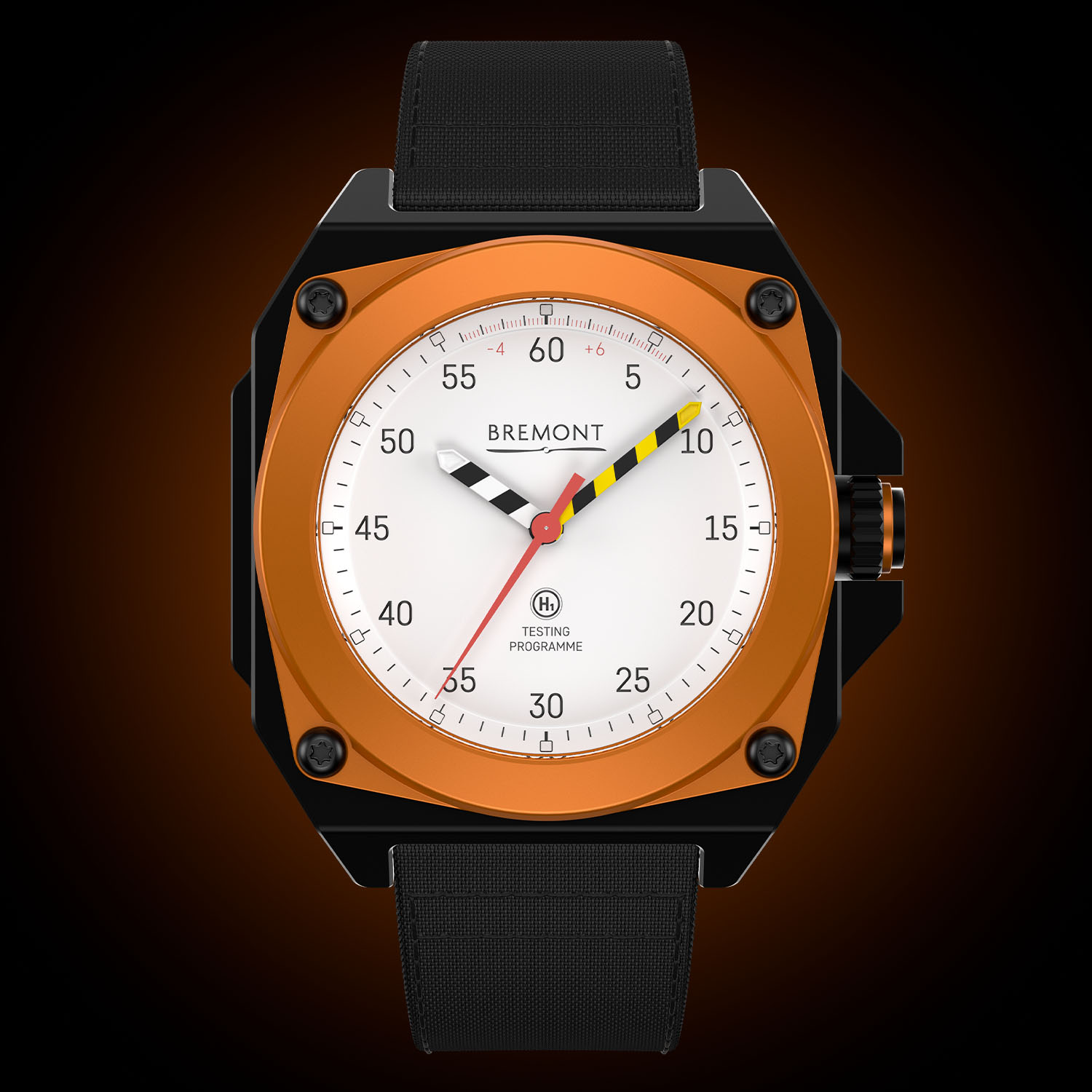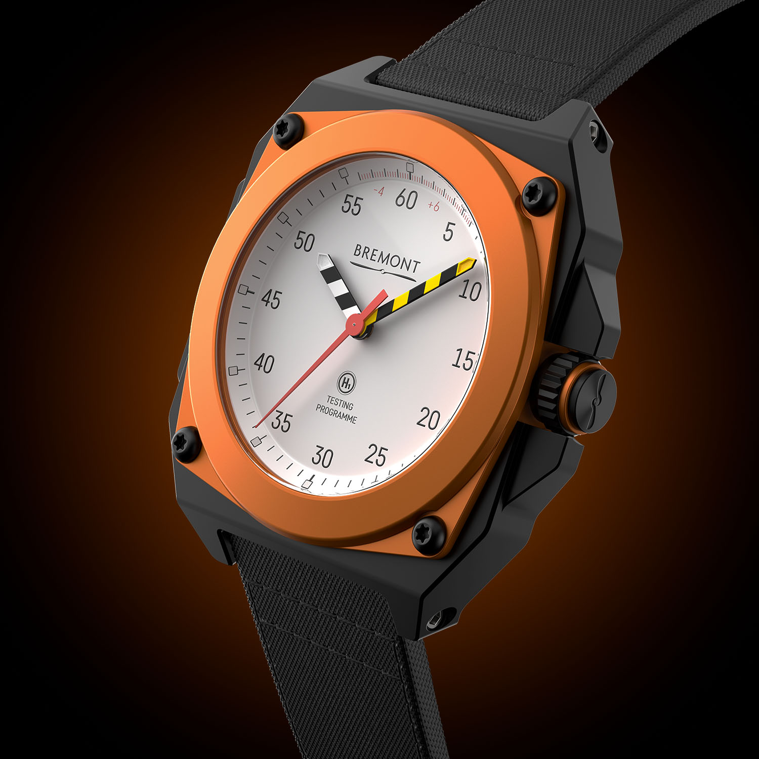 Having passed the test with flying colours, Bremont incorporated the movement in a grade 5 titanium case with a matte black protective carbon coating and an orange anodised aluminium bezel. In a radical design departure from other models in the brand’s collection, the MB Viper exudes an aggressive, angular, stealth bomber personality.