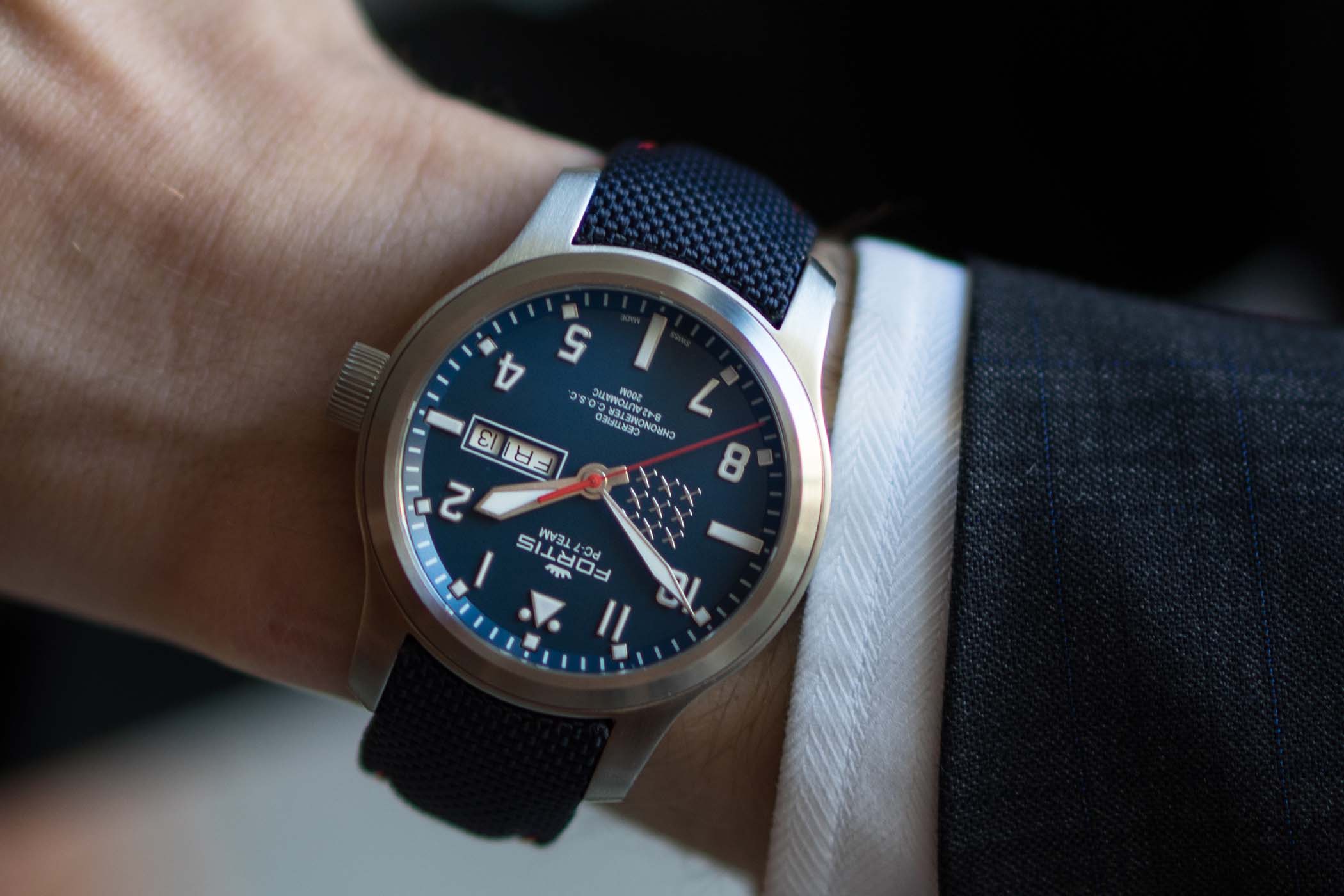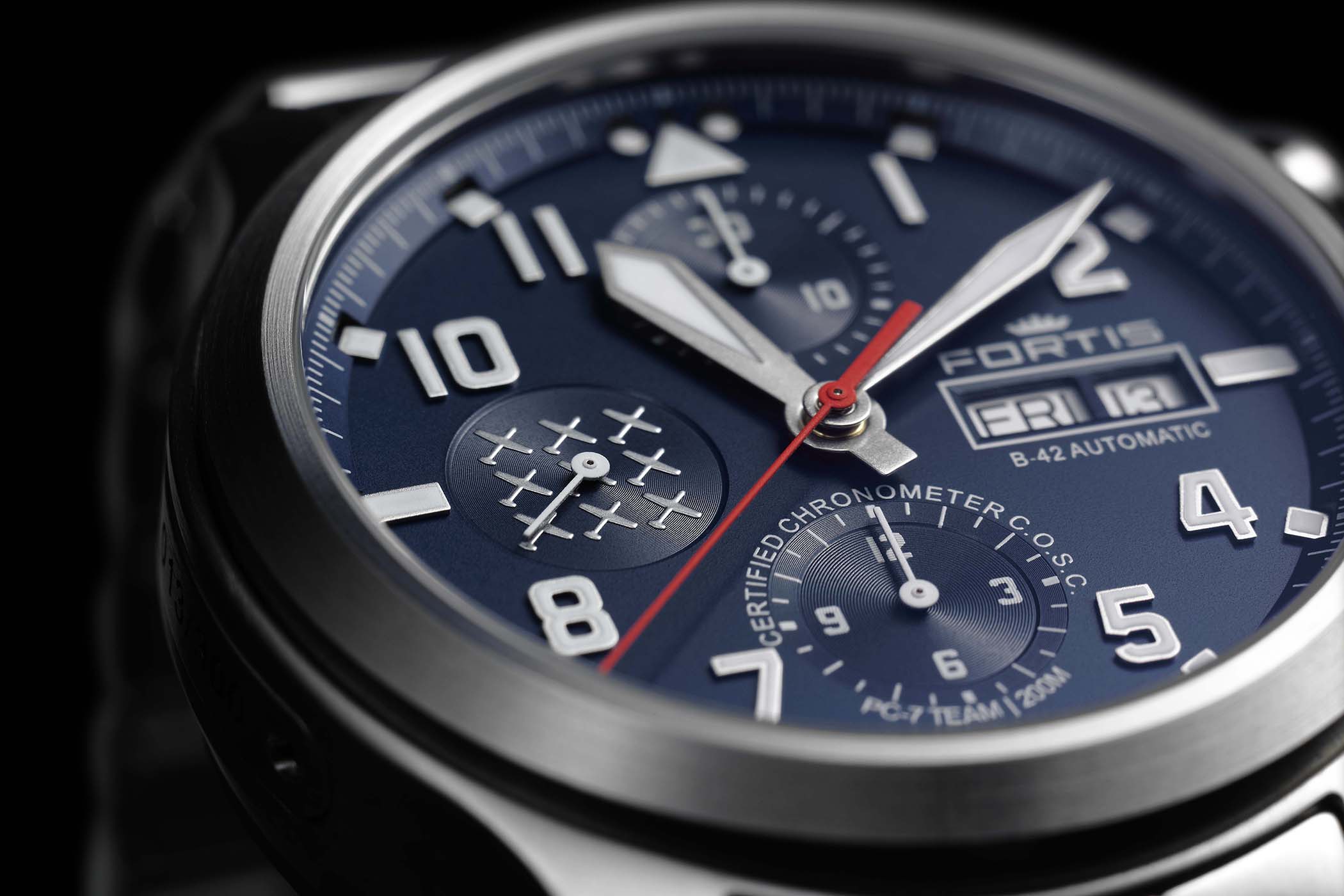 The Fortis PC-7 Team Chronograph is powered by a well-known and reliable workhorse, the automatic ETA Valjoux 7750. For this version, the Valjoux 7750 traditional 6-9-12 layout comes with a day-date display. The second model, the Day-Date, houses another ETA tried-and-tested movement, the automatic calibre 2836 (a day-date version of the ETA 2824). The chronometer precision of both movements is certified by the COSC.