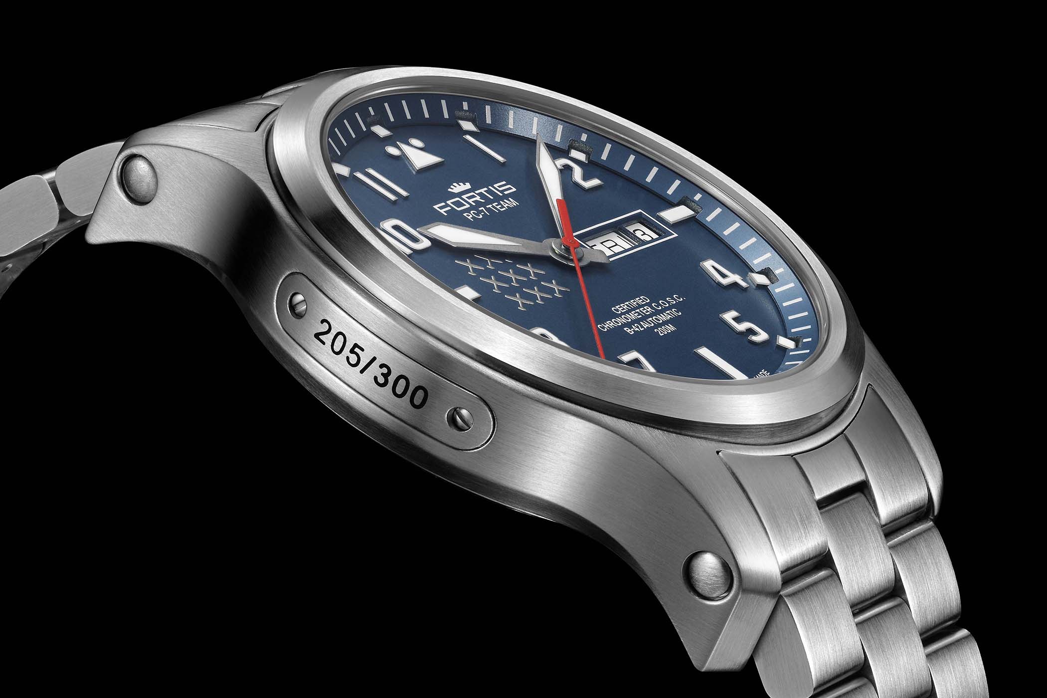 The watches are mounted on a steel three-link bracelet with an adjustable folding buckle. They are delivered with an additional blue Cordura (a high-performance fabric) strap with red stitching and a set of screwdrivers to swap bands. The special edition packaging also includes a travel pouch and the official PC-7 team 30th-anniversary patch.