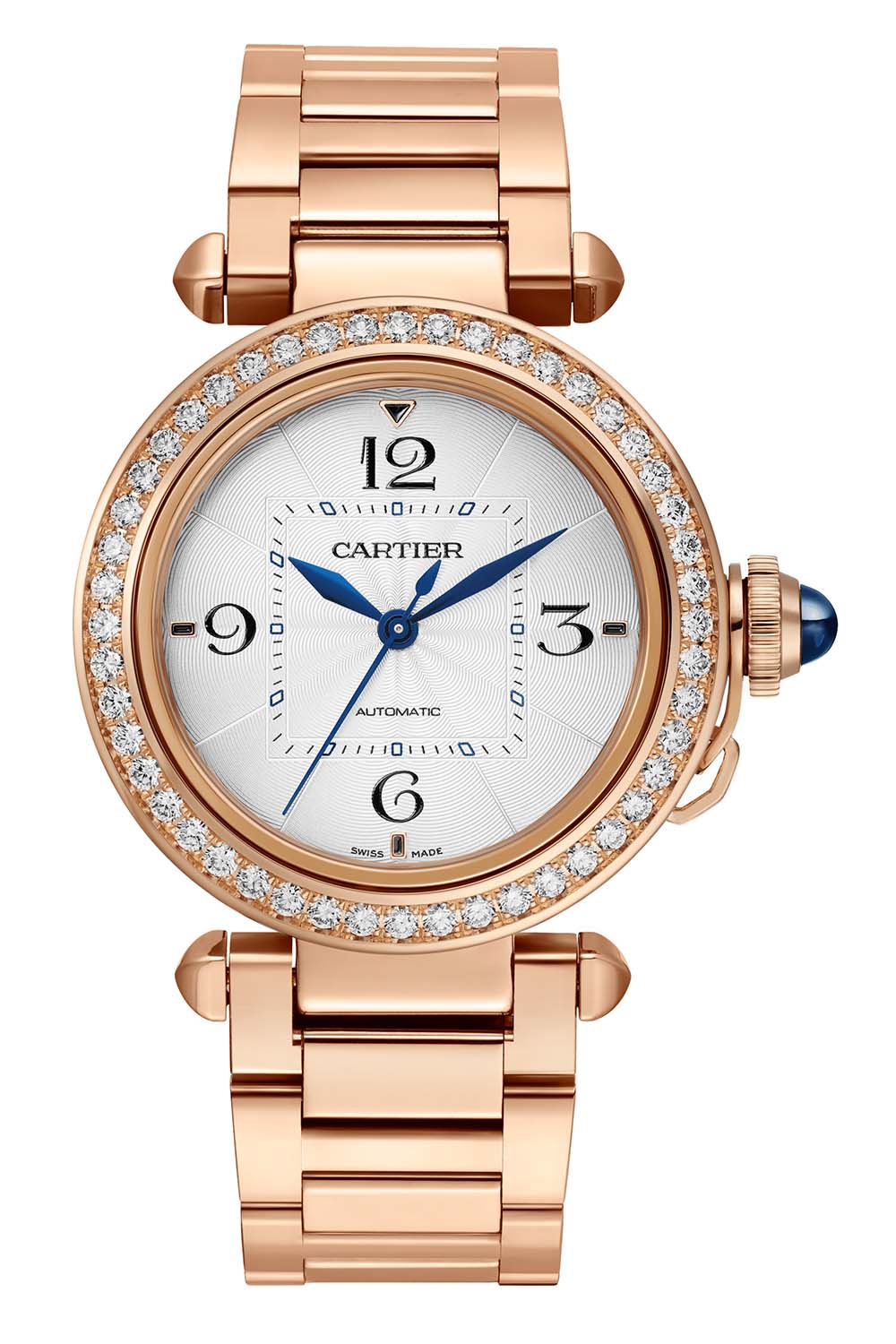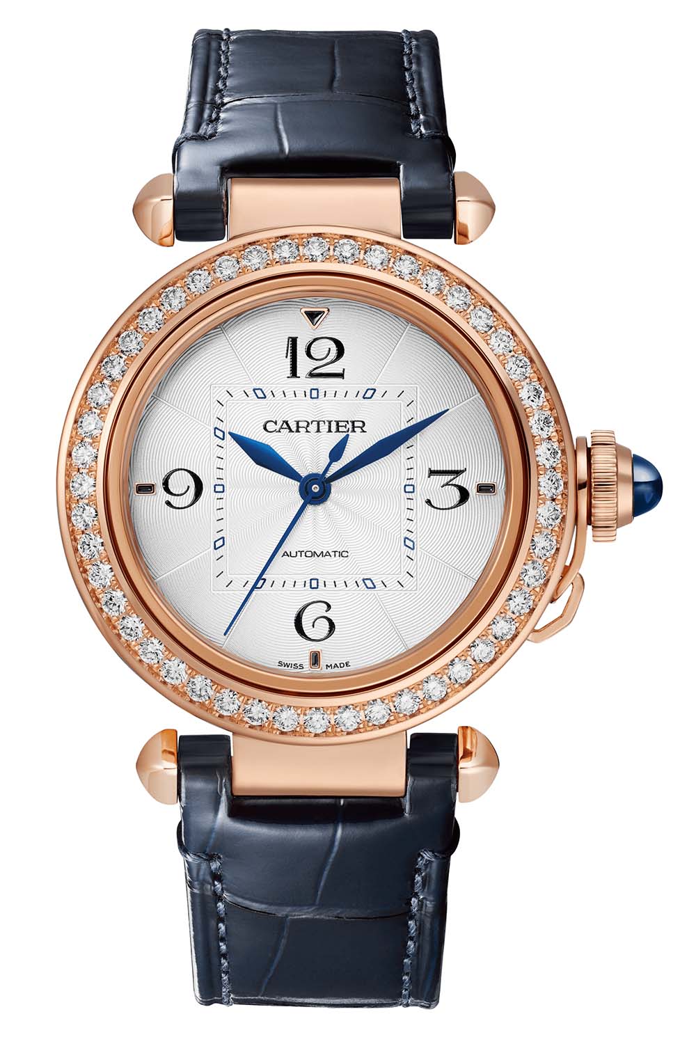 The mid-size version (see below), something usual for Cartier, is 35mm in diameter and 9.37mm in height. This mid-size model is available in stainless steel, in 18k pink gold with or without diamonds on the bezel.