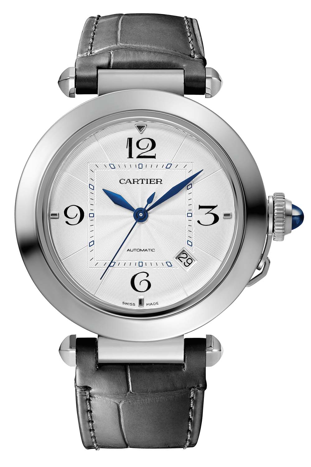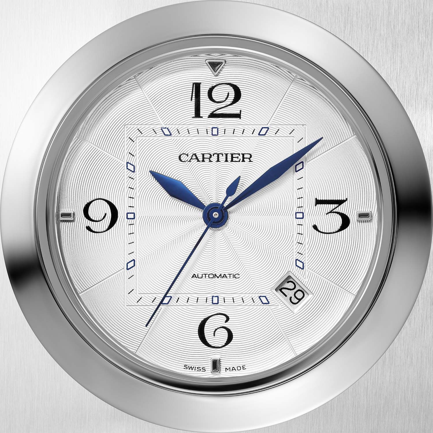 As for the dial, the new Pasha de Cartier retains the classic “square inside a circle” design. The dial is pure Cartier, with a stamped guilloché pattern in a silvery-white dial, with signature Pasha Arabic numerals and blued hands. The square filigree rail-track gives a dynamic look to this classic dial. Note that the 41mm features a date while the mid-size model has a no-date display.