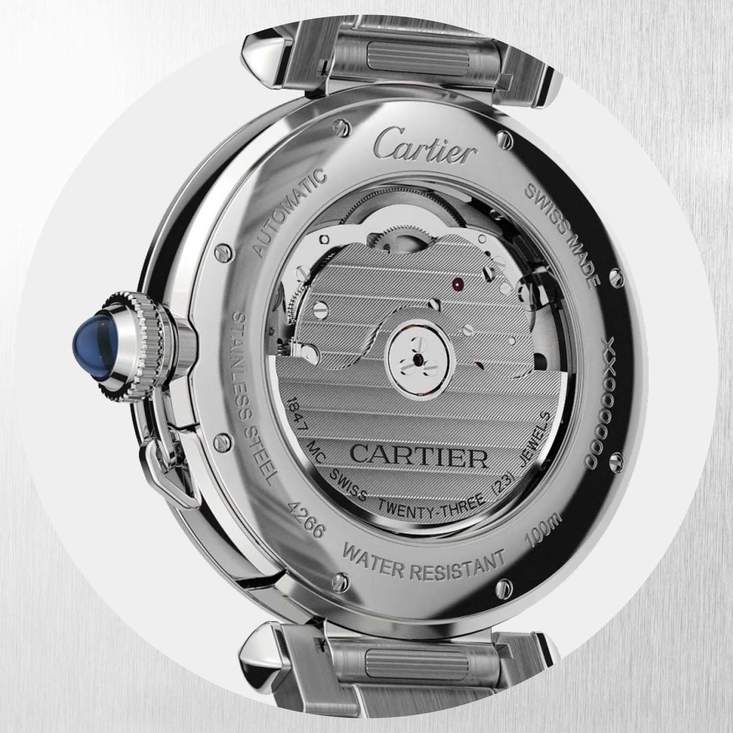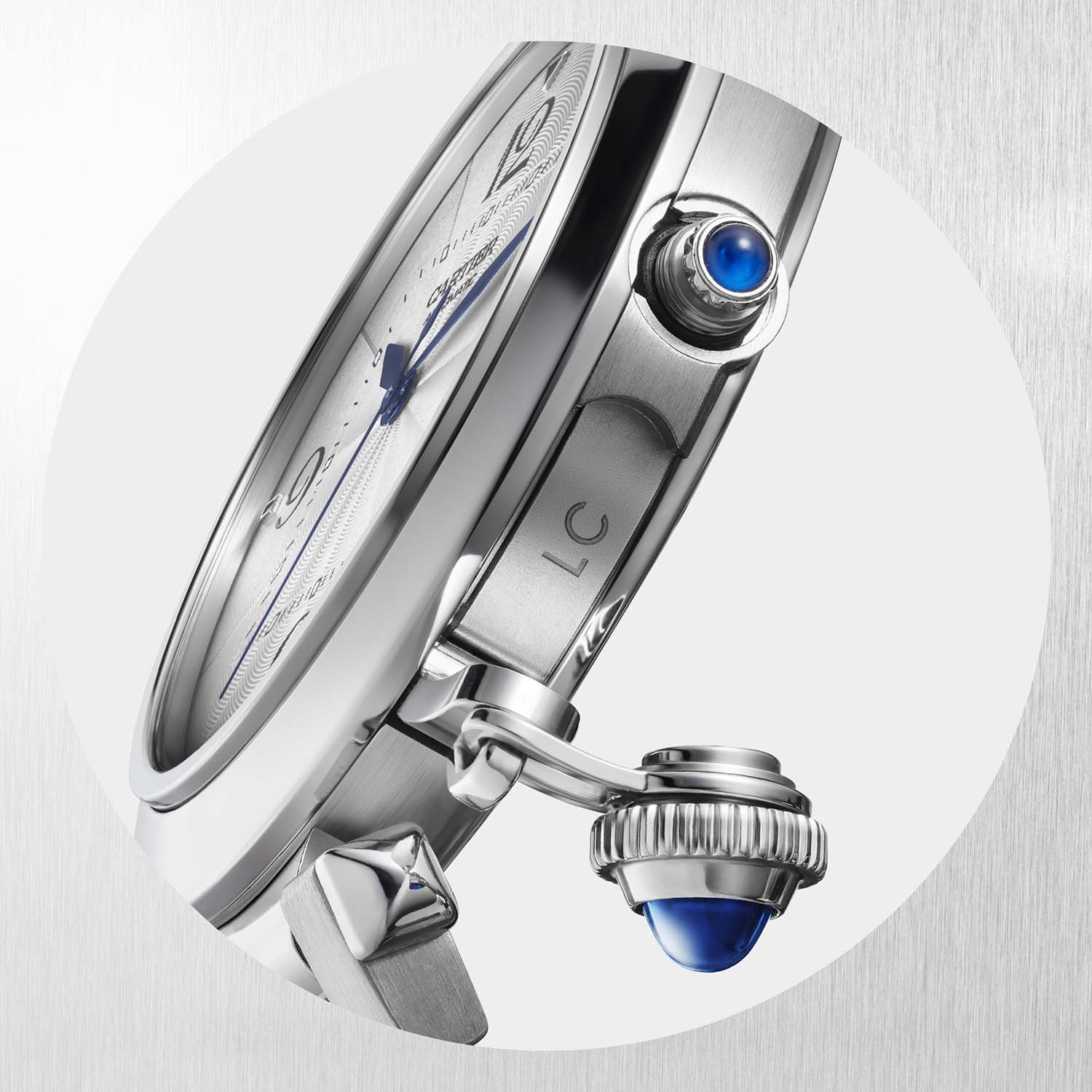 Just like the revamped Santos de Cartier unveiled in 2018, the brand adds multiple options and clever systems for the straps and bracelets. The Pasha de Cartier large model in stainless steel can, for instance, be ordered with an alligator strap or with a combination of leather straps and stainless steel bracelets. The latter is equipped with a “QuickSwitch” system to easily remove it, as well as the “SmartLink” size adjustment system to adjust the size of the bracelet without tools.